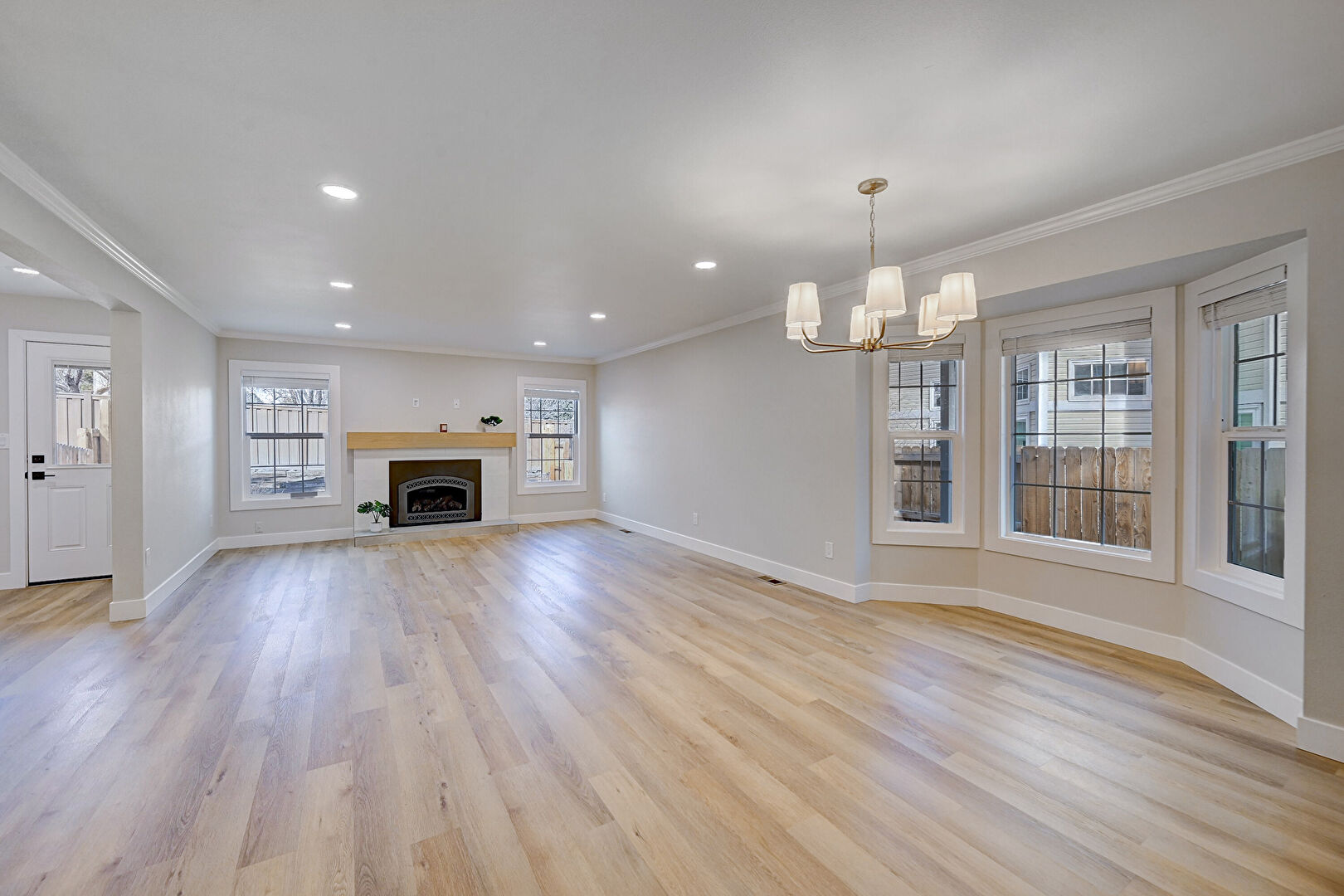 Baseboards Wall, Crown Molding, Drywall, Fireplace, Natural Light, Notable Chandelier, Recessed Lighting, Stairs, Vent, Wood Finish Floor, Baseboards Wall, Recessed Lighting, Vent