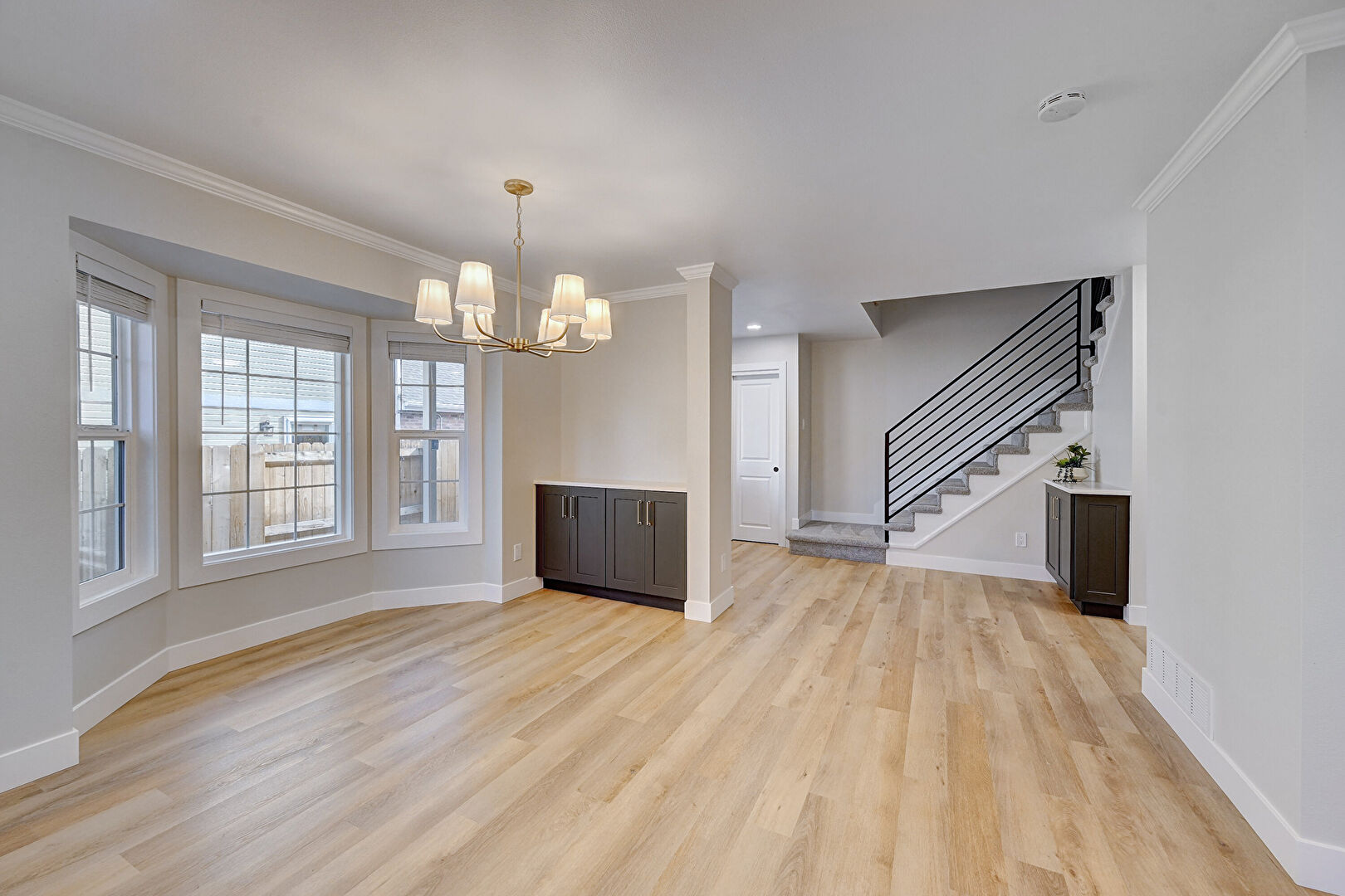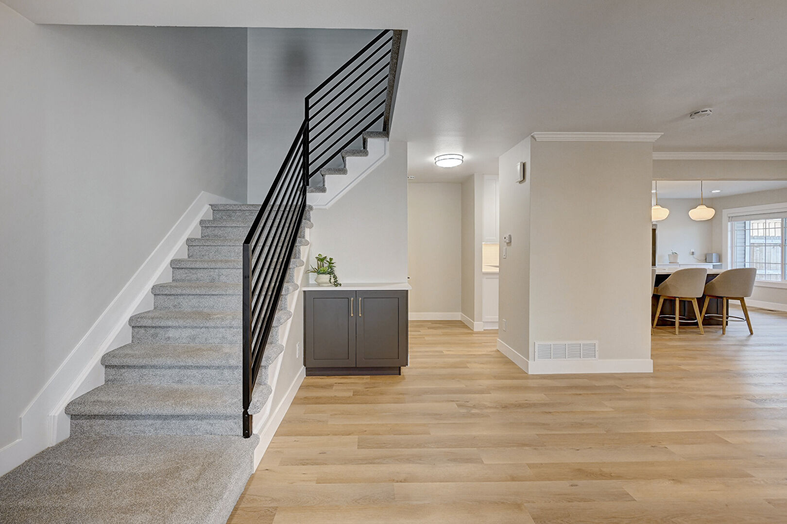 Baseboards Wall, Crown Molding, Drywall, Natural Light, Vent, Wood Finish Floor, Stairs