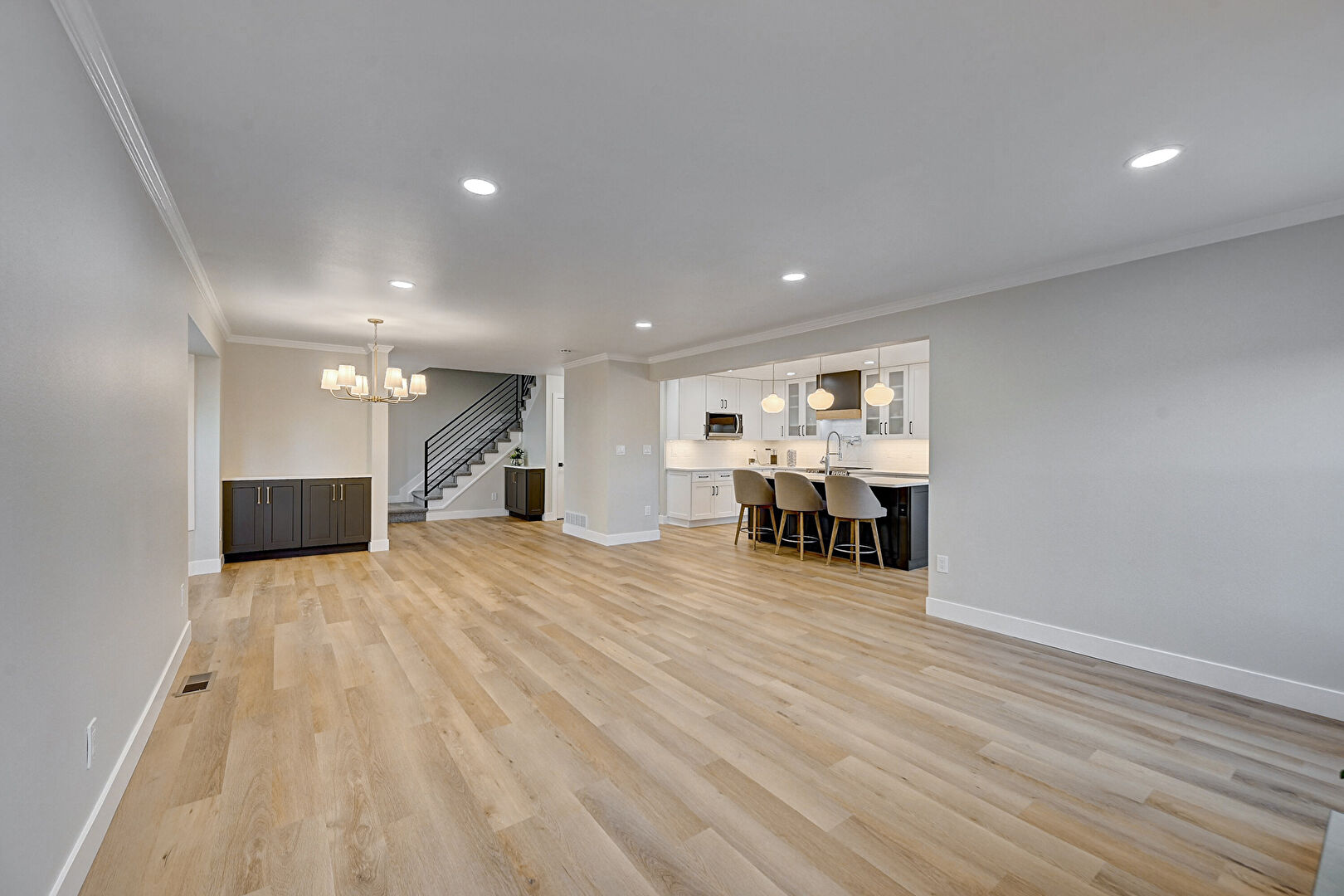 Baseboards Wall, Crown Molding, Drywall, Notable Chandelier, Recessed Lighting, Smoke Carbon Monoxide Detector, Stairs, Vent, Wood Finish Floor, Natural Light