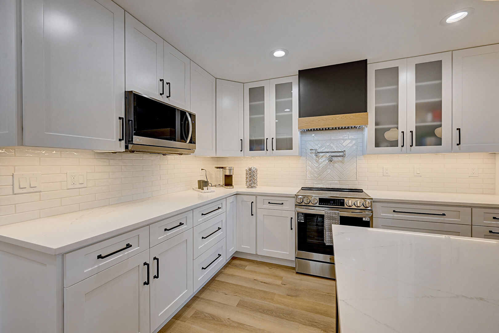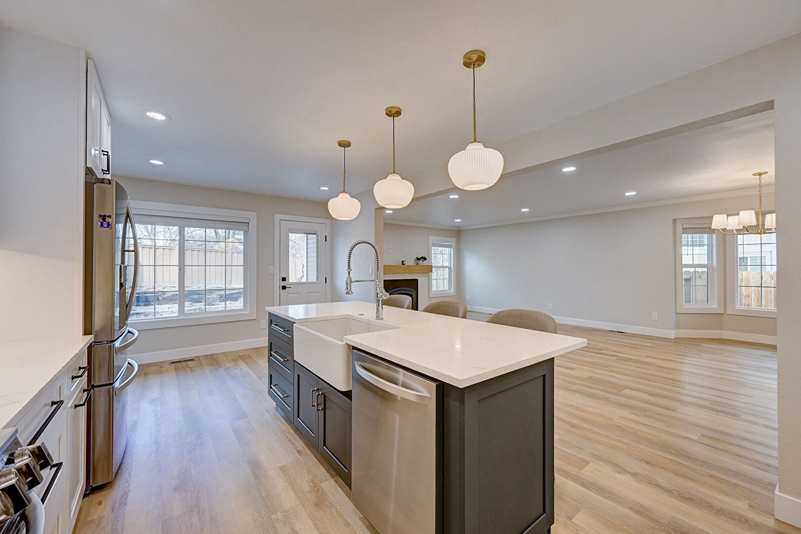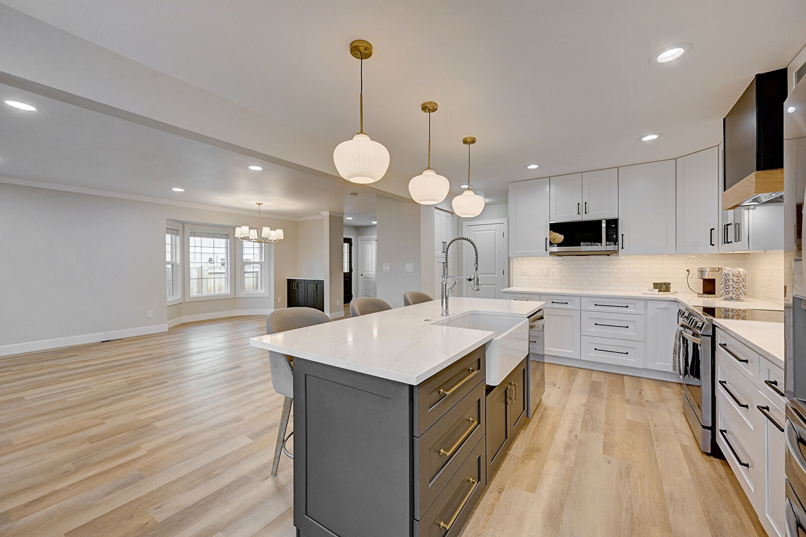 Baseboards Wall, Black Cabinets, Crown Molding, Dark Brown Cabinets, Drywall, Fireplace, Glass Insert Cabinets, Gray Cabinets, Kitchen Bar, Kitchen Island, L Shaped Kitchen, Natural Light, Notable Chandelier, Opens To Living Area, Pendant Lighting, Pot Filler, Recessed Lighting, Shaker Cabinets, Stone Countertops, Vent, Wood Finish Floor, Baseboards Wall, Natural Light, Wood Finish Floor