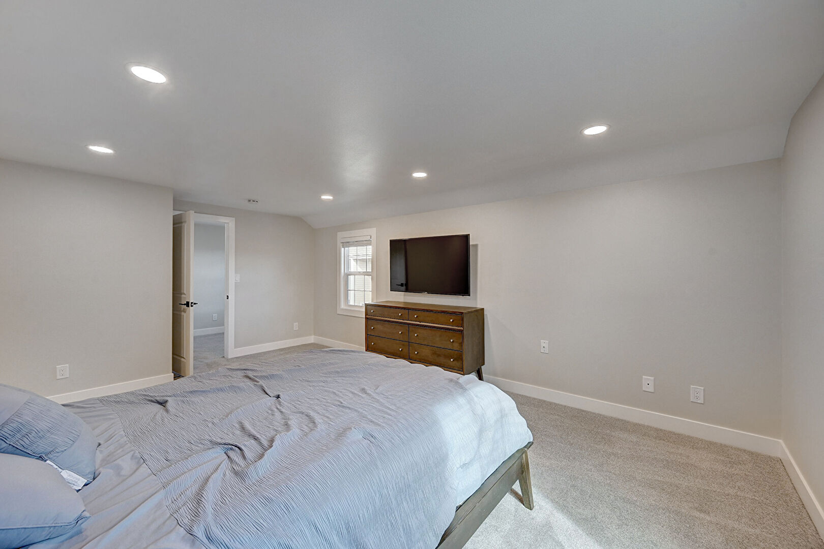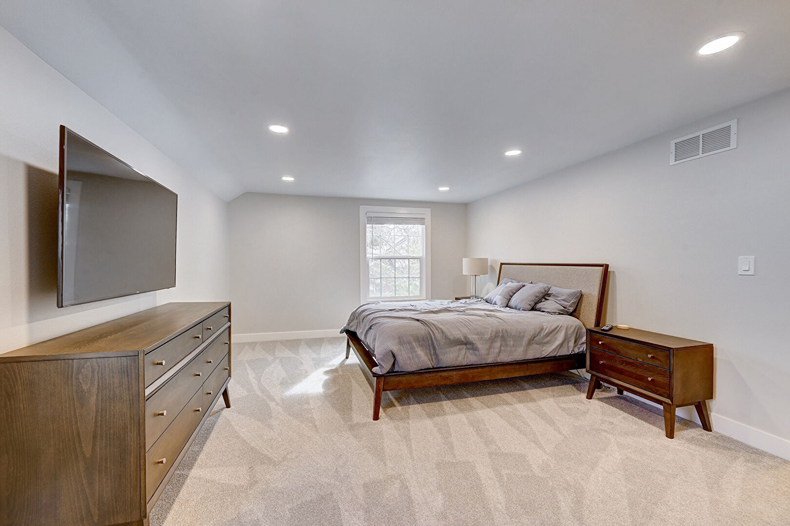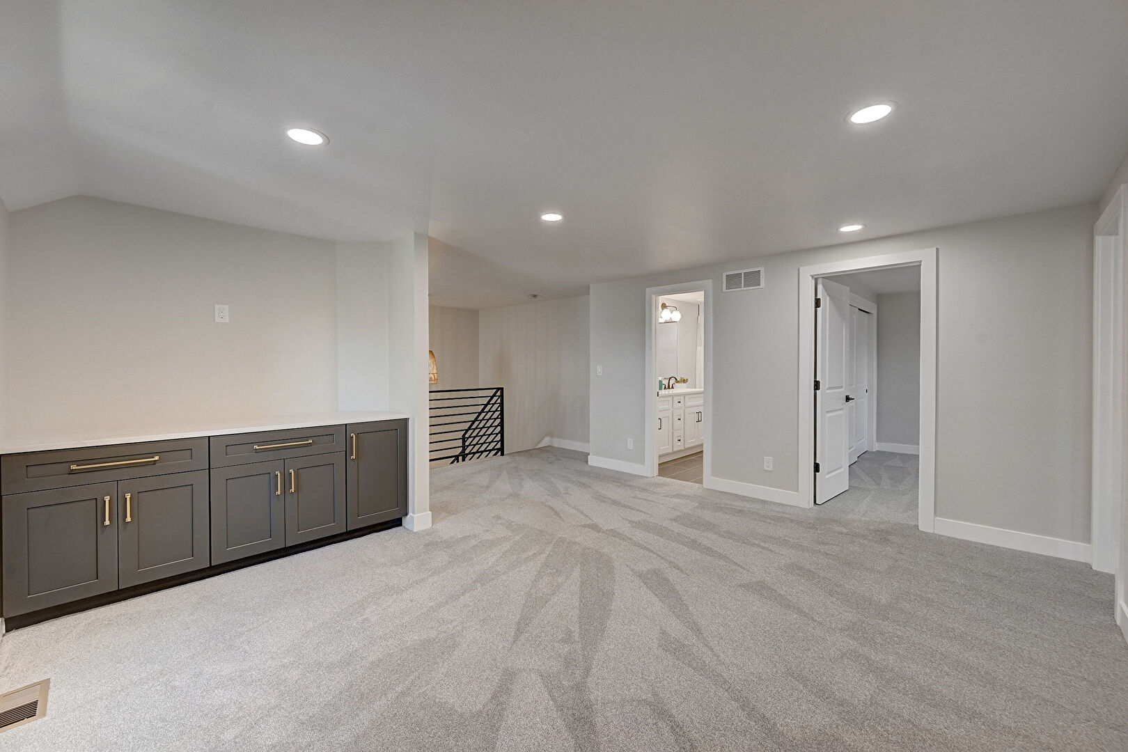 Baseboards Wall, Carpet, Drywall, Natural Light, Recessed Lighting, Vaulted Ceiling, Vent, Carpet, Drywall