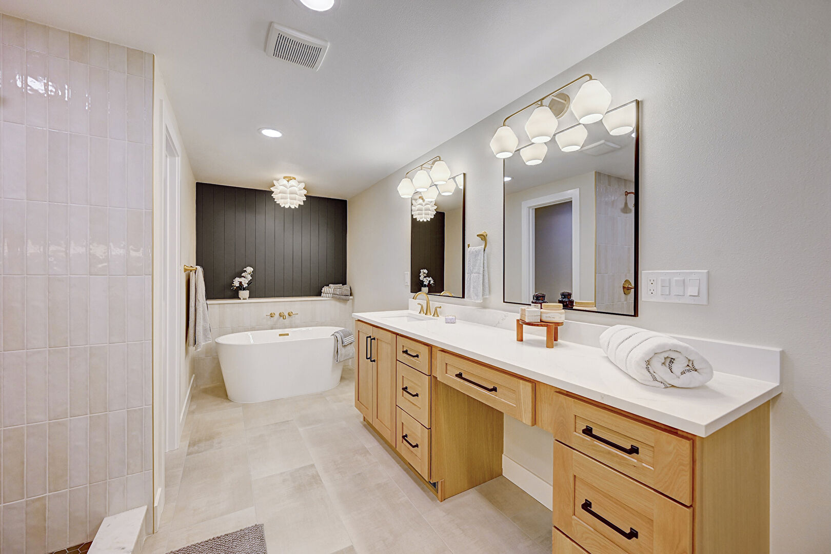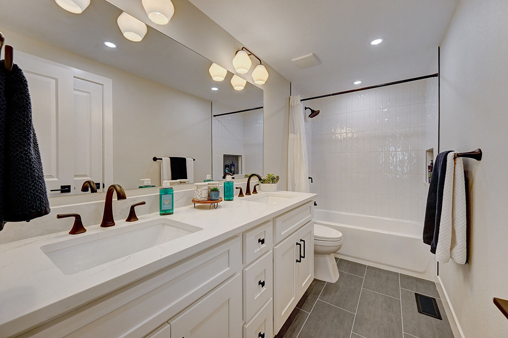 Baseboards Wall, Combined Bath Shower, Drywall, Full Bathroom, Recessed Lighting, Tile Floor, Vent, Double Vanity