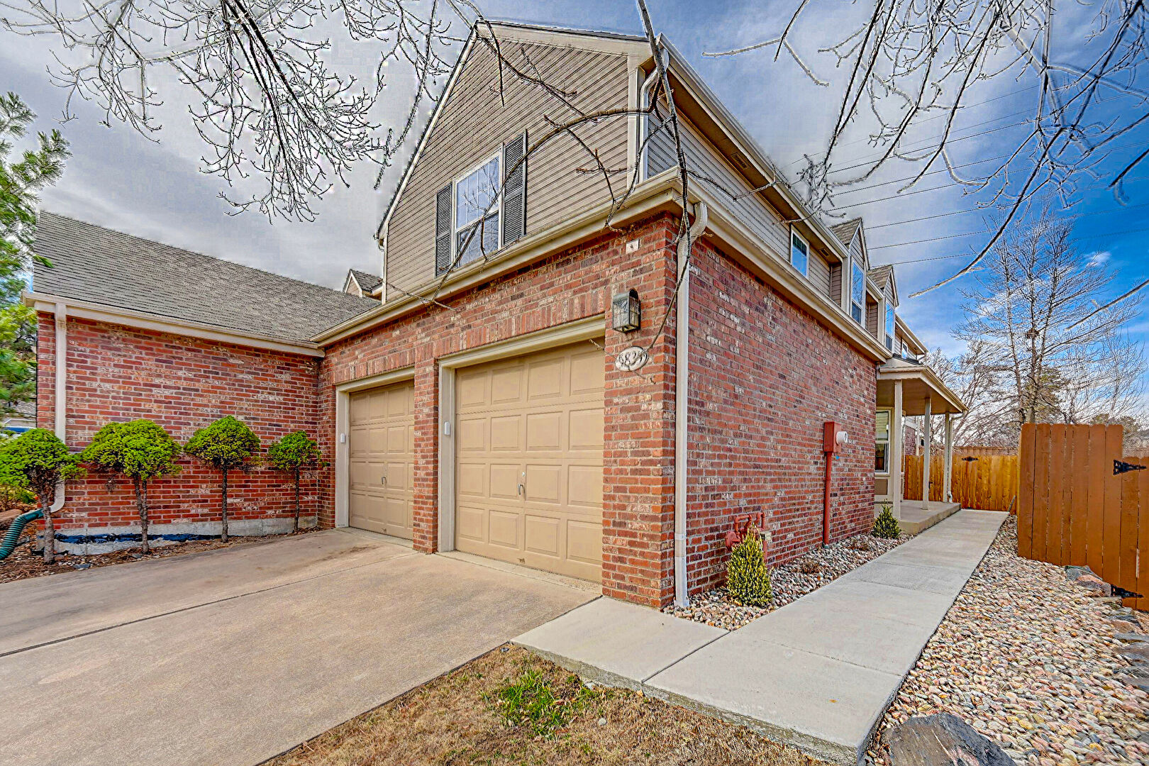 Brick Siding, Built In Garage, Concrete Foundation, Downspout, Driveway, Gutters, Horizontal Siding, Fence