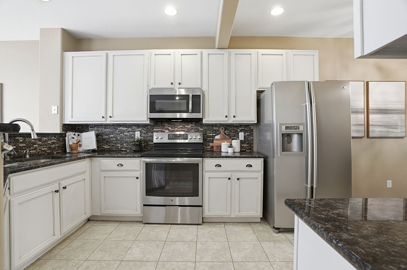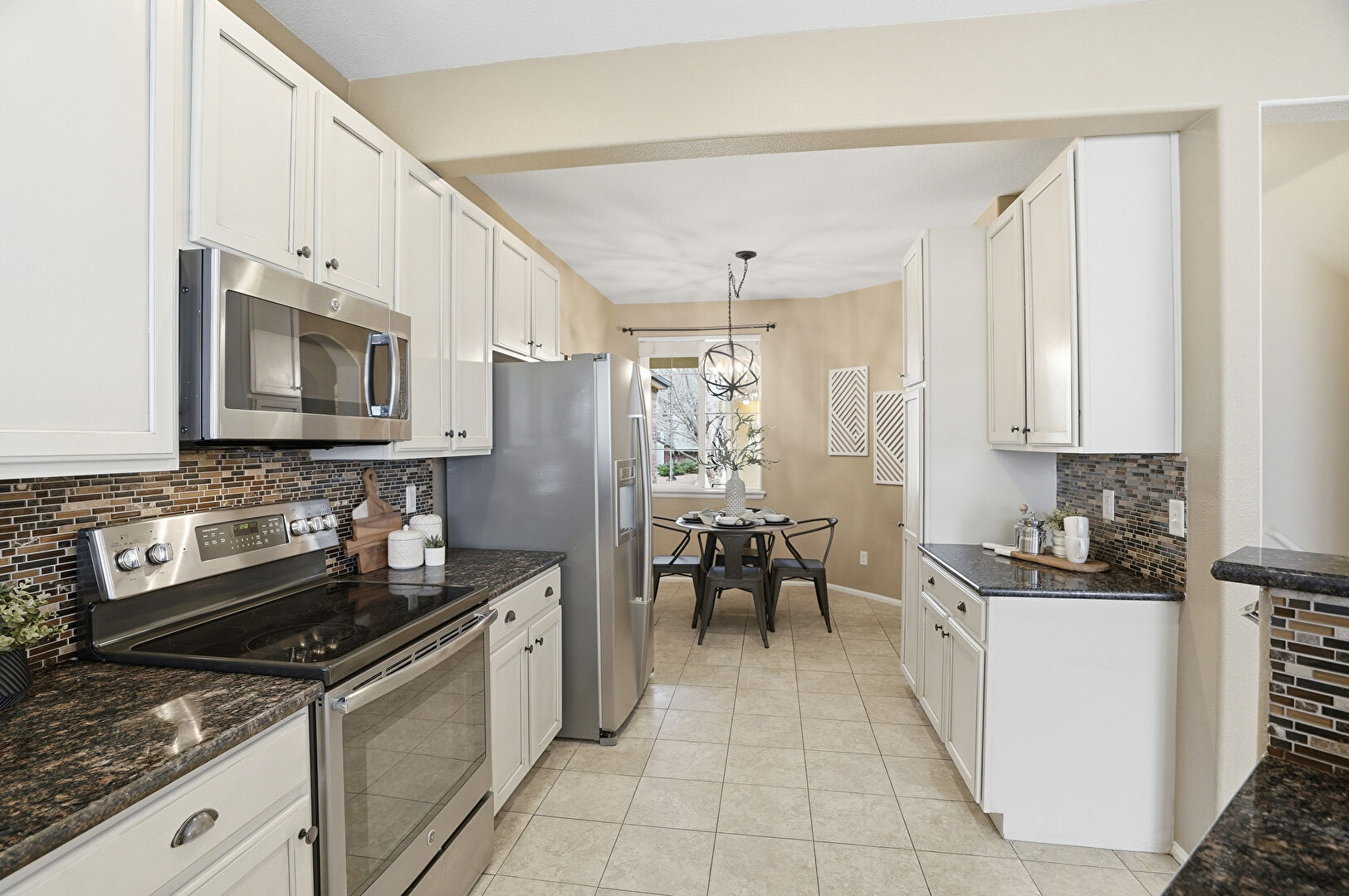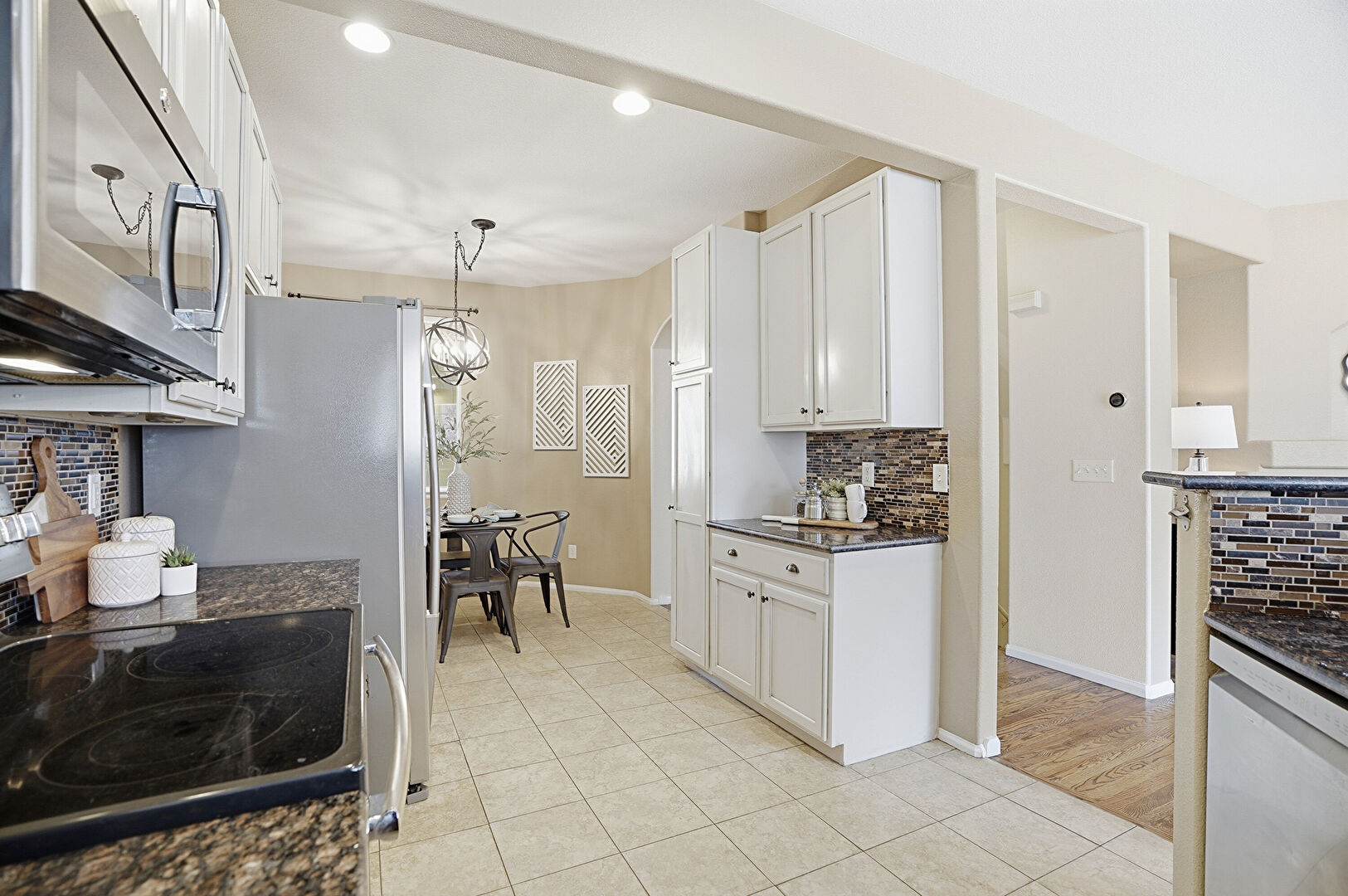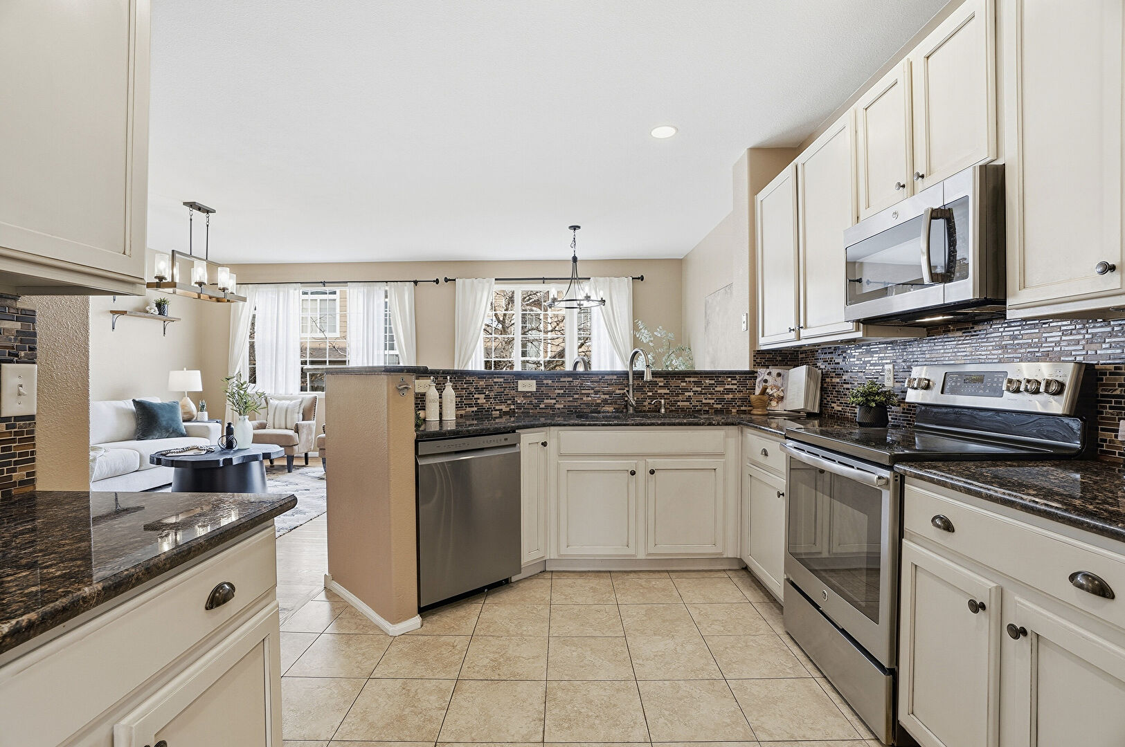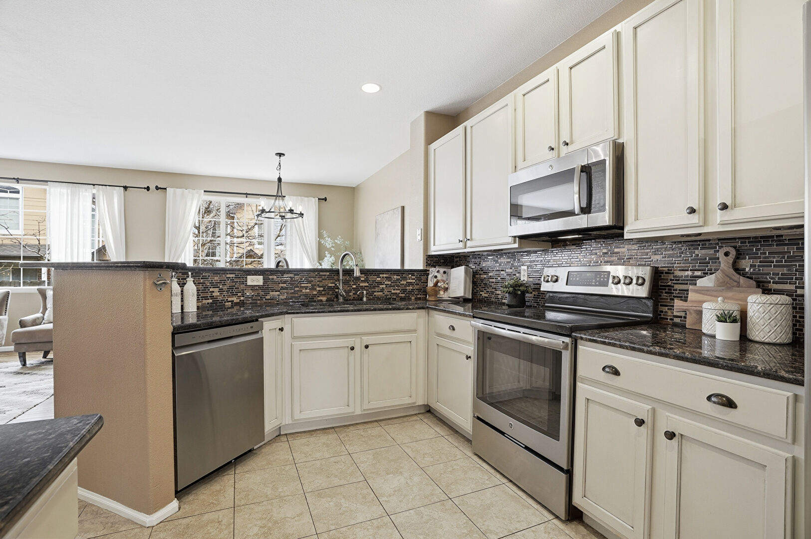 Baseboards Wall, Beamed Ceiling, Cream Cabinets, Drywall, Kitchen Bar, Kitchen Peninsula, Natural Light, Notable Chandelier, Pass Through Window, Pendant Lighting, Recessed Lighting, Shaker Cabinets, Stone Countertops, Tile Floor, Vent, Wood Finish Floor, Notable Chandelier, Pendant Lighting, Tile Floor, Wood Finish Floor