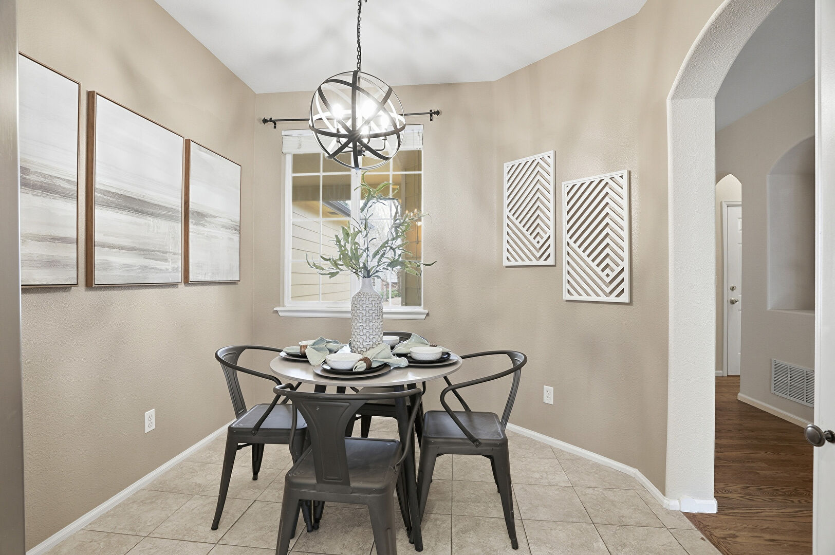 Arched Walkways, Baseboards Wall, Drywall, Natural Light, Notable Chandelier, Recessed Lighting, Stairs, Tile Floor, U Shaped Kitchen, Vent, Wood Finish Floor, Baseboards Wall, Drywall, Notable Chandelier, Recessed Lighting