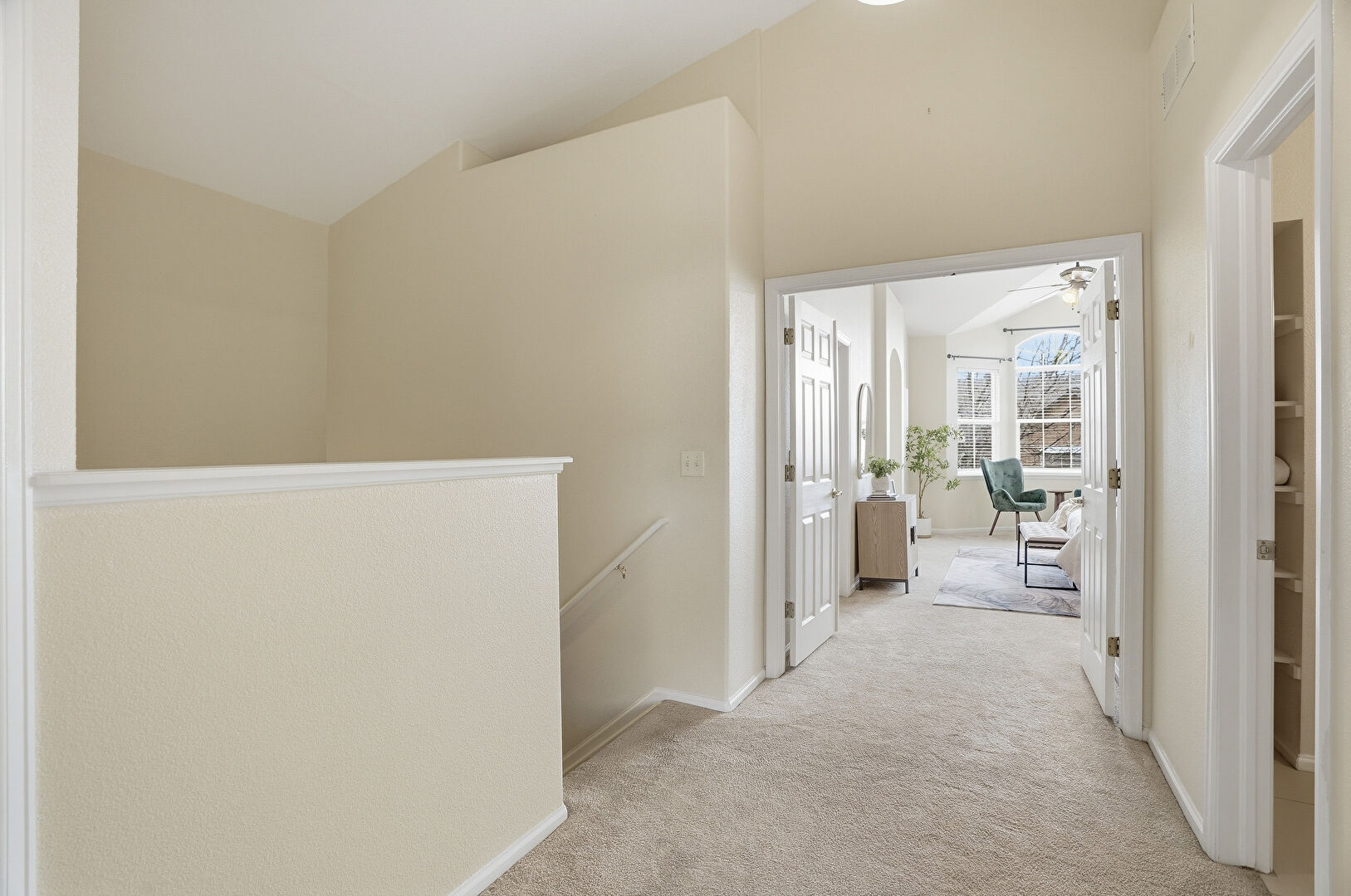 Carpet, Drywall, High Ceiling, Natural Light, Upstairs Landing, Vaulted Ceiling, Vent, Baseboards Wall