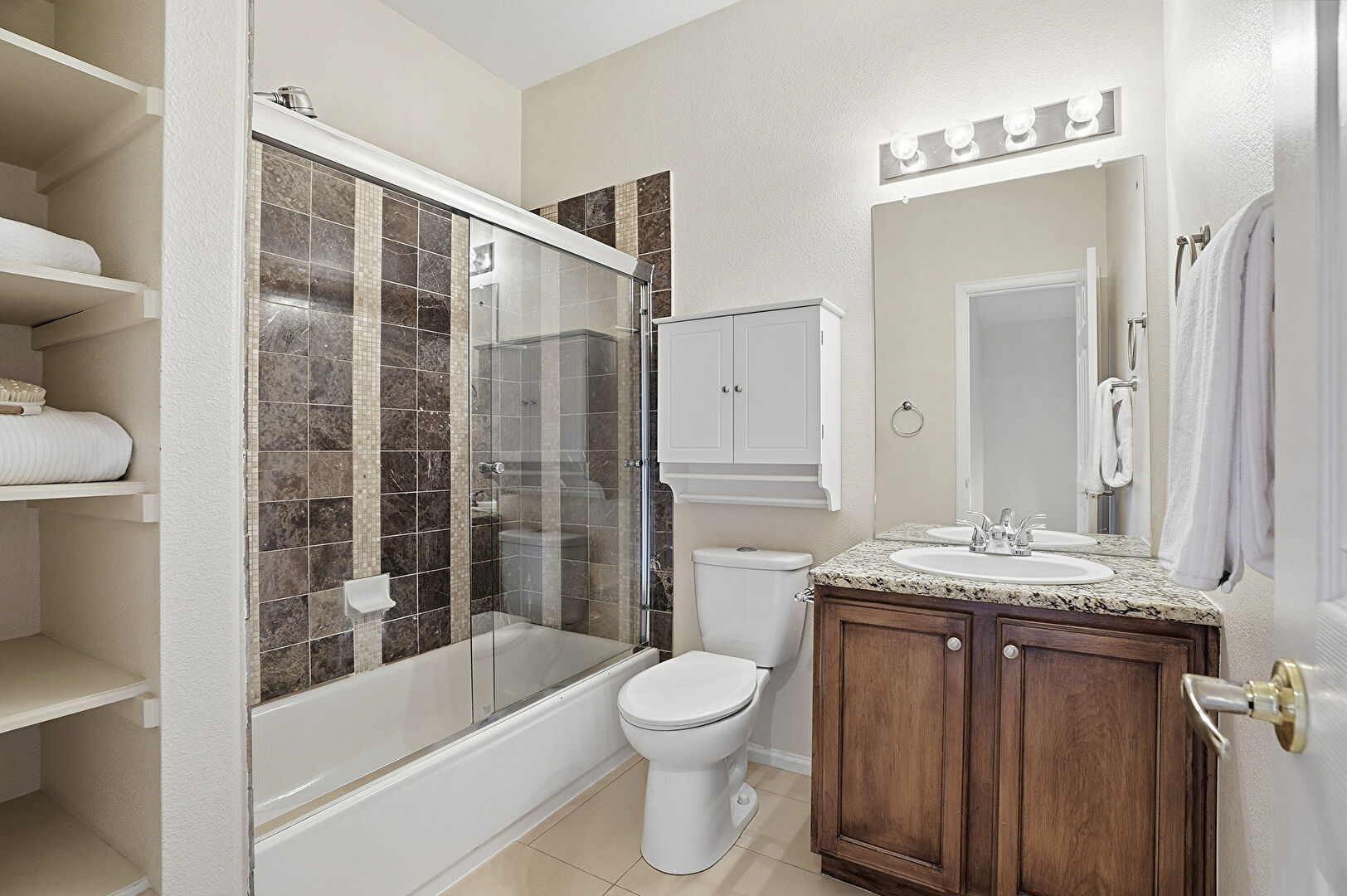Baseboards Wall, Closet, Combined Bath Shower, Drywall, Tile Floor, Vanity, Full Bathroom