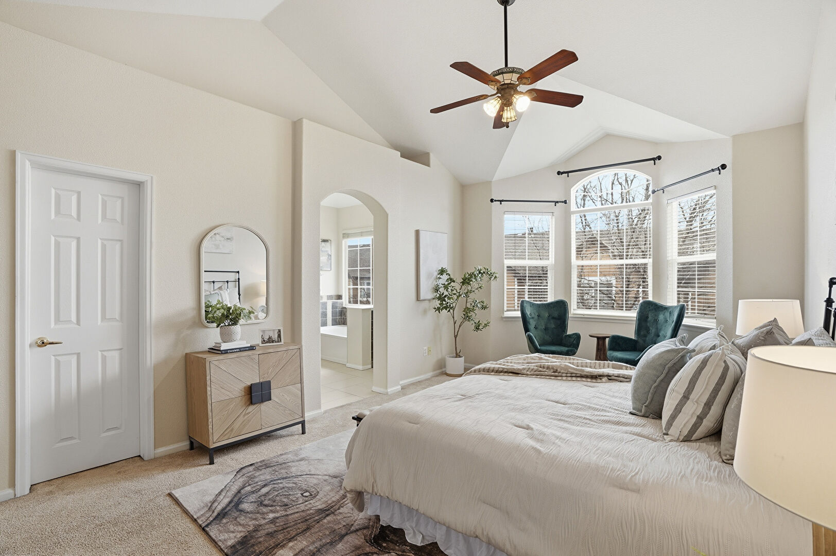 Arched Walkways, Baseboards Wall, Carpet, Cathedral Ceiling, Ceiling Fan, Drywall, High Ceiling, Natural Light, Vaulted Ceiling, Carpet, Ensuite Bathroom, Vaulted Ceiling