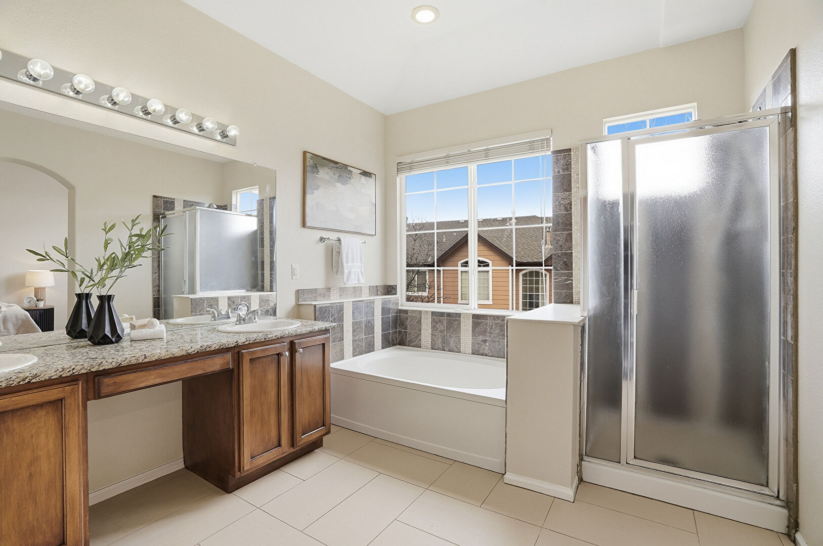 Baseboards Wall, Double Vanity, Drywall, Ensuite Bathroom, Full Bathroom, Natural Light, Recessed Lighting, Tile Floor, Water Closet, Baseboards Wall, Natural Light