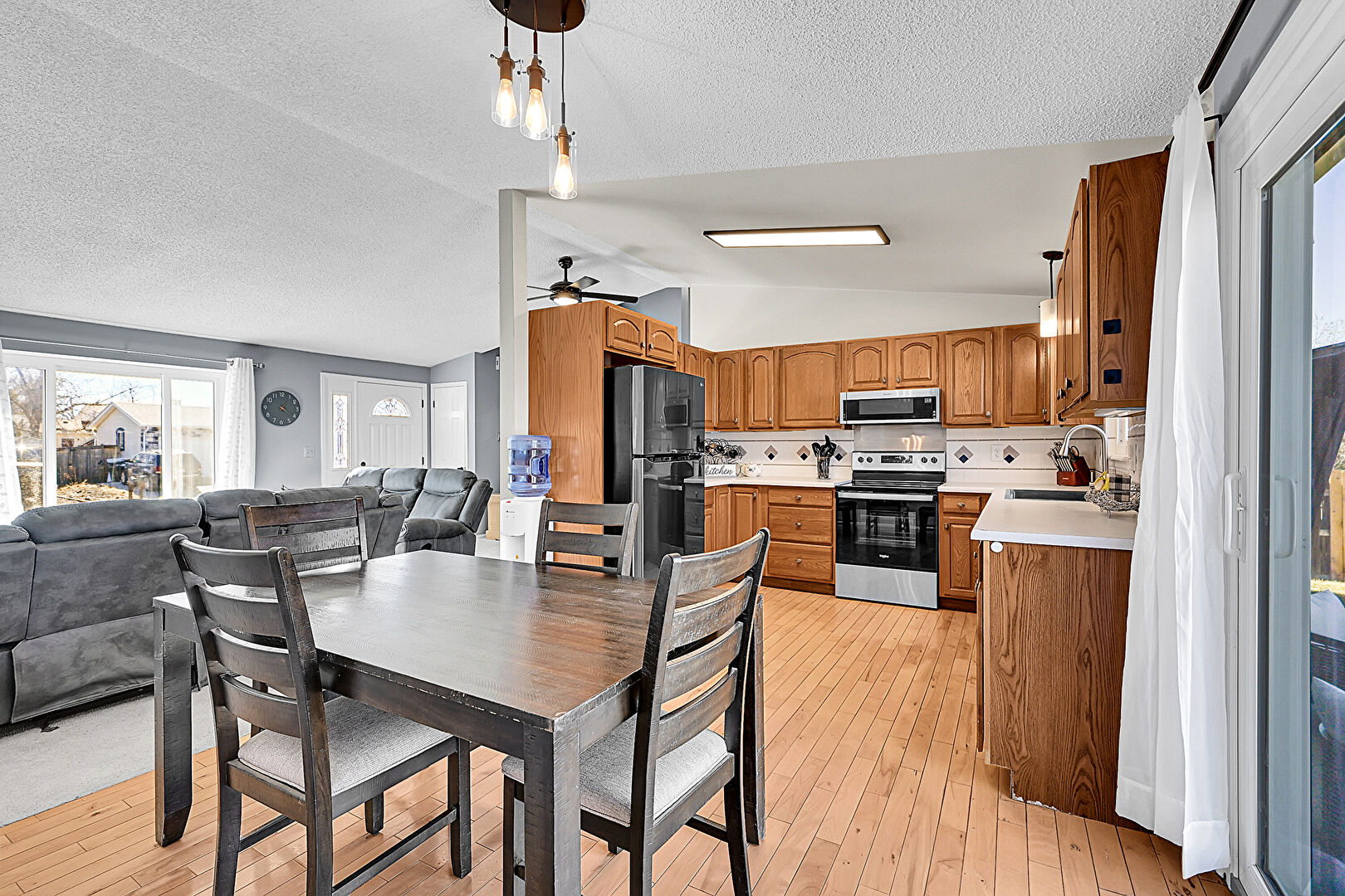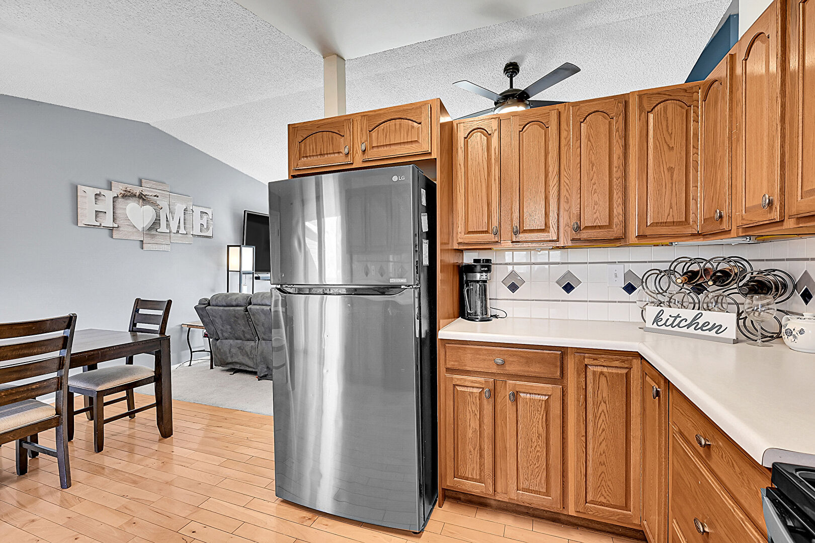 Baseboards Wall, Ceiling Fan, Drywall, Natural Light, Space Heater, Stairs, Textured Ceiling, U Shaped Kitchen, Vaulted Ceiling, Vent, Wood Finish Floor, Natural Light, U Shaped Kitchen, Wood Finish Floor