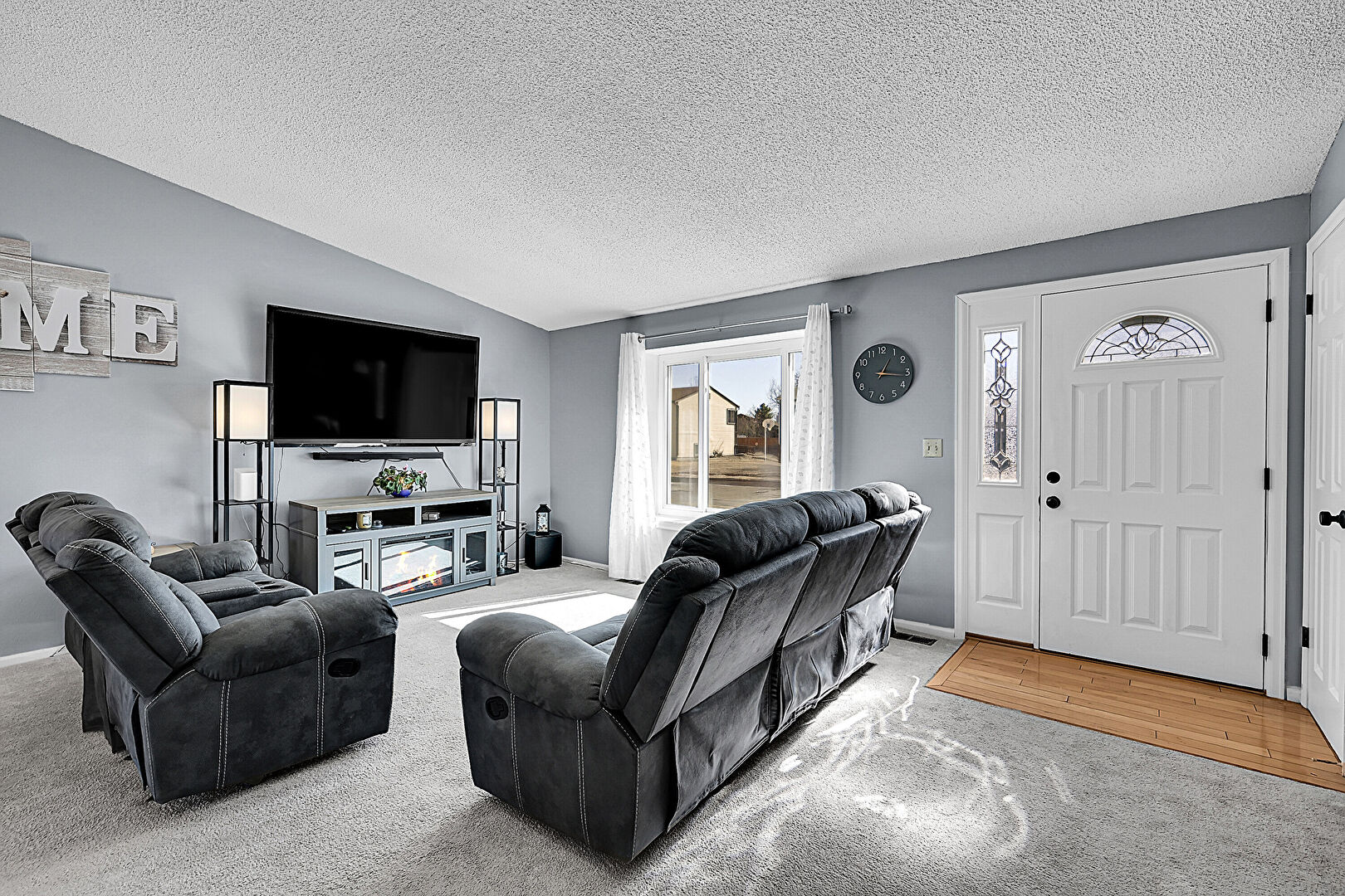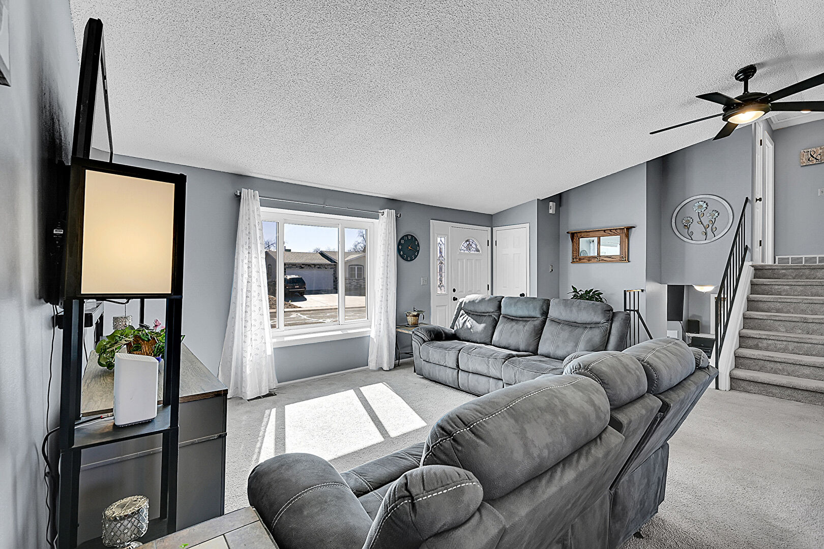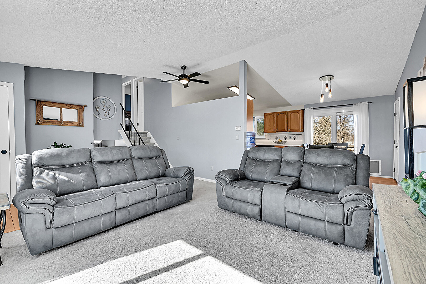 Baseboards Wall, Carpet, Cathedral Ceiling, Ceiling Fan, Drywall, Fireplace, Natural Light, Stairs, Textured Ceiling, Vaulted Ceiling, Vent, Natural Light, Textured Ceiling, Vaulted Ceiling