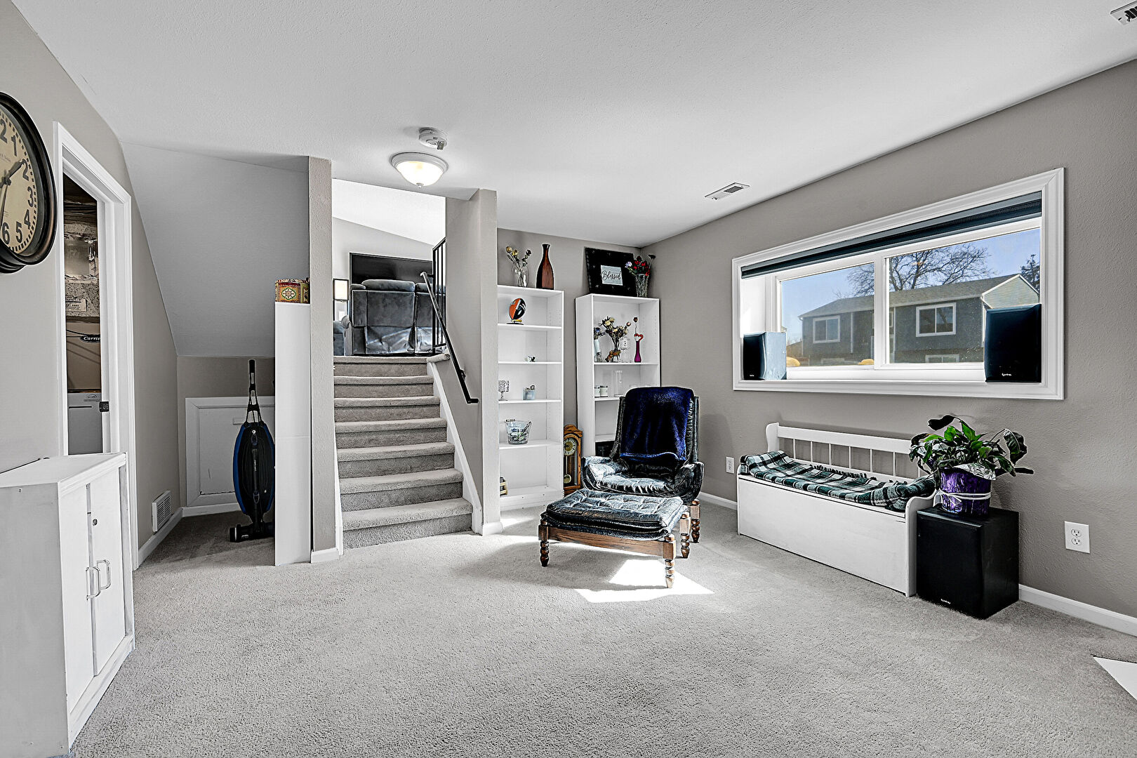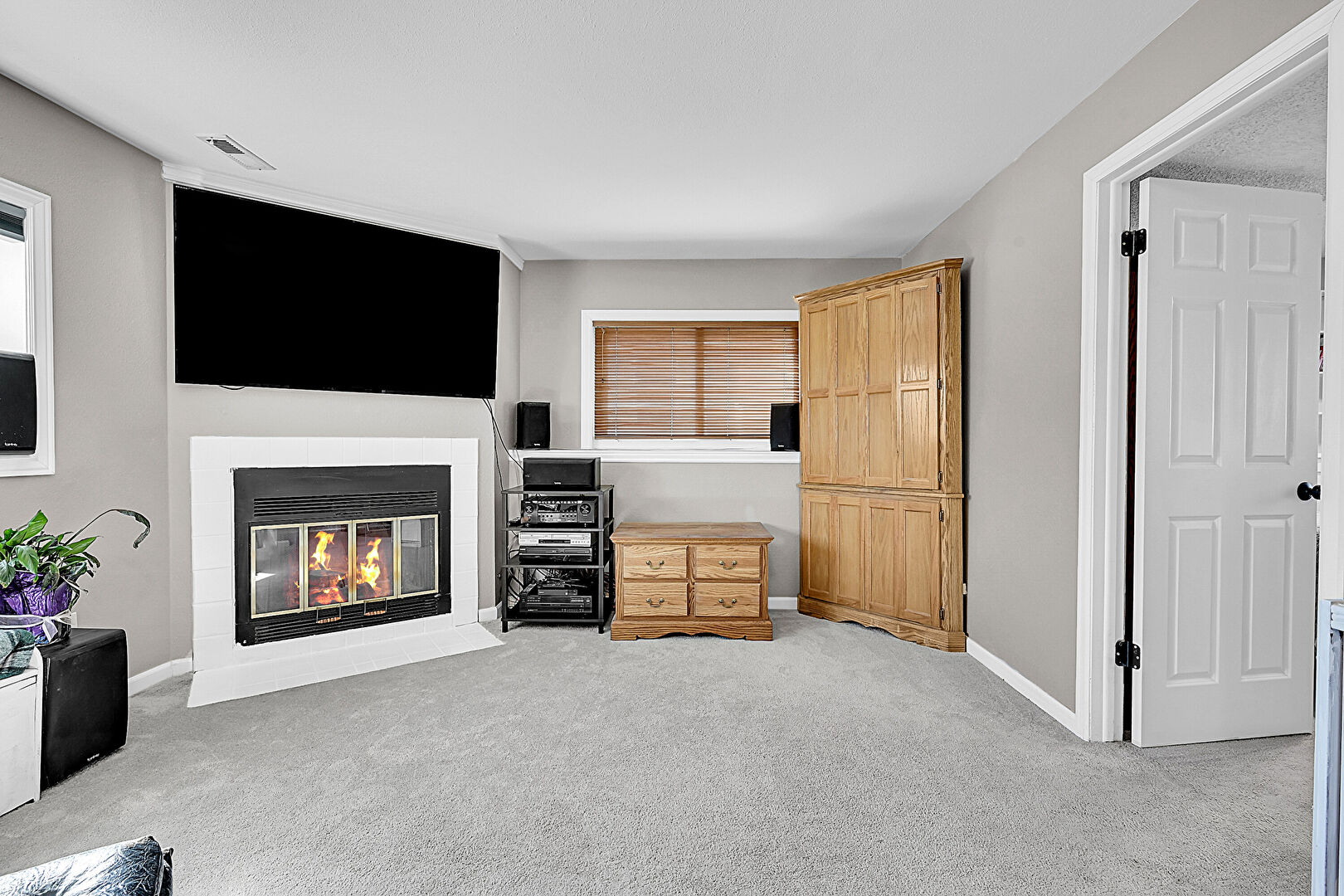 Baseboards Wall, Carpet, Drywall, Fireplace, Natural Light, Stairs, Vaulted Ceiling, Vent, Baseboards Wall, Vent
