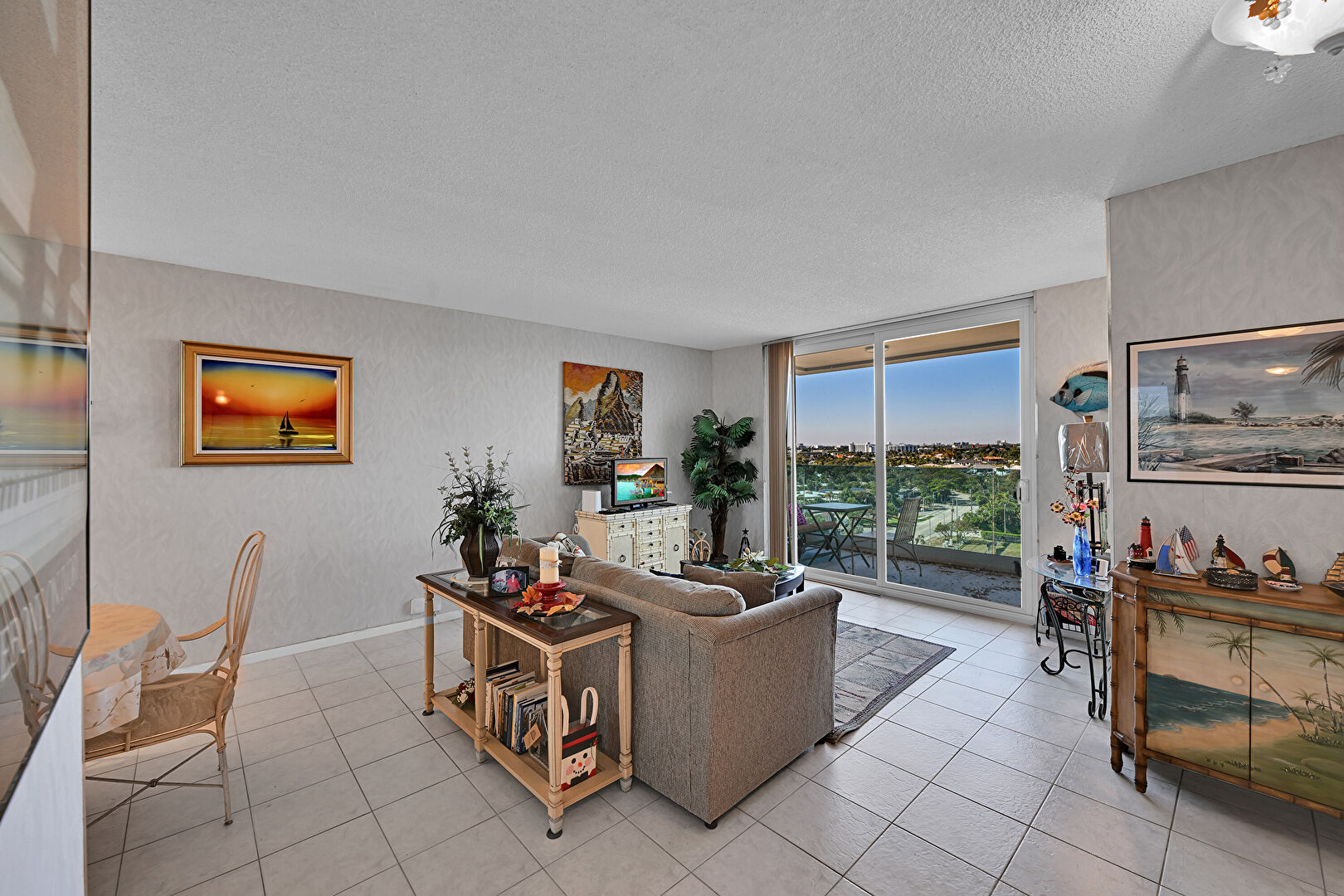 Baseboards Wall, Floor Ceiling Windows, Natural Light, Textured Ceiling, Textured Wall, Tile Floor, Vent, Wallpaper Wall, Waterfront, Baseboards Wall, Floor Ceiling Windows, Natural Light, Tile Floor