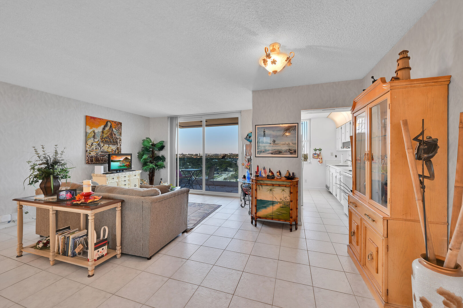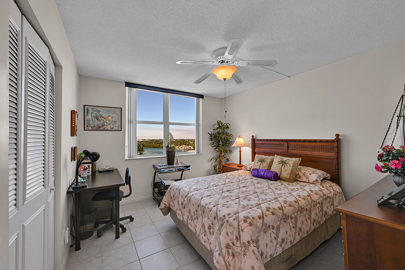 Baseboards Wall, Ceiling Fan, Drywall, Natural Light, Textured Ceiling, Textured Wall, Tile Floor, City View, Tile Floor, Vent