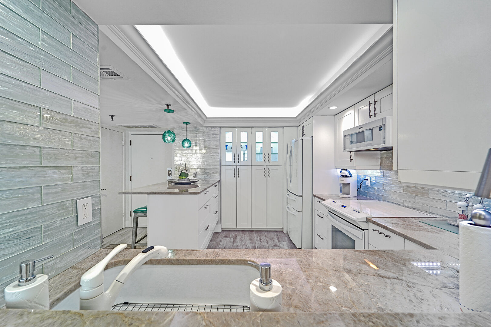Baseboards Wall, Crown Molding, Drywall, Glass Insert Cabinets, Kitchen Bar, Kitchen Peninsula, Pass Through Window, Pendant Lighting, Pendent Fire Sprinkler, Recessed Lighting, Shaker Cabinets, Stone Countertops, Toaster, Tray Ceiling, Vent, Wood Finish Floor, Natural Light, Tray Ceiling, Vent