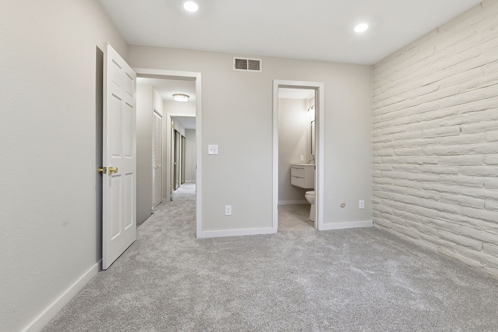 Accent Wall, Baseboards Wall, Brick Wall, Carpet, Closet, Drywall, Ensuite Bathroom, Natural Light, Recessed Lighting, Vent, Baseboards Wall, Closet, Recessed Lighting