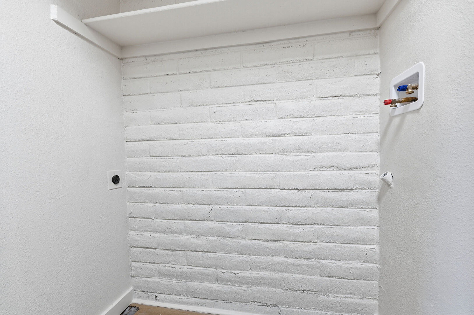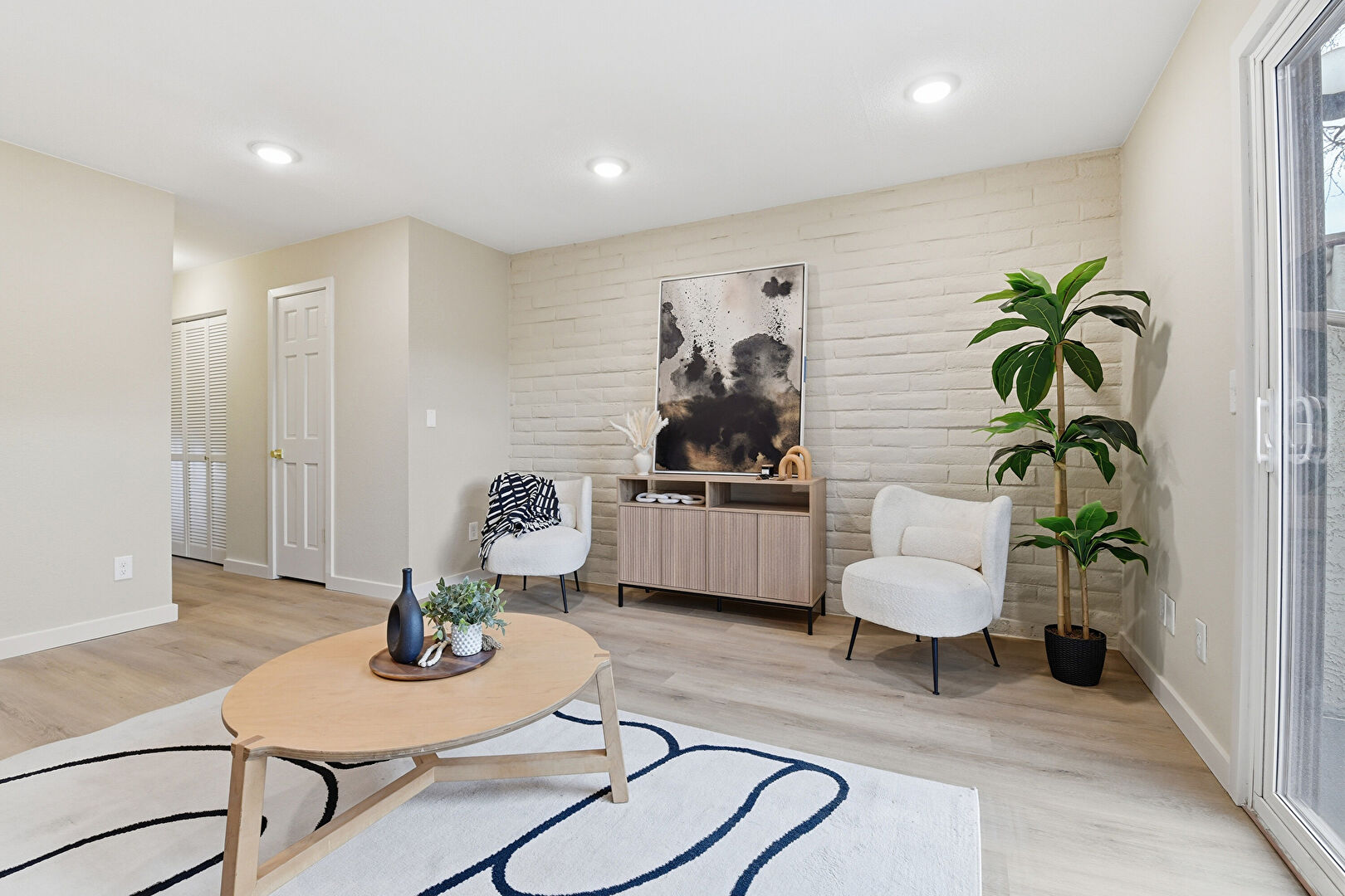 Accent Wall, Baseboards Wall, Brick Wall, Drywall, Natural Light, Recessed Lighting, Wood Finish Floor, Accent Wall, Drywall