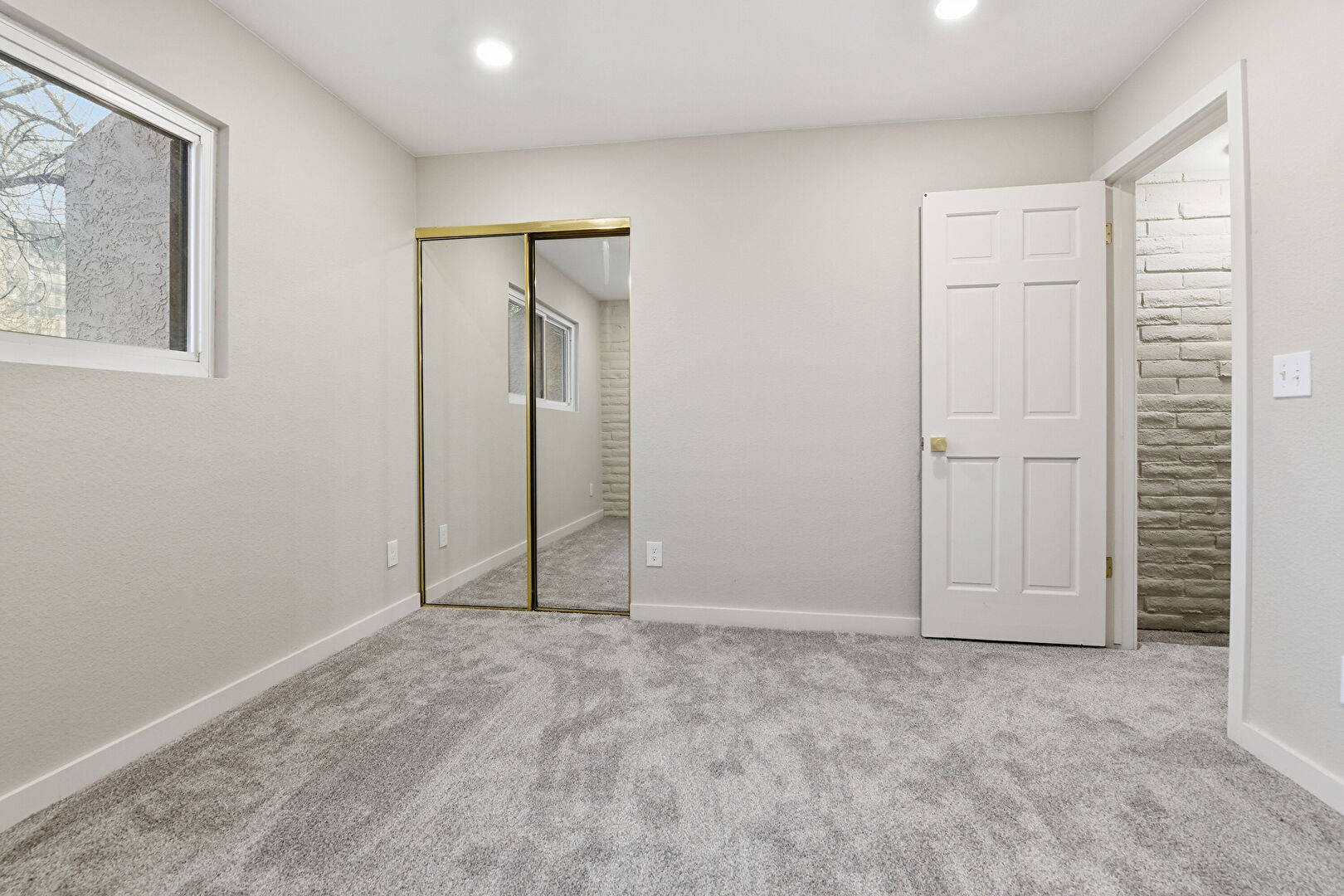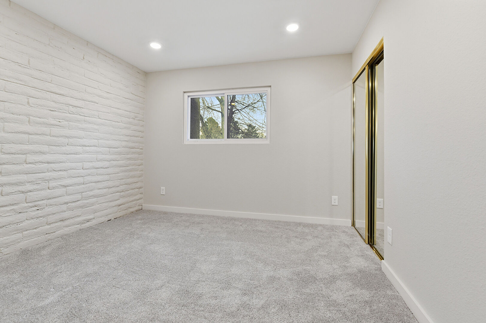 Accent Wall, Baseboards Wall, Brick Wall, Carpet, Drywall, Ensuite Bathroom, Natural Light, Recessed Lighting, Two Closets, Brick Wall, Carpet, Recessed Lighting