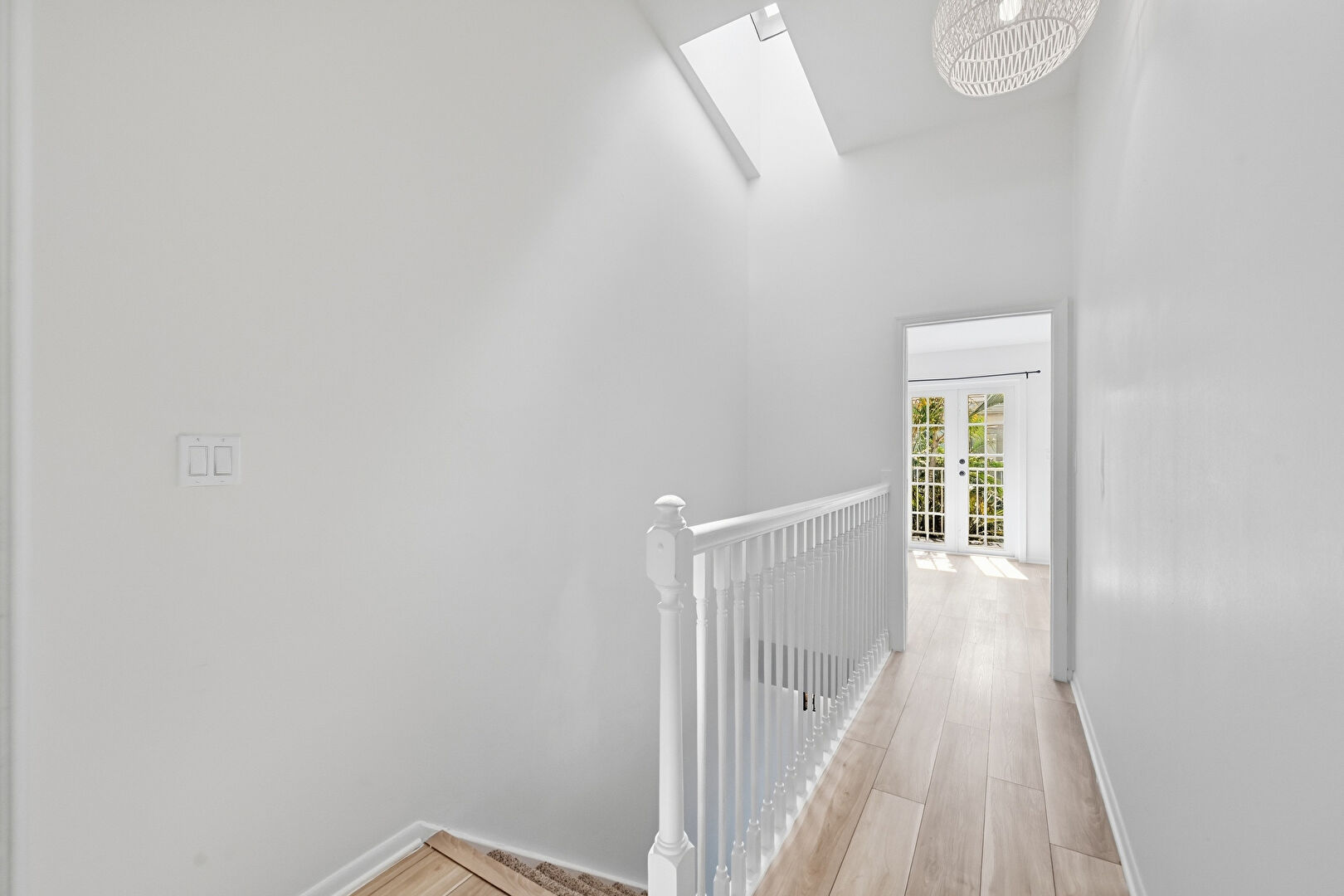 Baseboards Wall, Drywall, High Ceiling, Natural Light, Recessed Lighting, Stairs, Upstairs Landing, Vaulted Ceiling, Vent, Wood Finish Floor, Baseboards Wall, Drywall