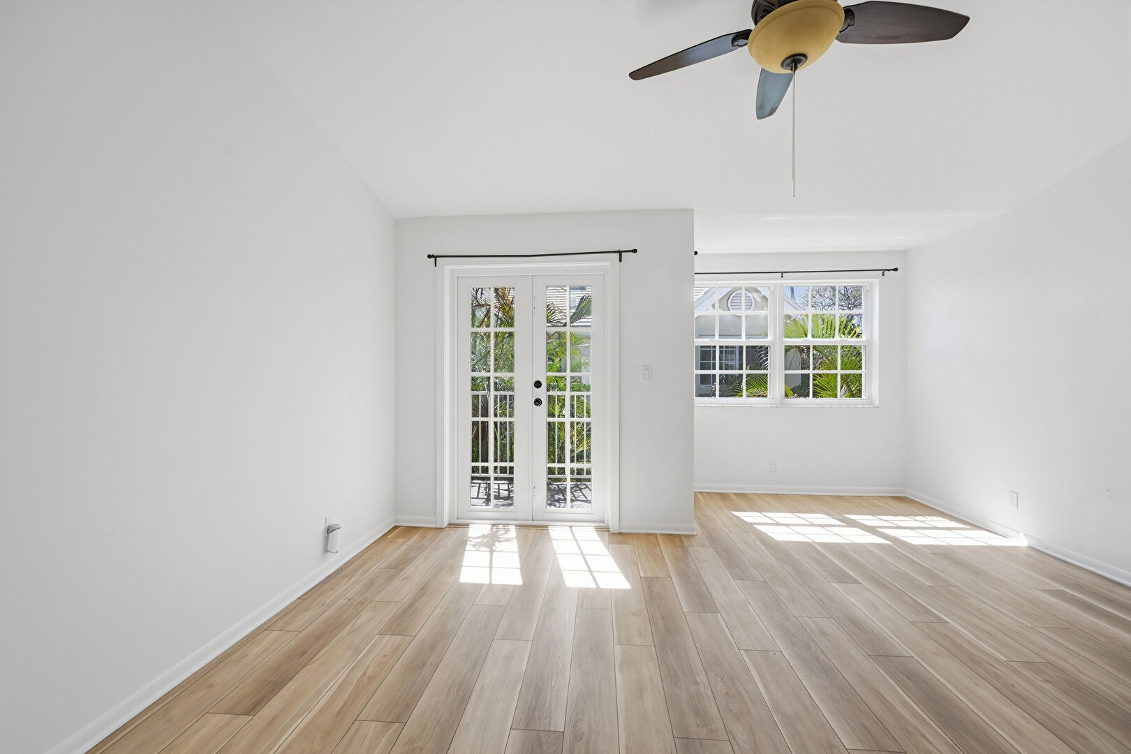 Barn Door, Baseboards Wall, Ceiling Fan, Drywall, French Doors, Natural Light, Wood Finish Floor, Drywall, Vaulted Ceiling