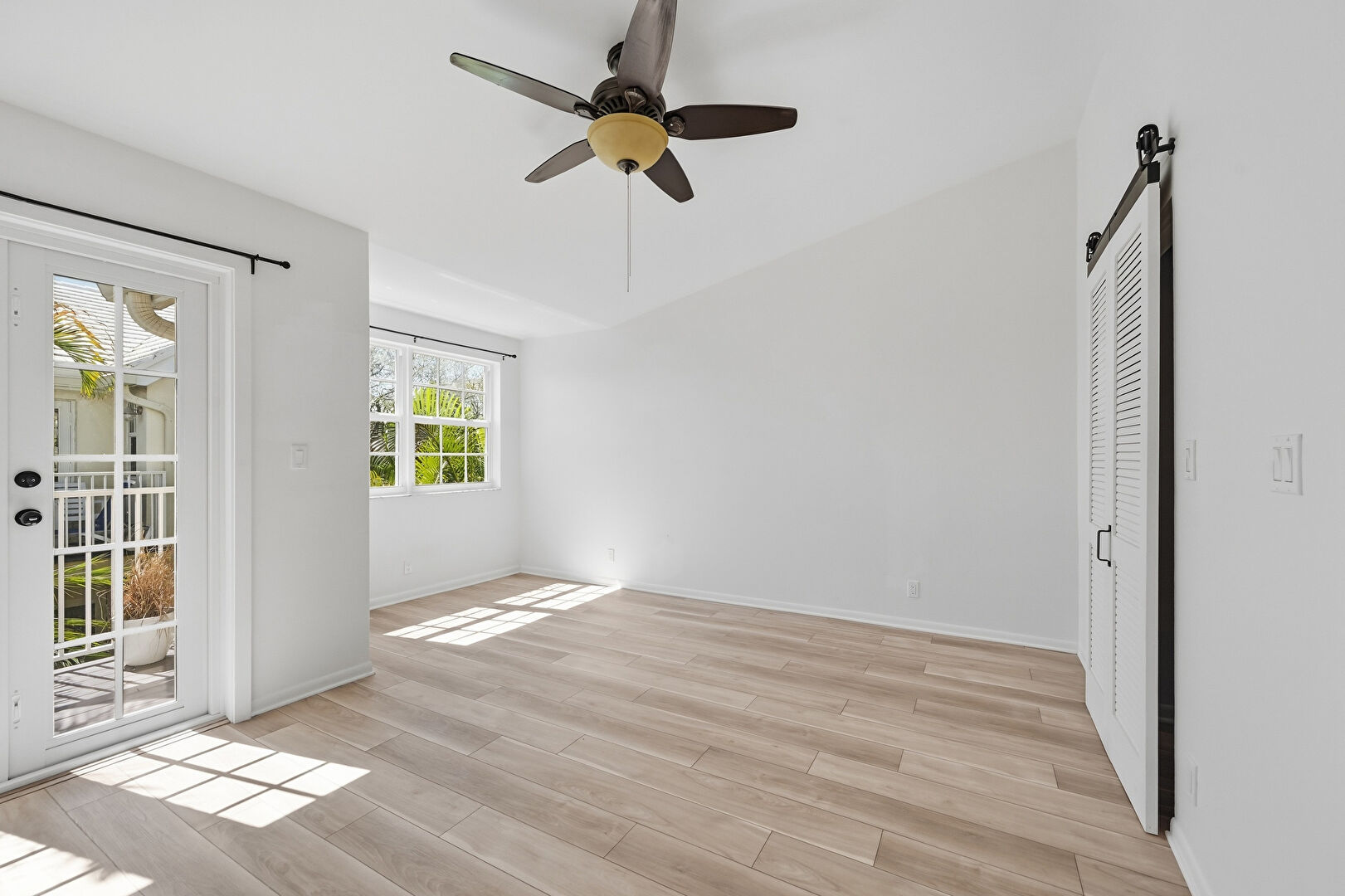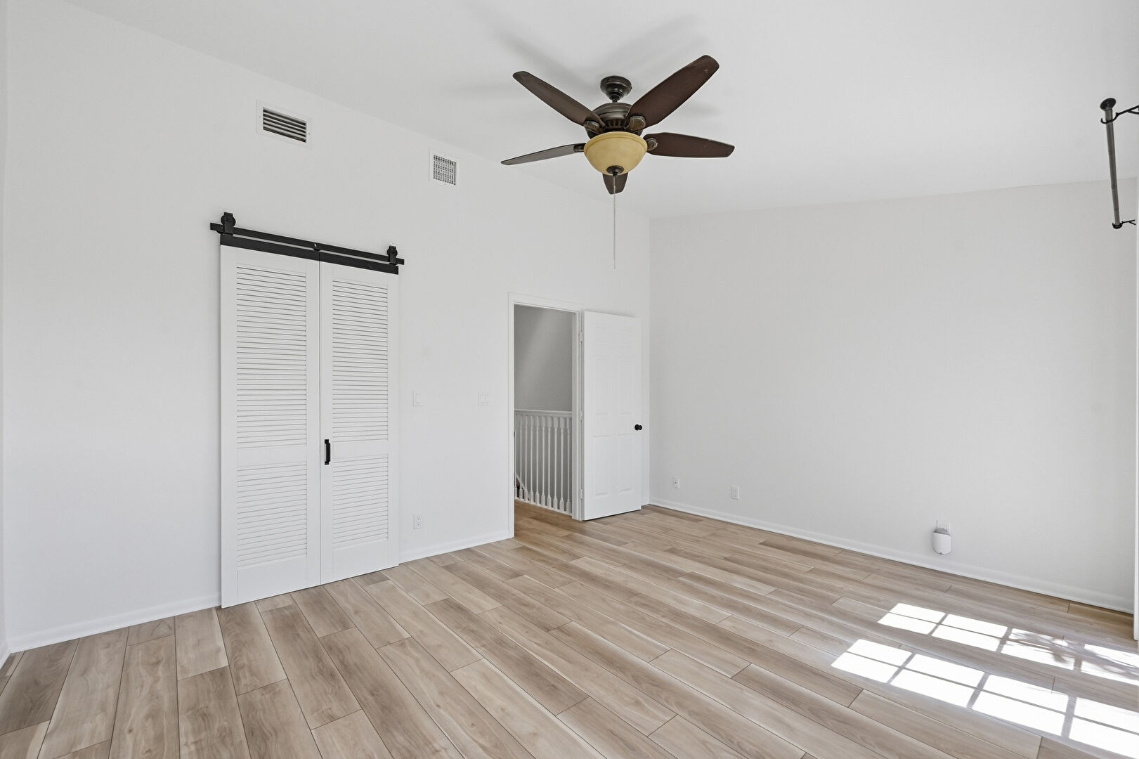Barn Door, Baseboards Wall, Ceiling Fan, Closet, Drywall, High Ceiling, Natural Light, Vaulted Ceiling, Vent, Wood Finish Floor, Closet, High Ceiling