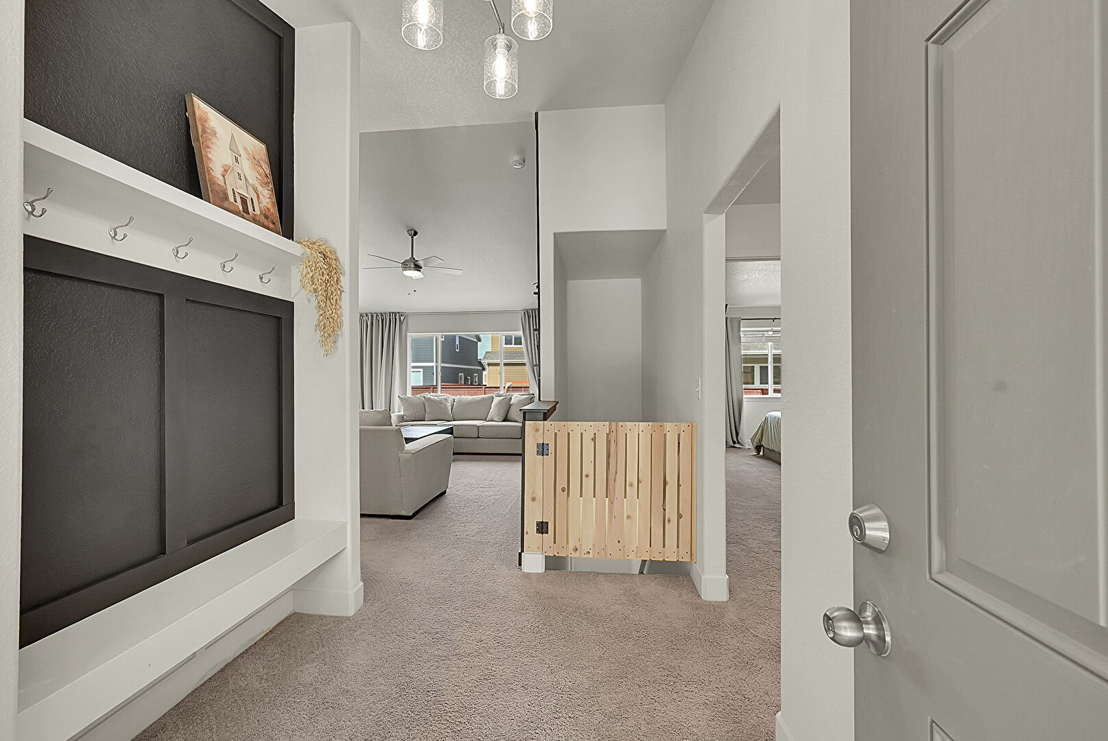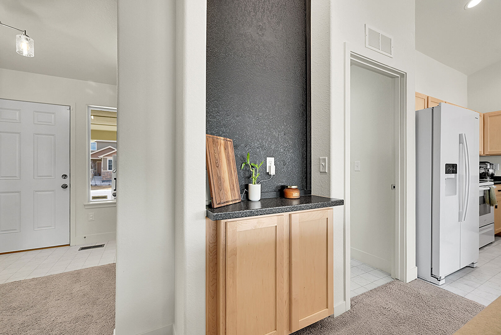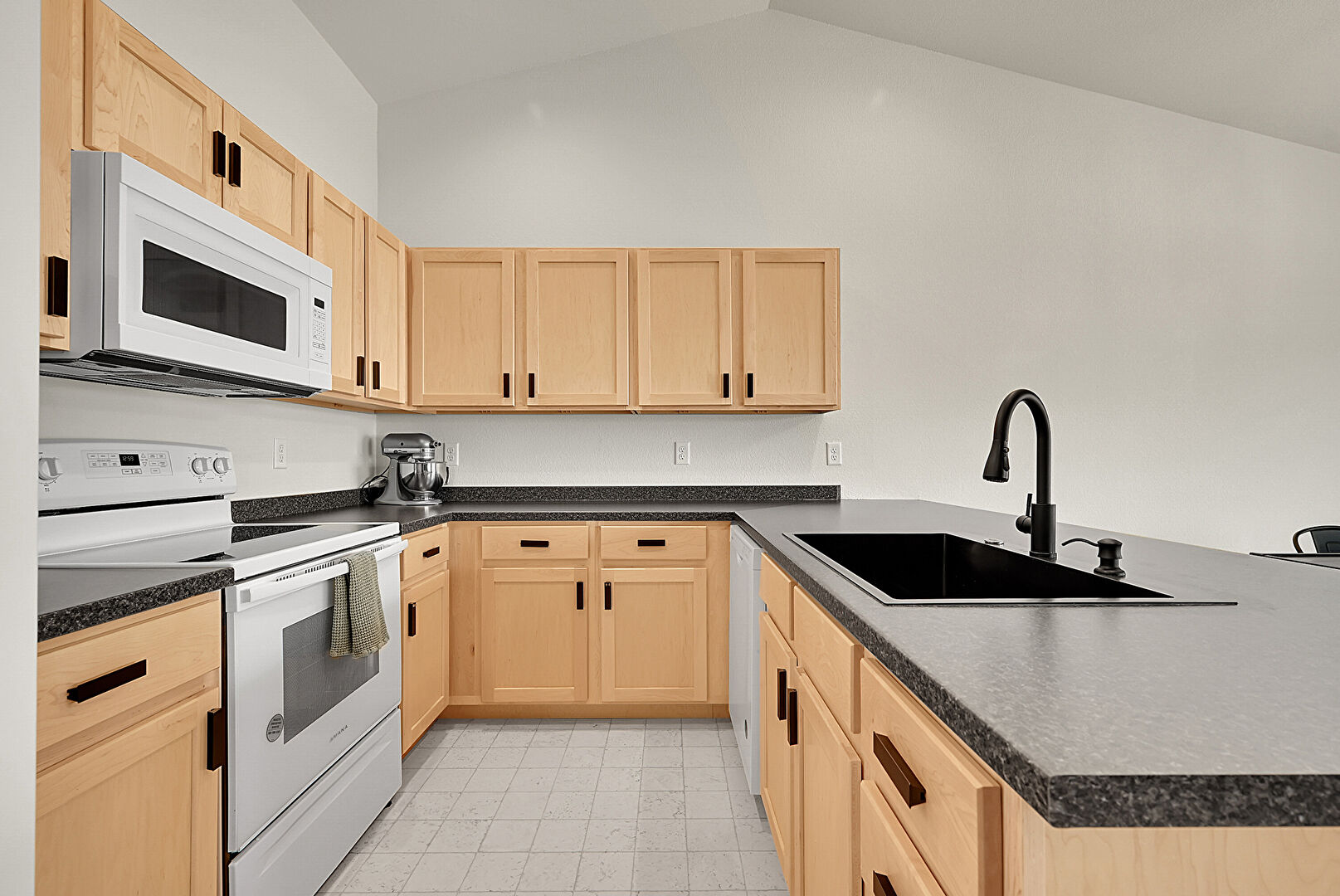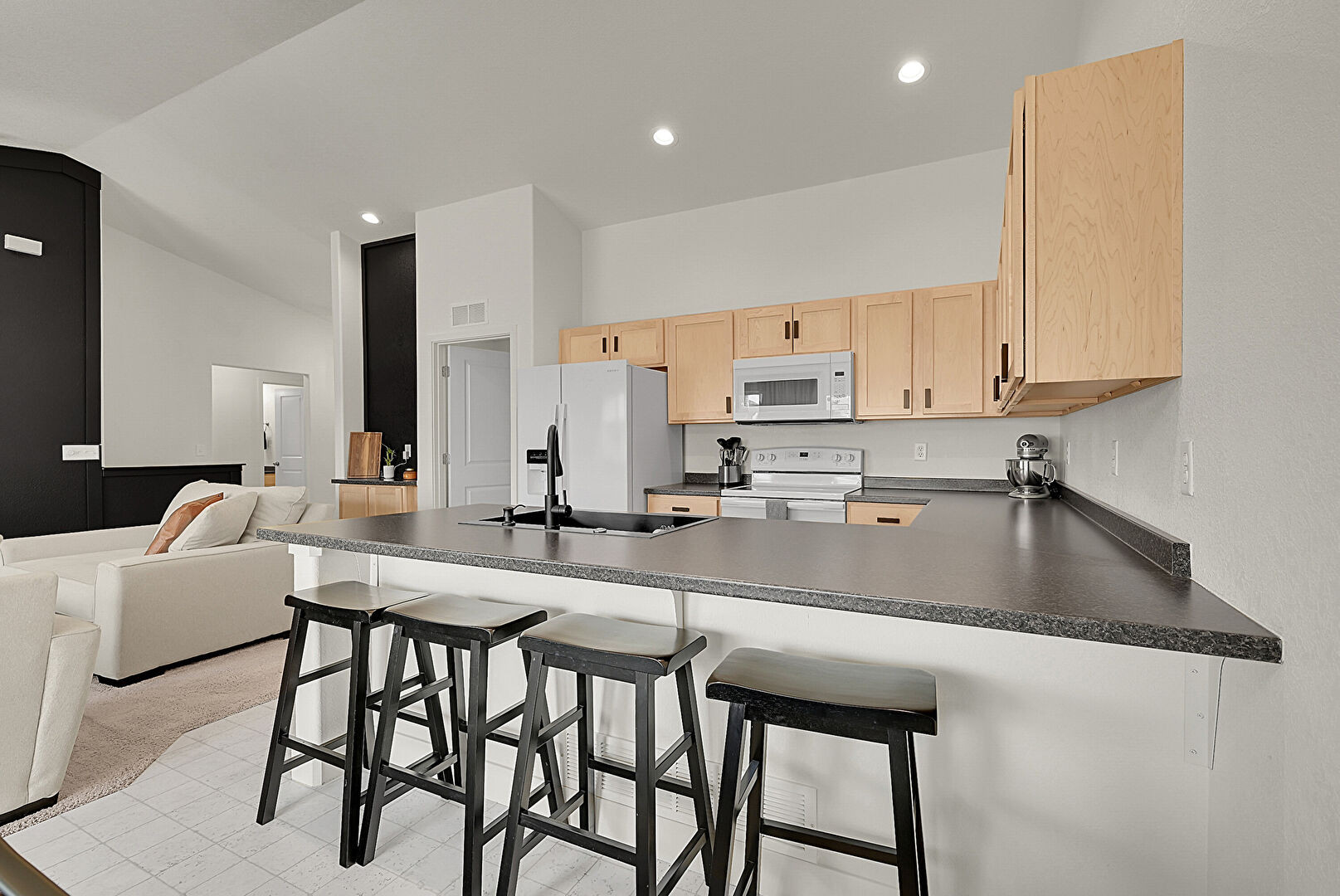 Baseboards Wall, Carpet, Ceiling Fan, Drywall, High Ceiling, Kitchen Bar, Kitchen Peninsula, Laundry, Natural Light, Opens To Living Area, Pendant Lighting, Recessed Lighting, Shaker Cabinets, U Shaped Kitchen, Vaulted Ceiling, Vent, Vinyl Floor, Washer Dryer, Cathedral Ceiling, Kitchen Peninsula, Recessed Lighting, Vinyl Floor