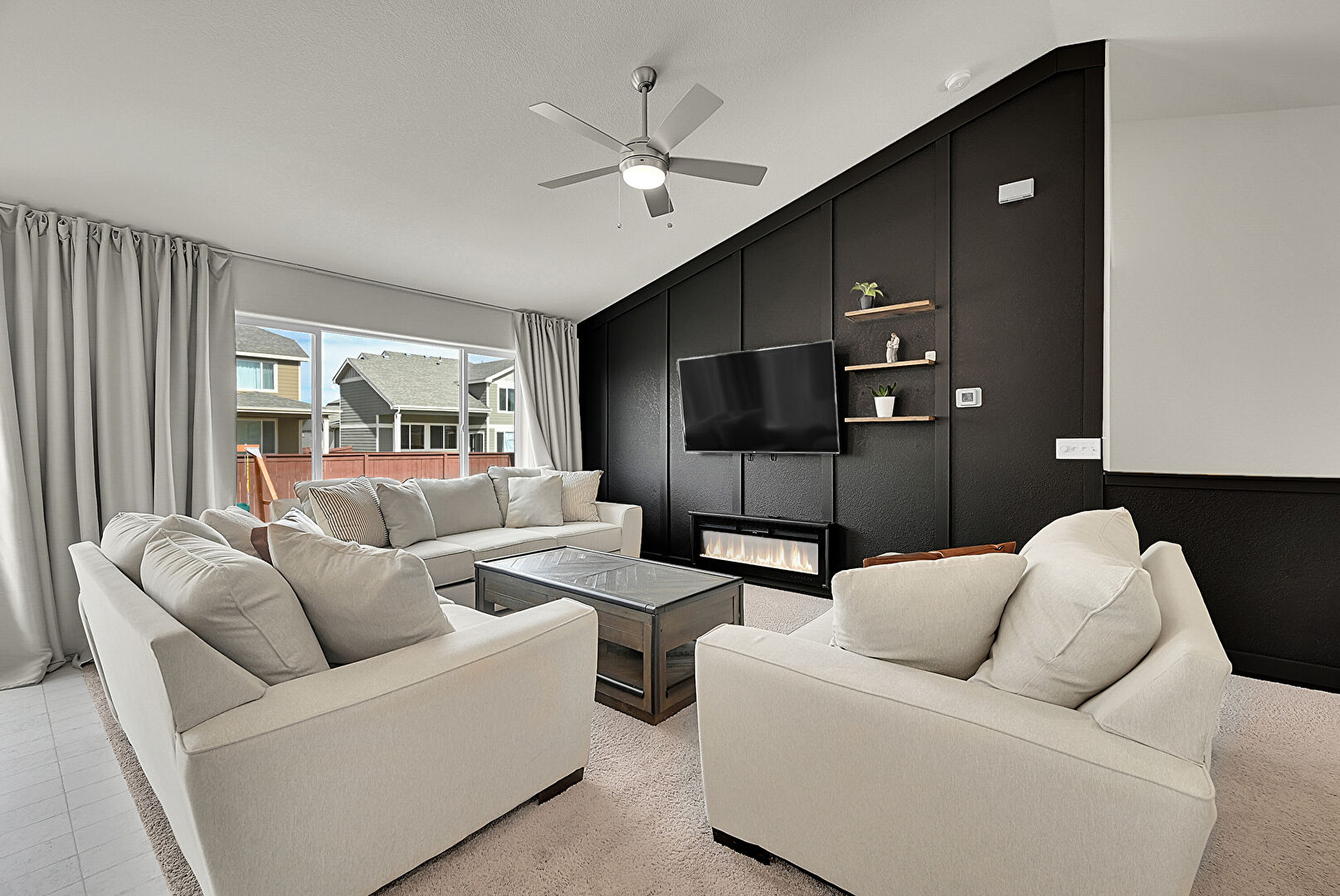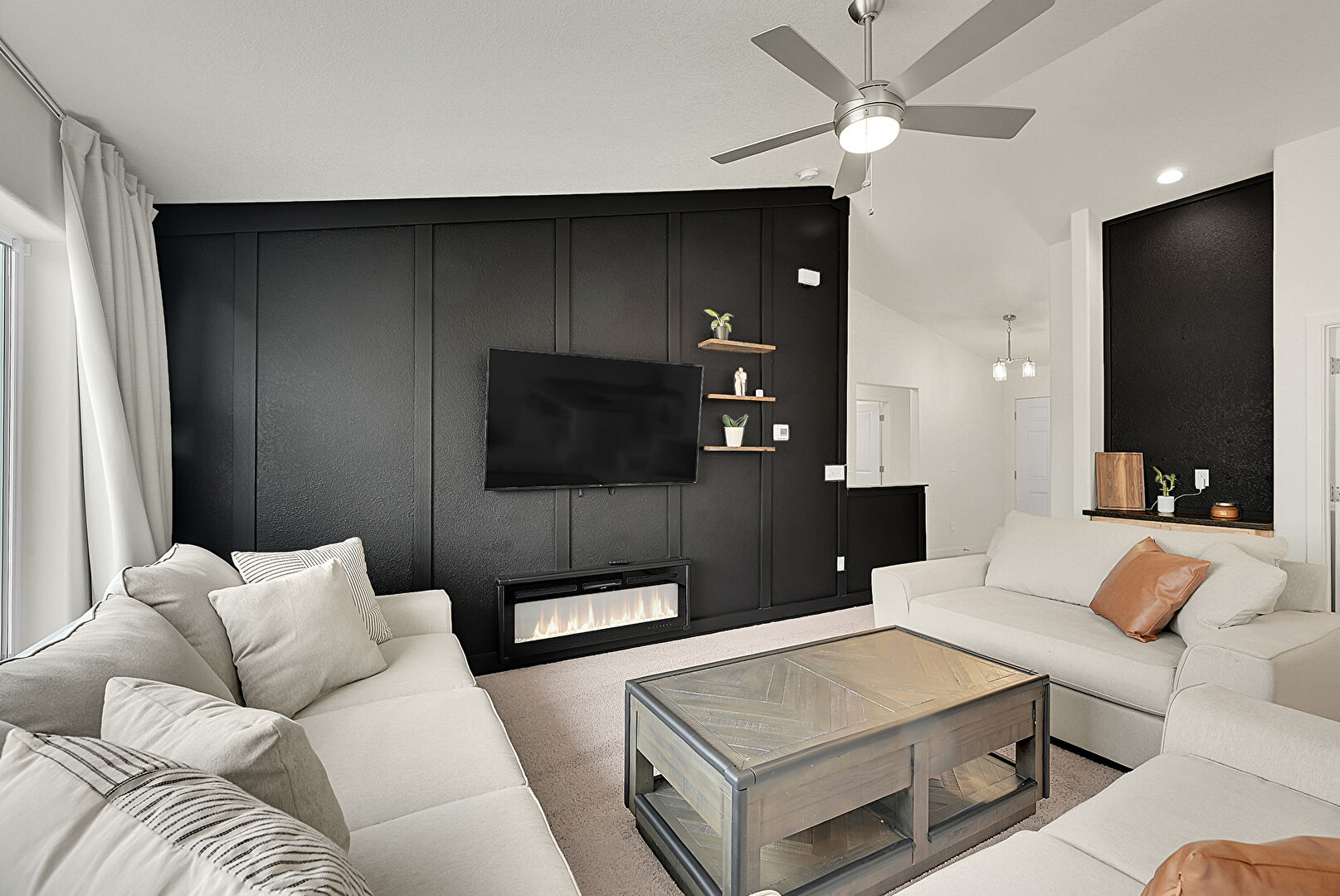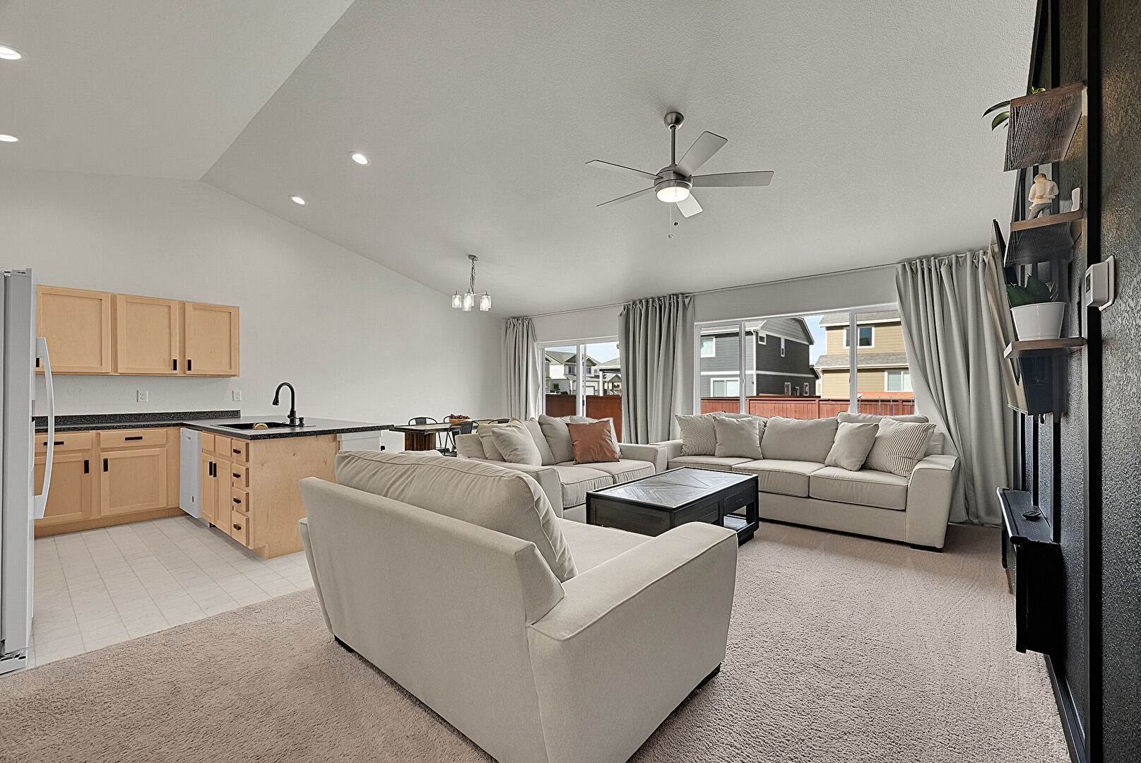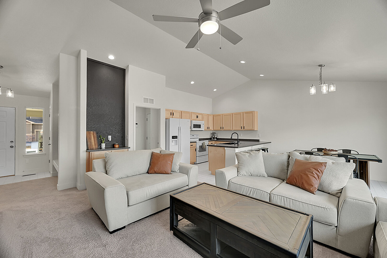 Baseboards Wall, Carpet, Ceiling Fan, Drywall, Fireplace, High Ceiling, Natural Light, Notable Chandelier, Paneling Wall, Recessed Lighting, Vaulted Ceiling, Vent, Ceiling Fan, L Shaped Kitchen