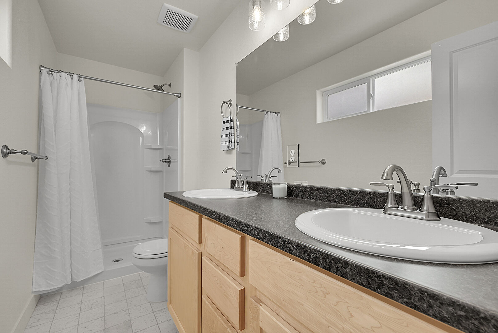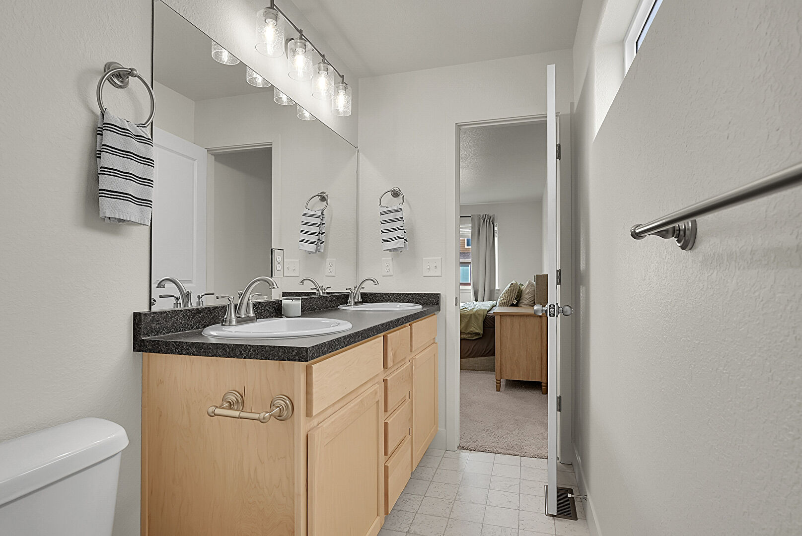 Baseboards Wall, Carpet, Double Vanity, Drywall, Ensuite Bathroom, Full Bathroom, Natural Light, Textured Wall, Vent, Vinyl Floor, Baseboards Wall, Vinyl Floor