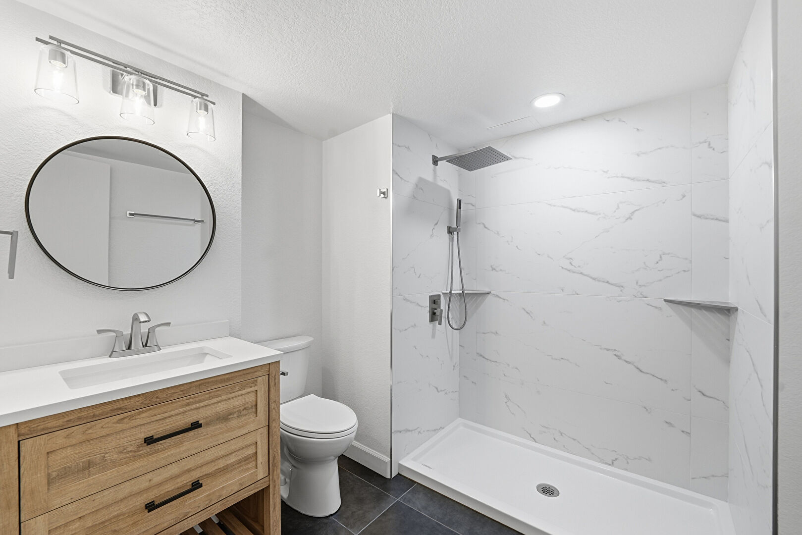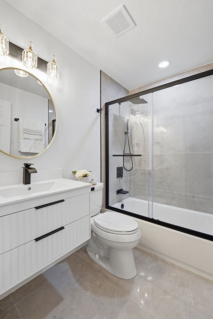 Baseboards Wall, Combined Bath Shower, Drywall, Full Bathroom, Recessed Lighting, Textured Ceiling, Tile Floor, Vanity, Vent, Recessed Lighting, Textured Wall
