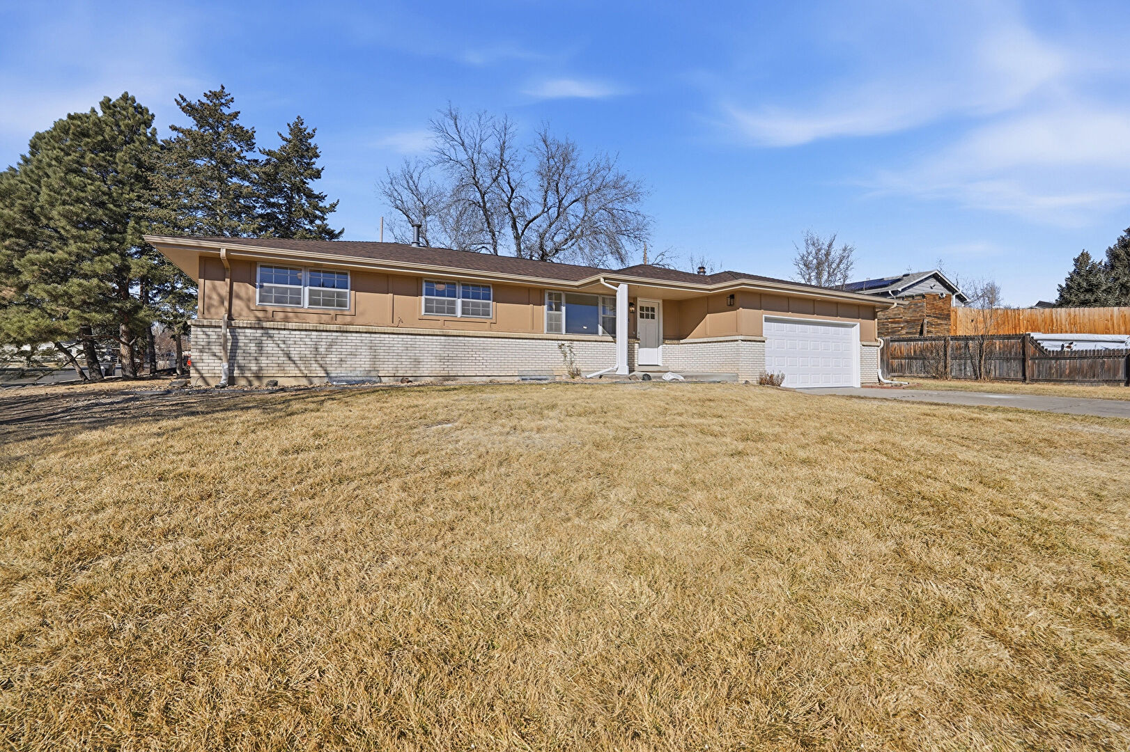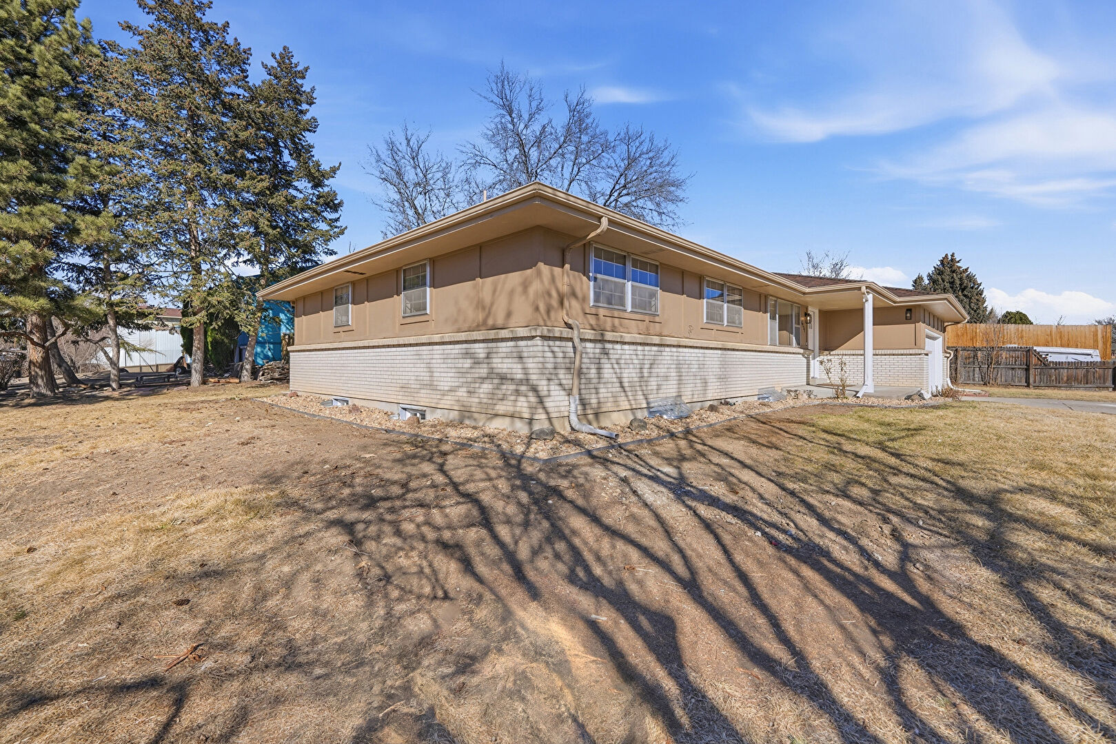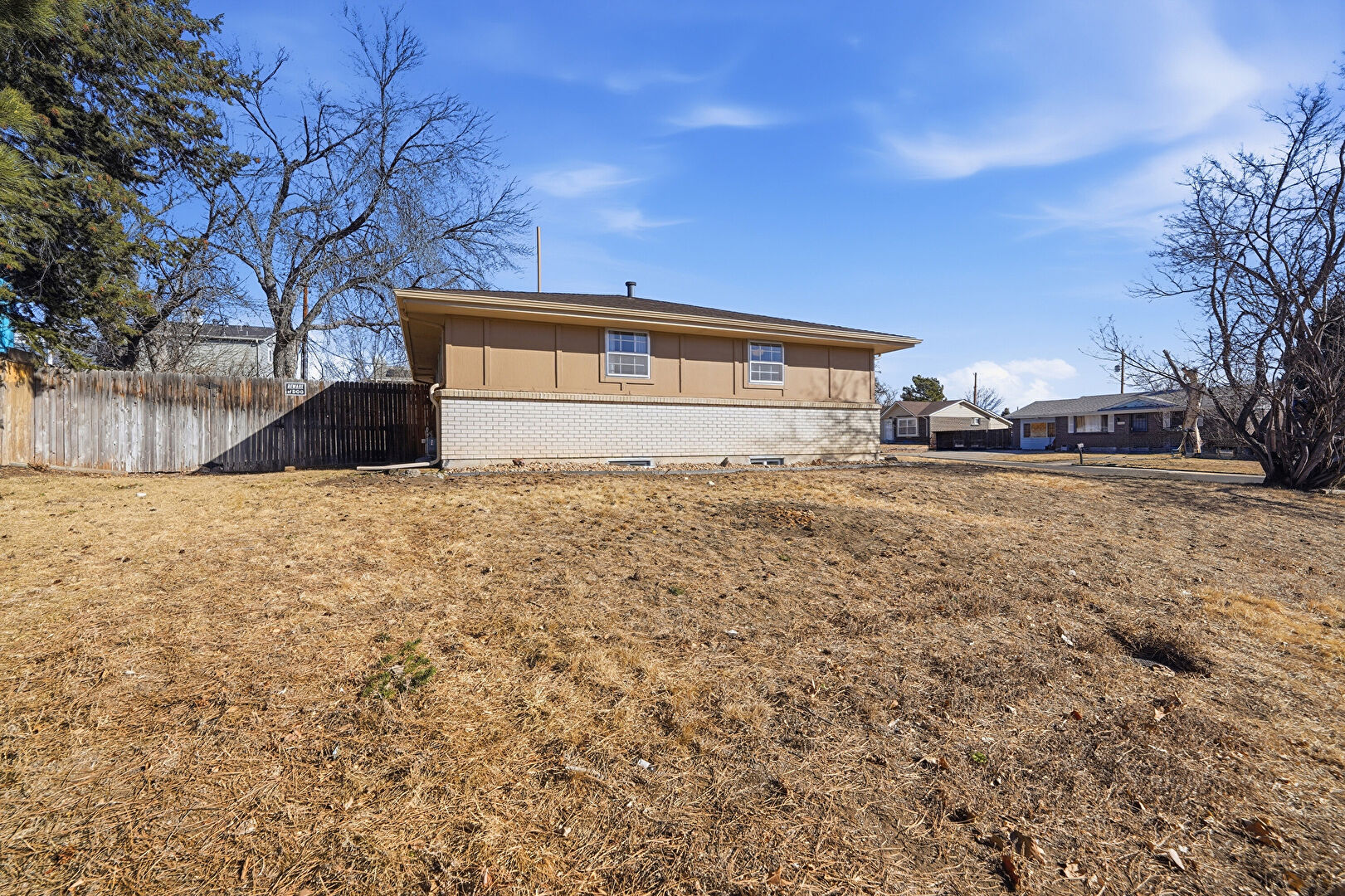 Brick Siding, Concrete Foundation, Downspout, Gutters, Lawn, Vertical Siding, Fence