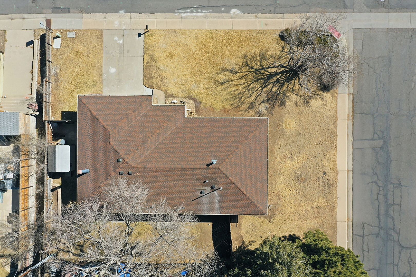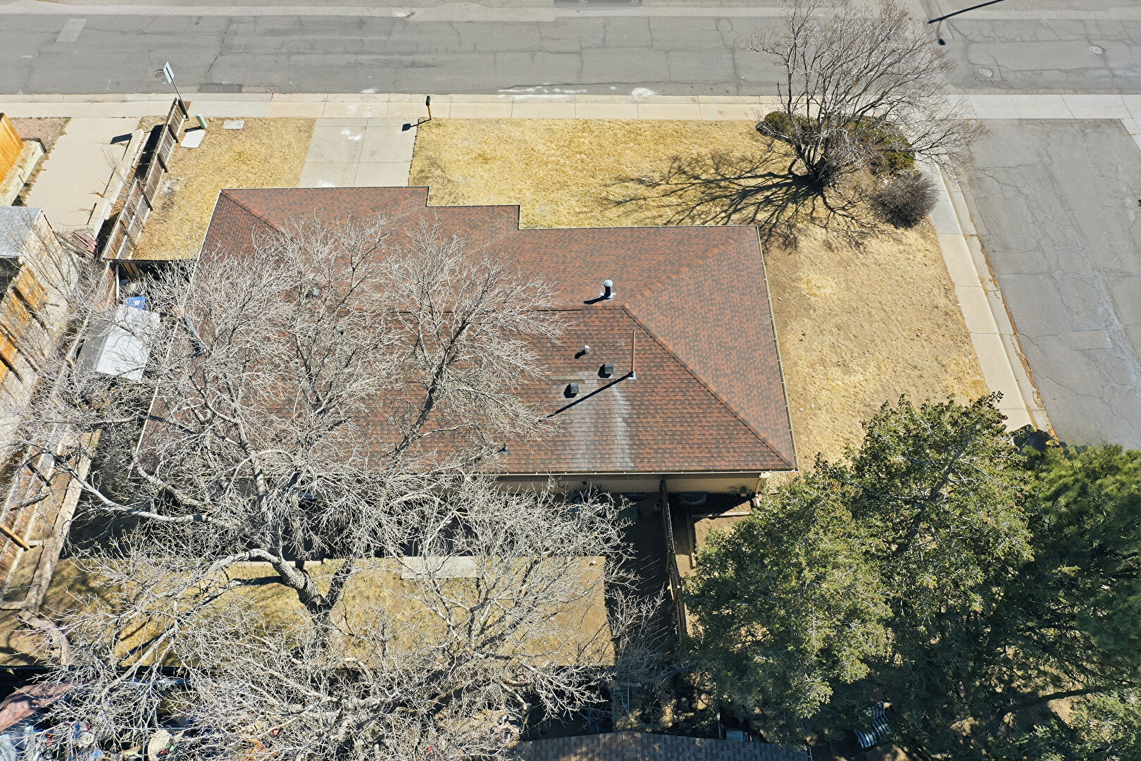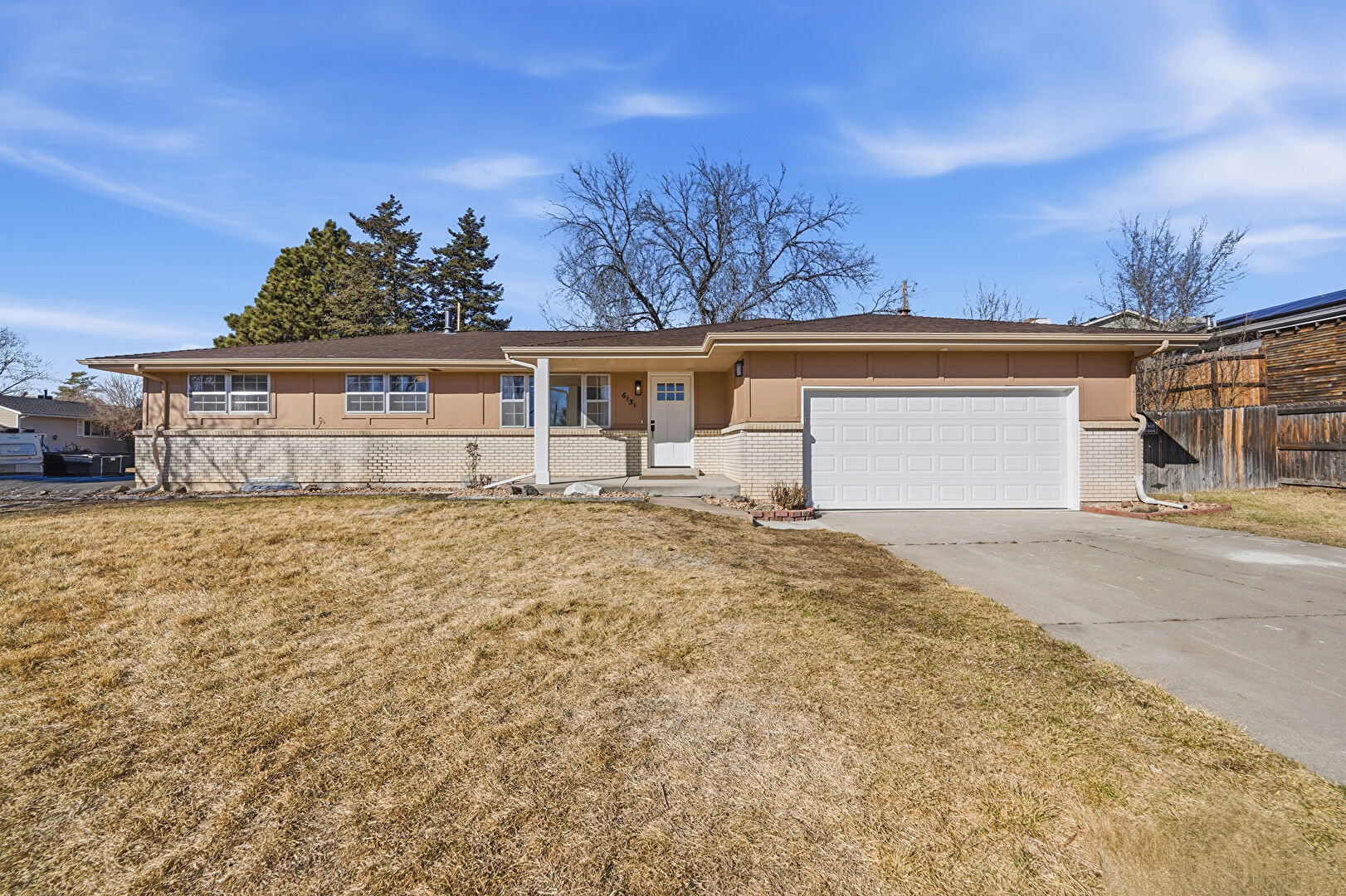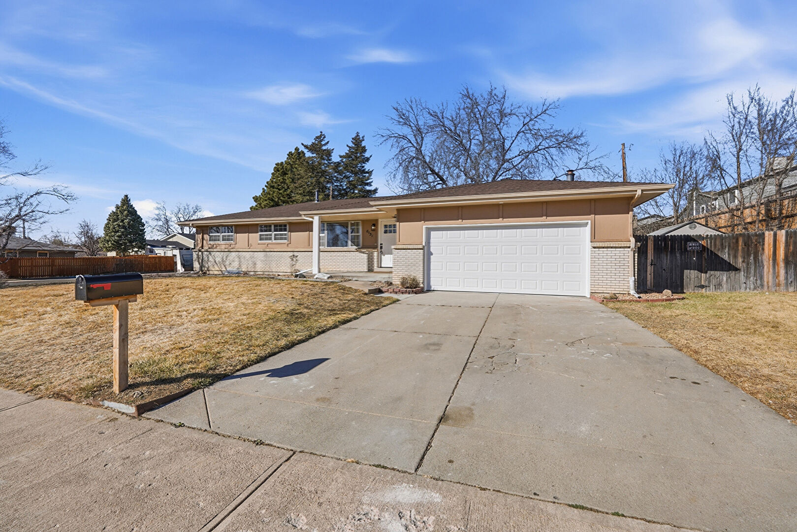 Brick Siding, Concrete Foundation, Downspout, Gutters, Lawn, Vertical Siding, Fence