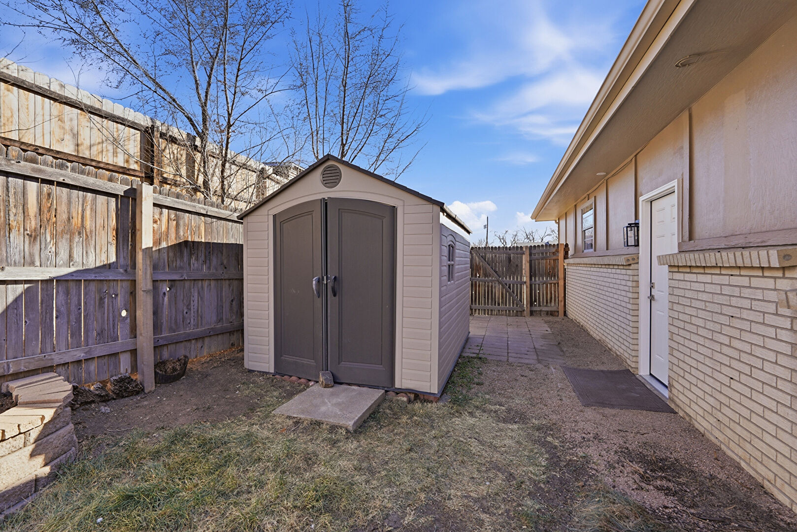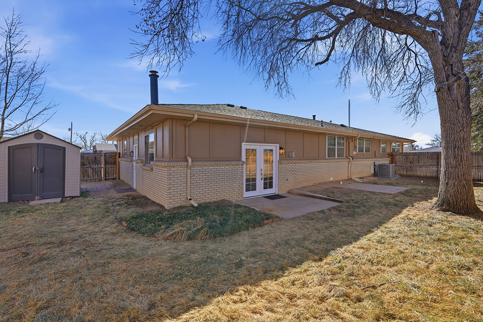 Board Batten Siding, Brick Siding, Central Ac, Concrete Foundation, Downspout, Fence, French Doors, Gate, Gutters, Lawn, Outdoor Structure, Patio, Shed, Vertical Siding, Brick Siding, Shed, Shingle Roof, Vertical Siding