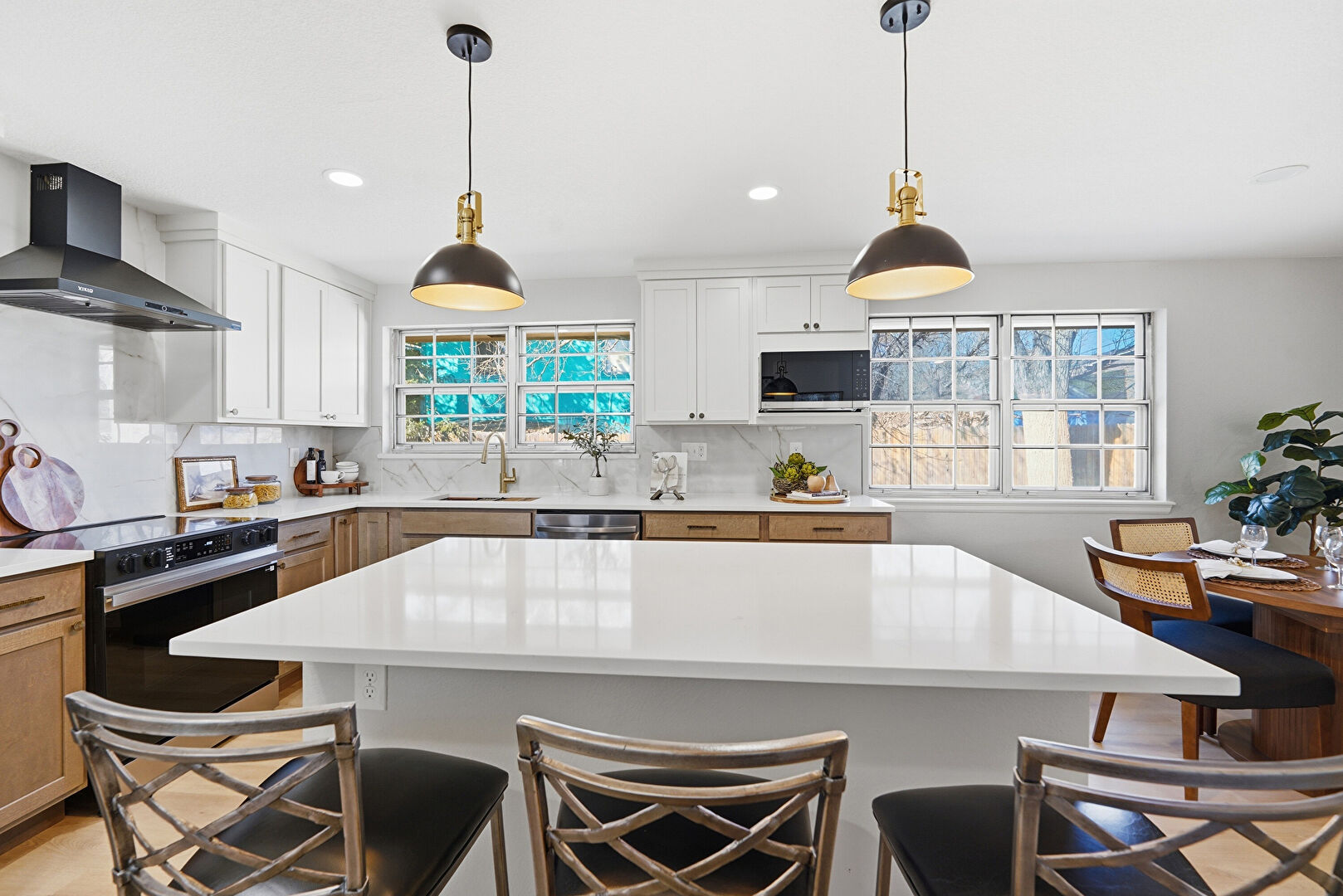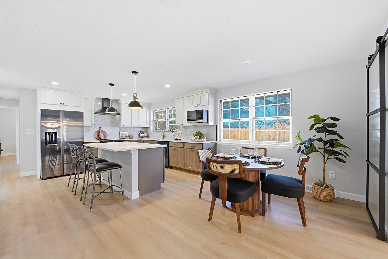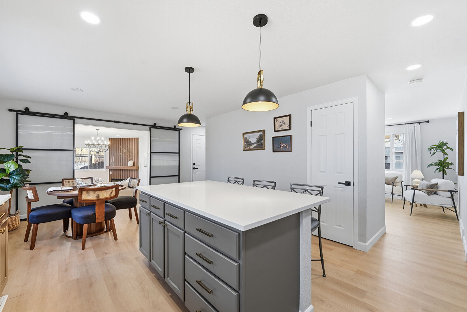 Barn Door, Baseboards Wall, Crown Molding Cabinets, Dark Brown Cabinets, Drywall, Gray Cabinets, Kitchen Bar, Kitchen Island, L Shaped Kitchen, Medium Brown Cabinets, Natural Light, Notable Chandelier, Opens To Living Area, Pendant Lighting, Recessed Lighting, Shaker Cabinets, Stone Countertops, Wood Finish Floor, Fire Pit, Kitchen Bar, Natural Light, Pendant Lighting, Shaker Cabinets, Stone Countertops, Vent, Wood Finish Floor