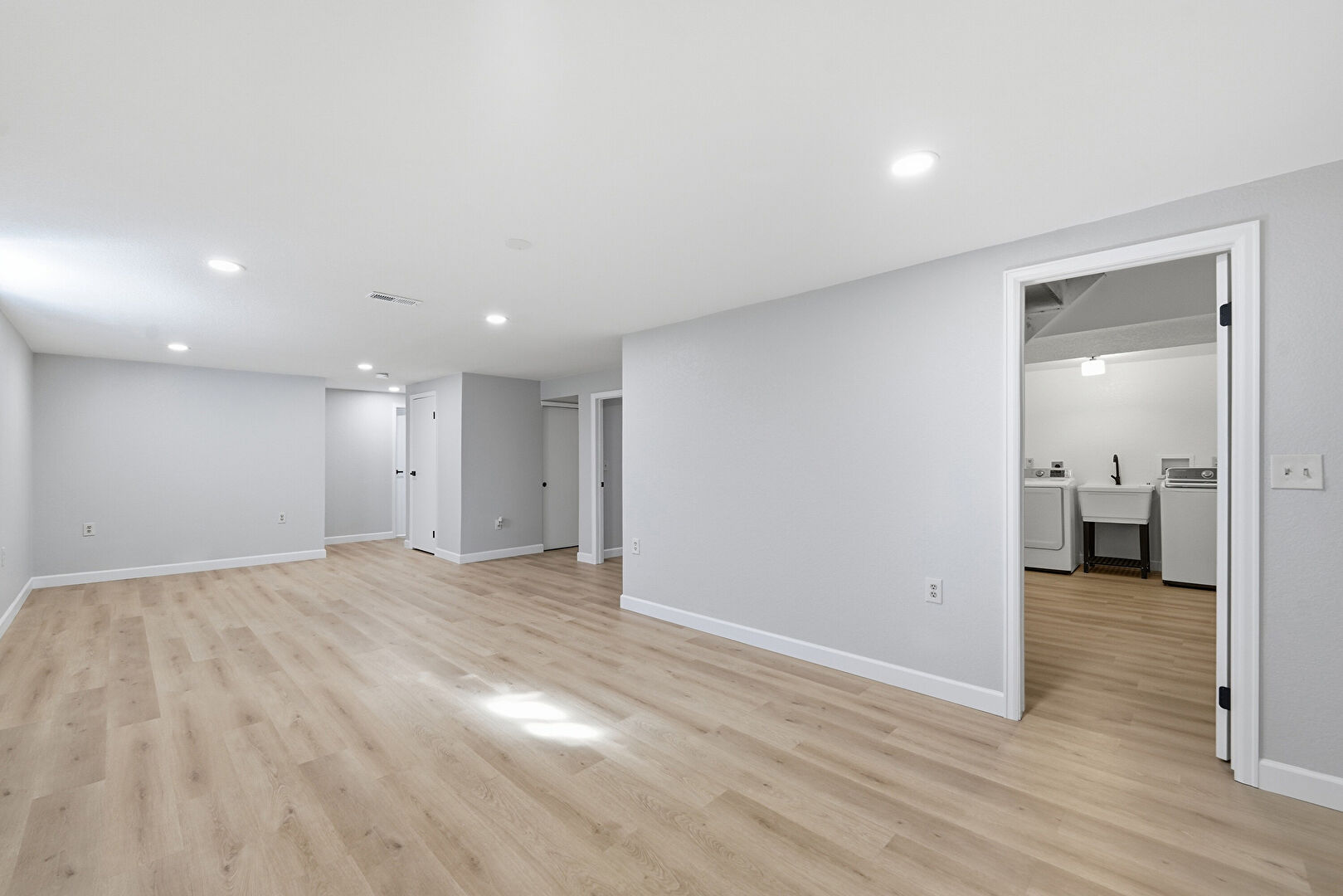 Baseboards Wall, Basement, Drywall, Natural Light, Recessed Lighting, Stairs, Vent, Washer Hookup, Wood Finish Floor, Basement, Drywall, Laundry