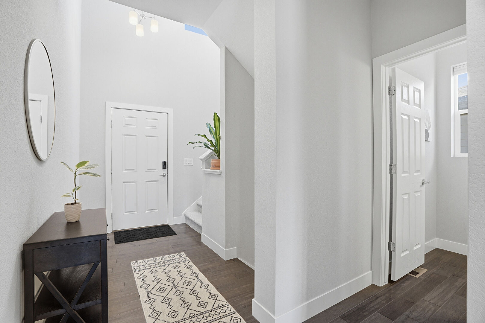 Baseboards Wall, Drywall, High Ceiling, Natural Light, Recessed Lighting, Stairs, Vent, Wood Finish Floor, Drywall, Natural Light