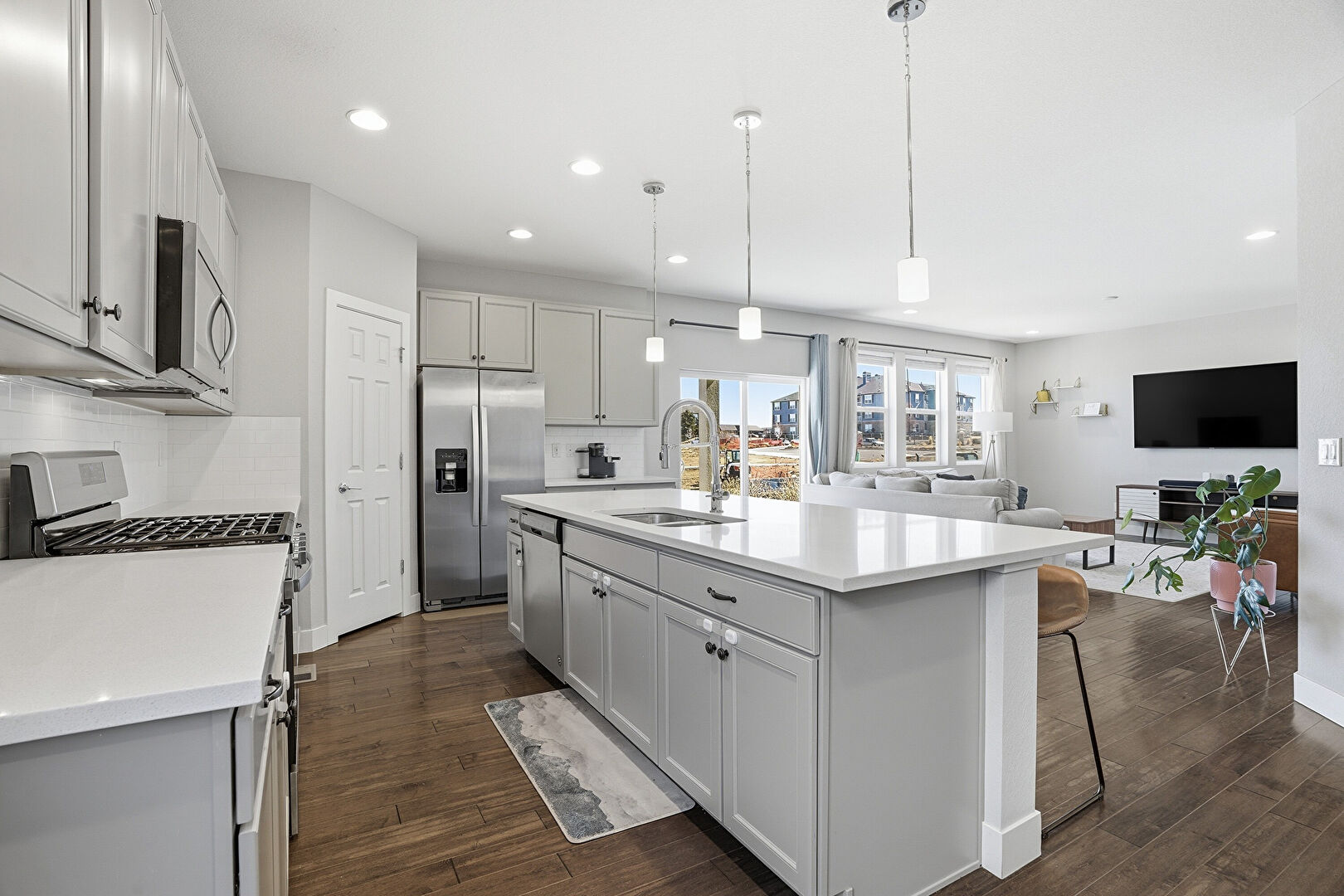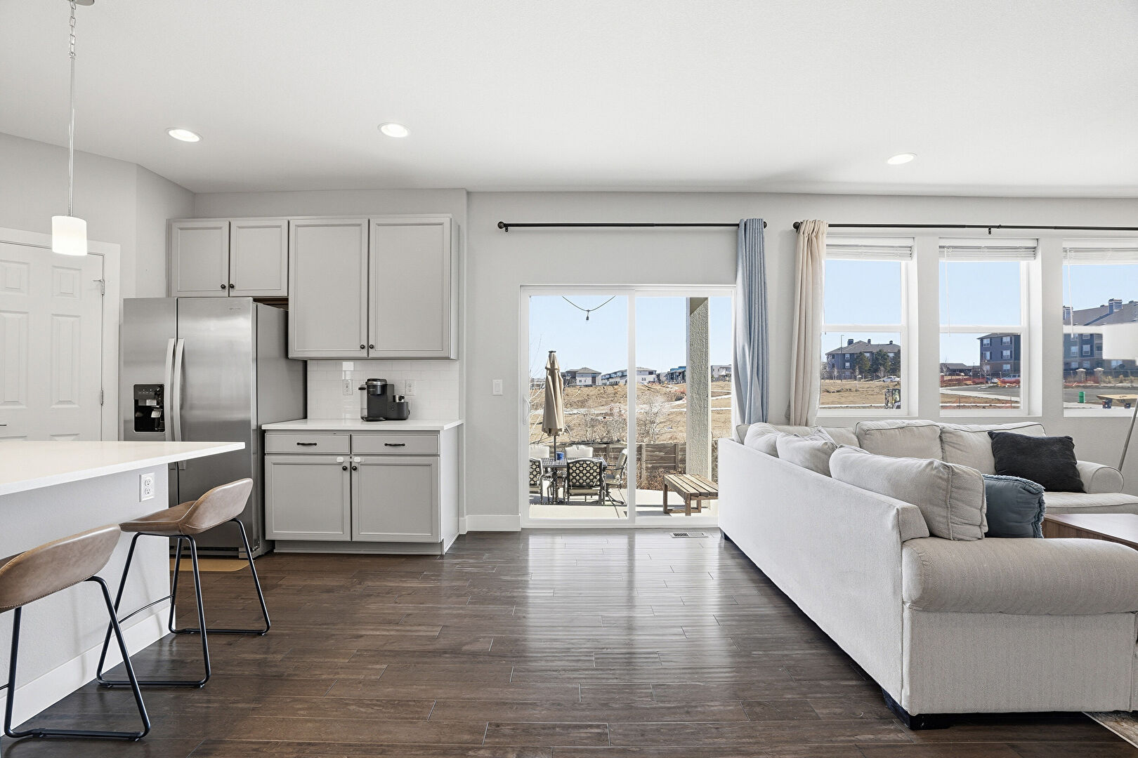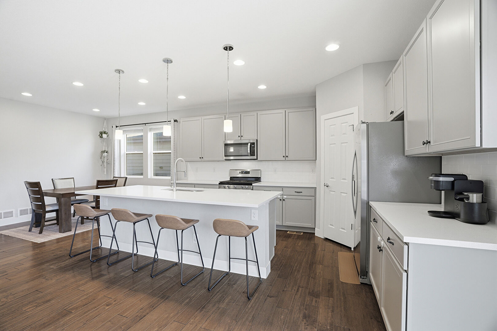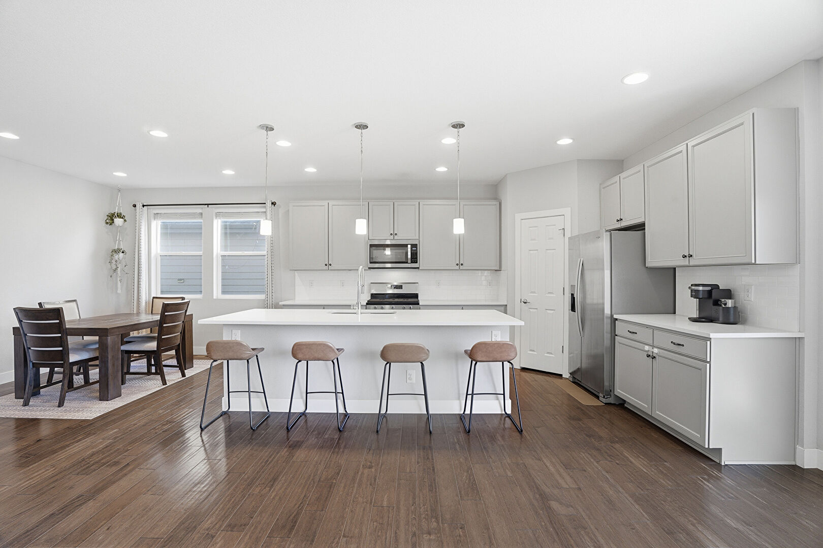 Baseboards Wall, Drywall, Gray Cabinets, Kitchen Bar, Kitchen Island, L Shaped Kitchen, Natural Light, Opens To Living Area, Pendant Lighting, Recessed Lighting, Shaker Cabinets, Stone Countertops, Wood Finish Floor, Baseboards Wall, Drywall, Kitchen Island, Pendant Lighting, Stone Countertops