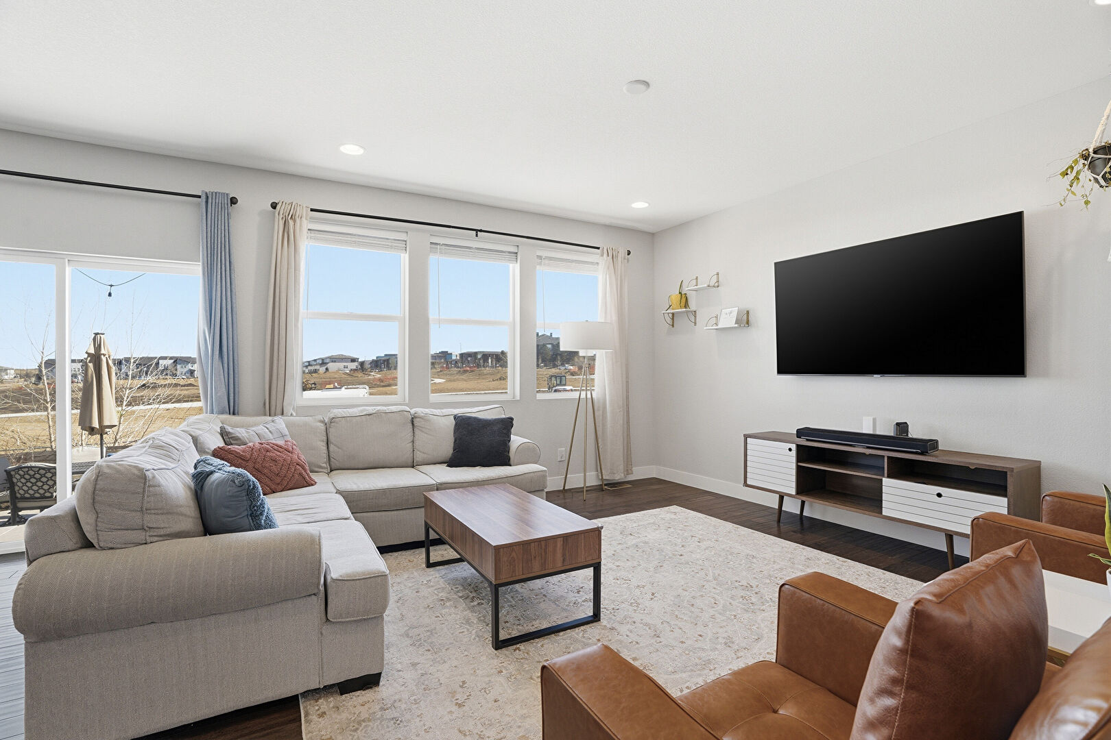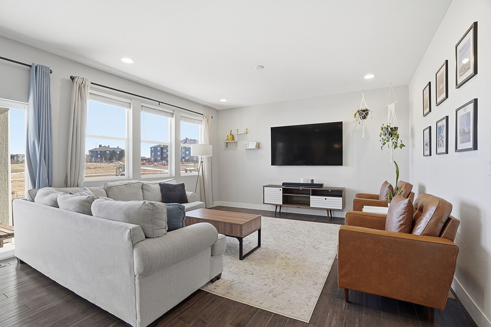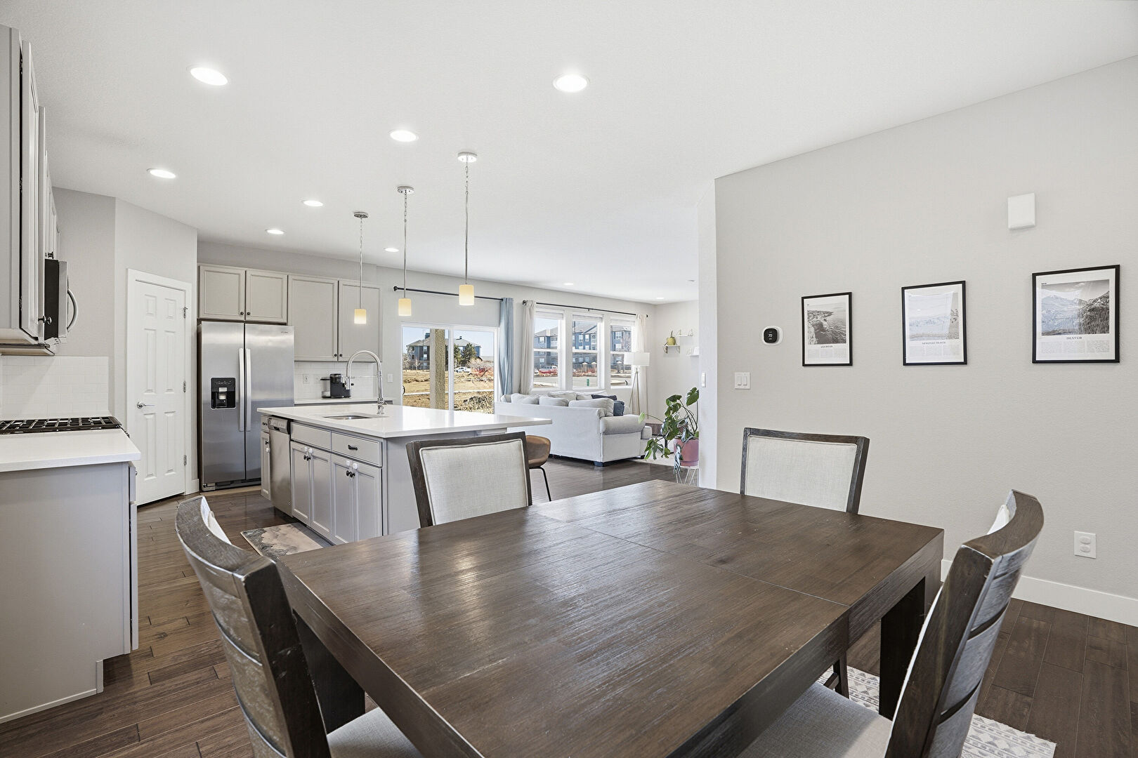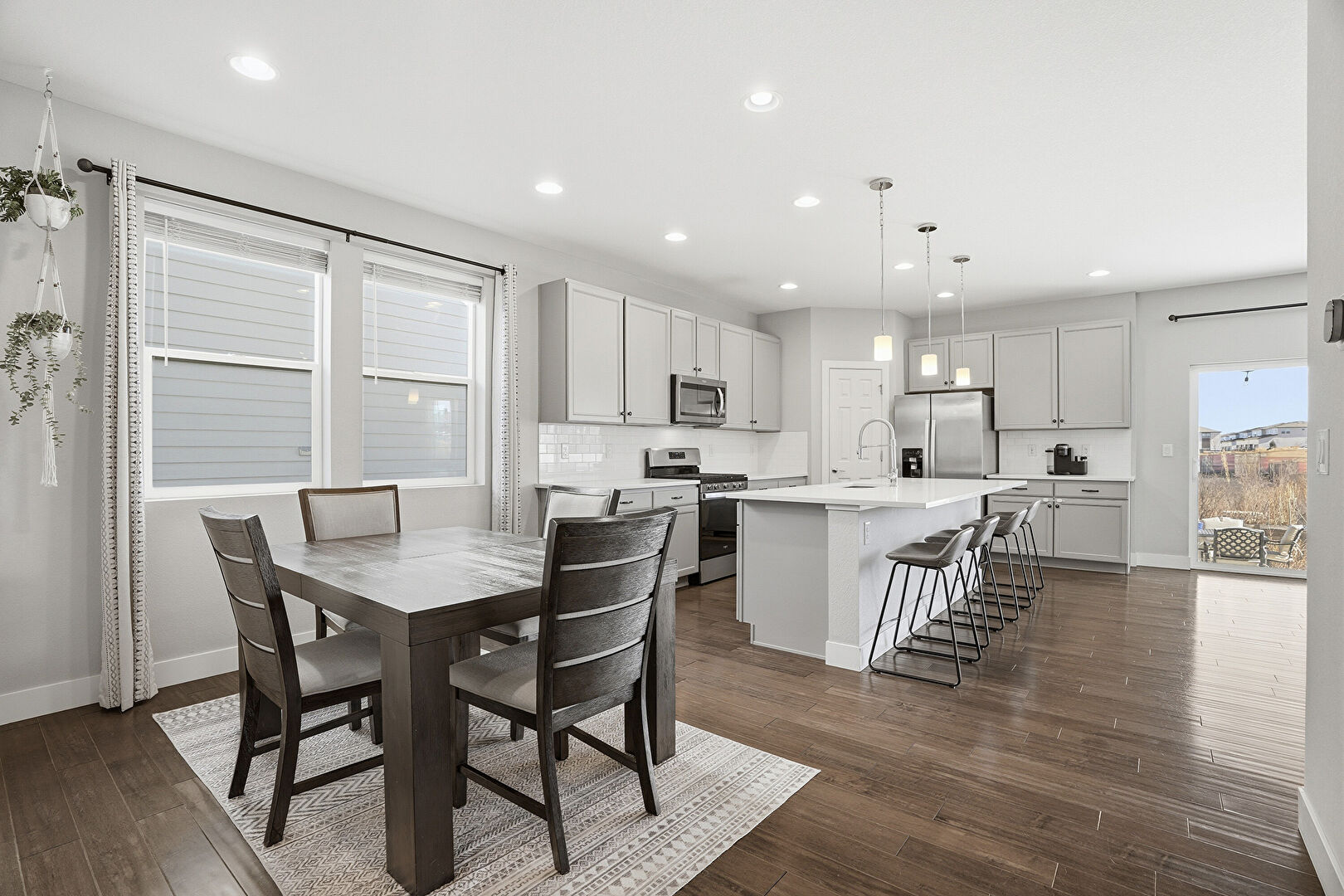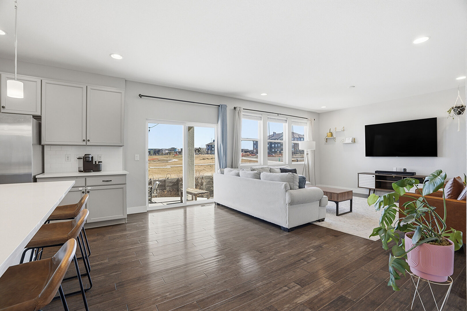 Baseboards Wall, Drywall, Gray Cabinets, Kitchen Bar, Kitchen Island, L Shaped Kitchen, Natural Light, Opens To Living Area, Pendant Lighting, Recessed Lighting, Shaker Cabinets, Stone Countertops, Wood Finish Floor, Baseboards Wall, Drywall, Kitchen Island, Pendant Lighting, Stone Countertops
