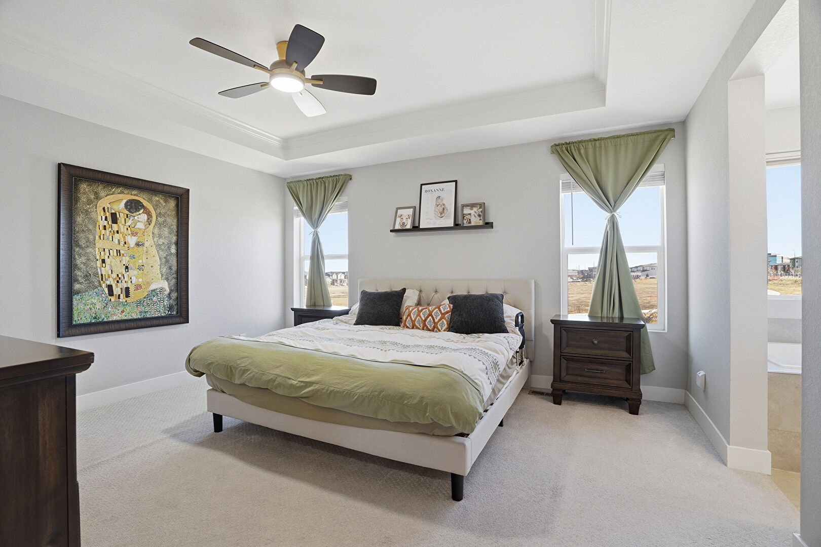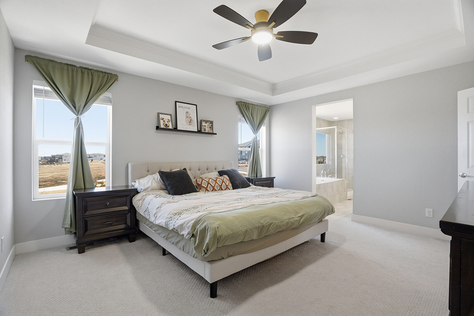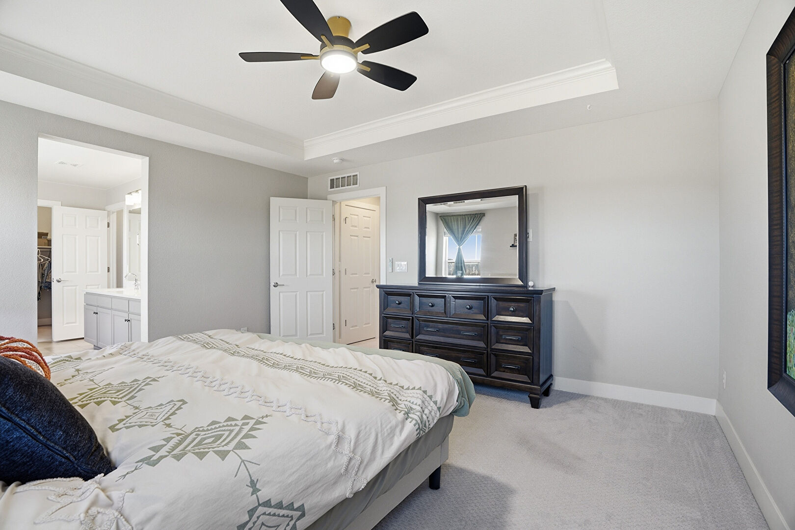 Baseboards Wall, Carpet, Ceiling Fan, Crown Molding, Drywall, Ensuite Bathroom, Natural Light, Tray Ceiling, Vent, Baseboards Wall, Carpet, Walk In Closet