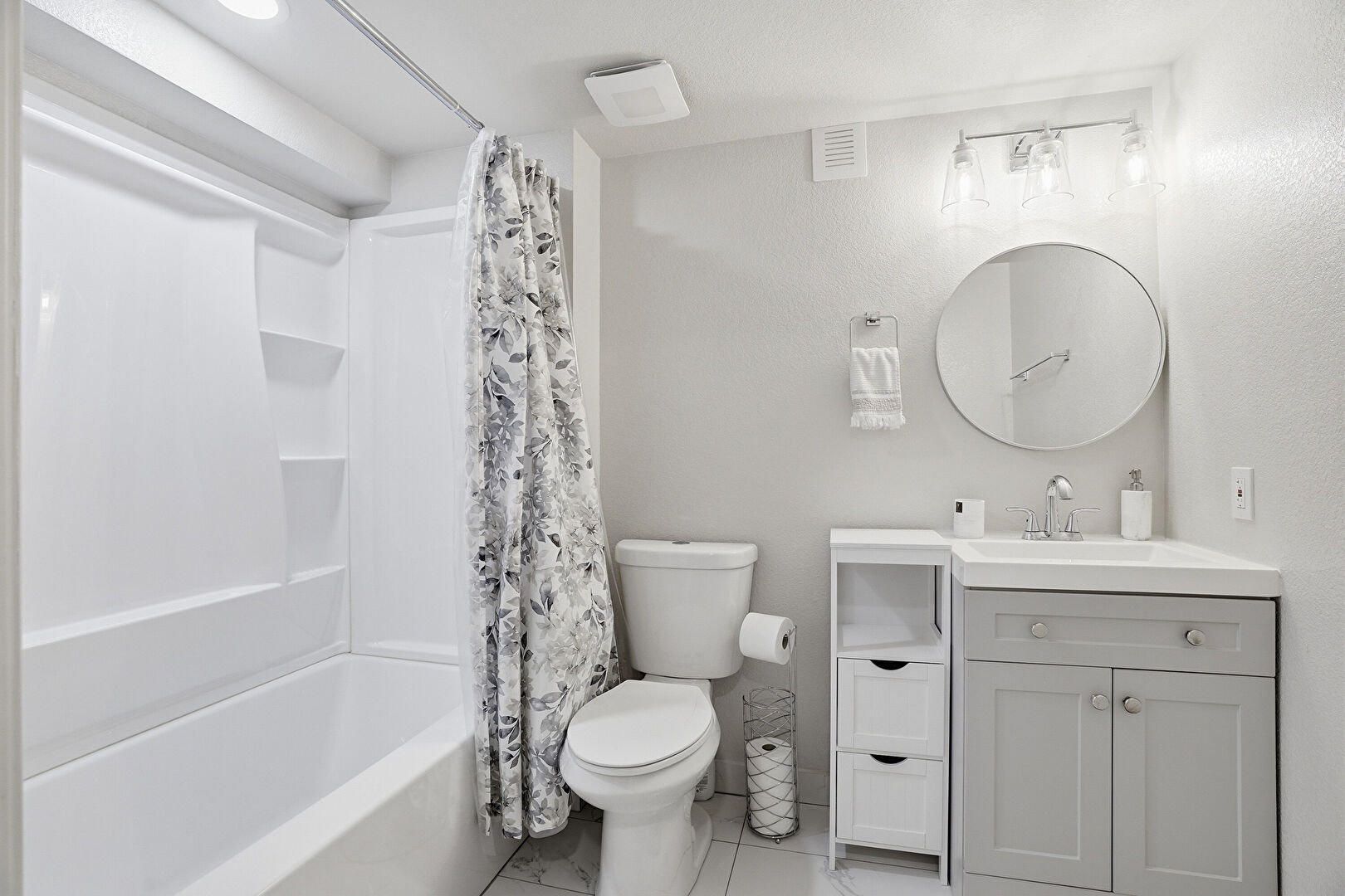 Baseboards Wall, Combined Bath Shower, Drywall, Full Bathroom, Half Bathroom, Marble Finish Floor, Recessed Lighting, Textured Wall, Vanity, Vent, Wood Finish Floor, Double Vanity, Full Bathroom, Natural Light