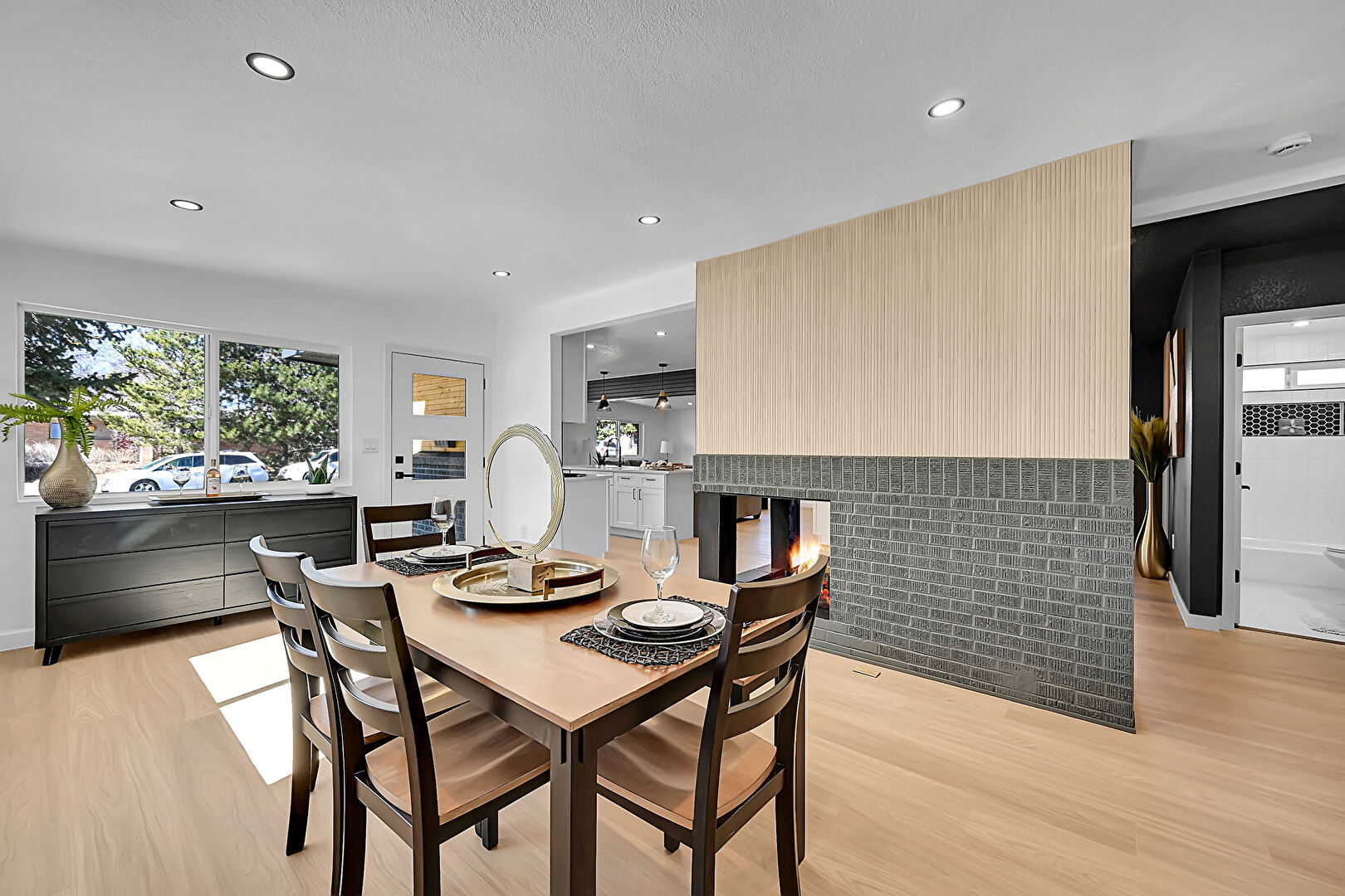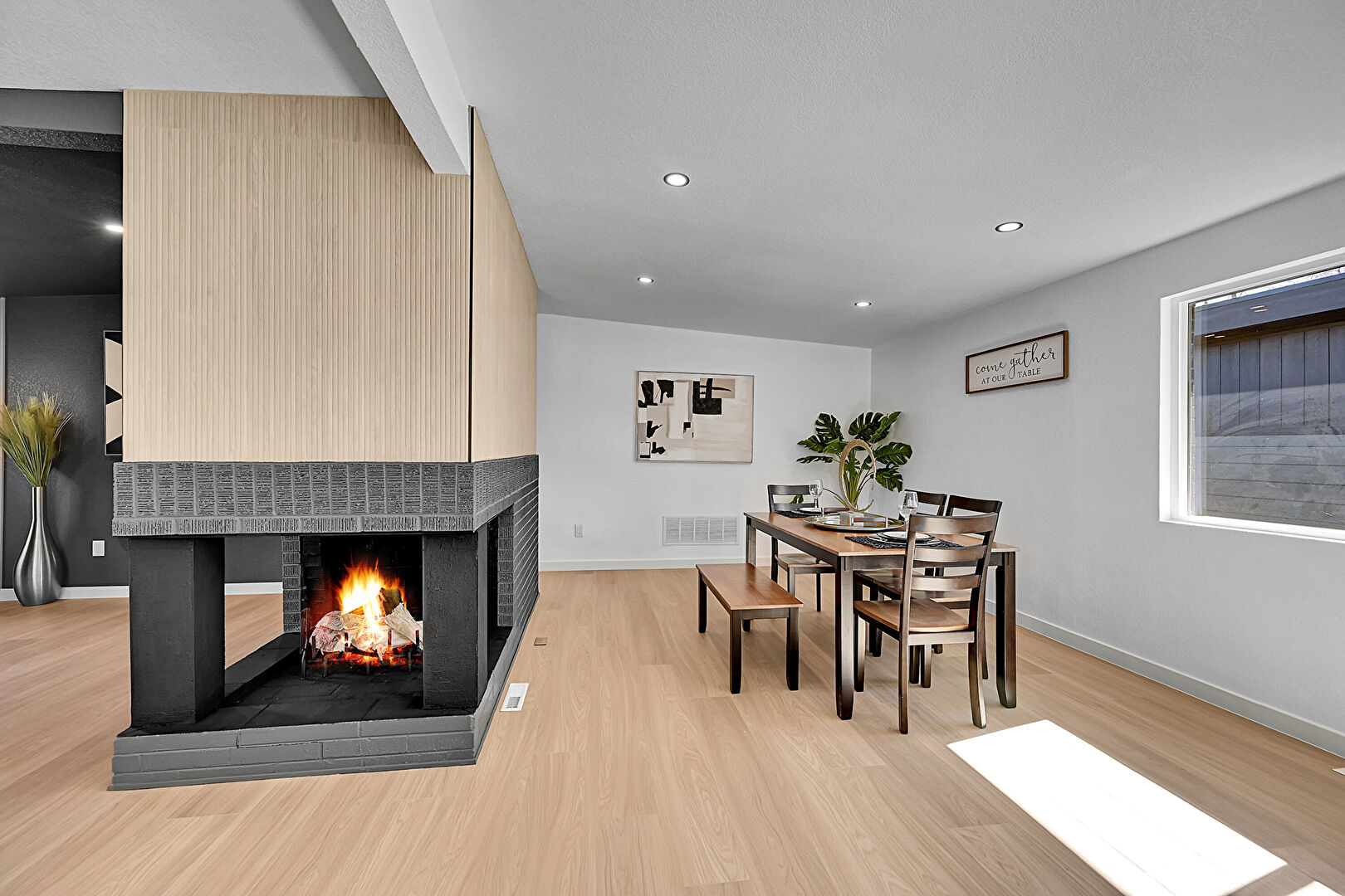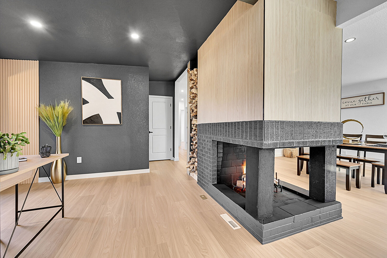 Accent Wall, Baseboards Wall, Fireplace, Natural Light, Office Area, Recessed Lighting, Textured Ceiling, Textured Wall, Vent, Wood Finish Floor, Baseboards Wall, Drywall, Natural Light, Textured Ceiling, Textured Wall