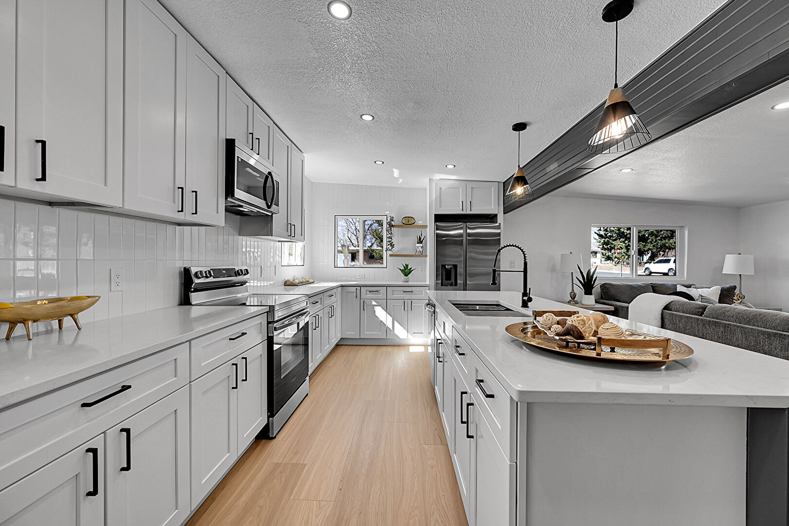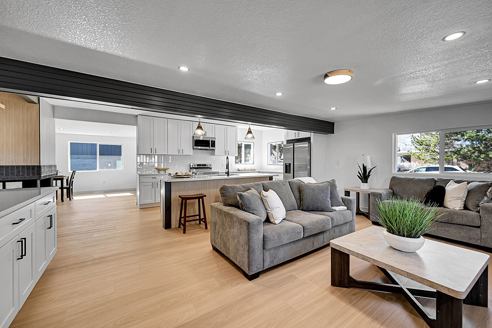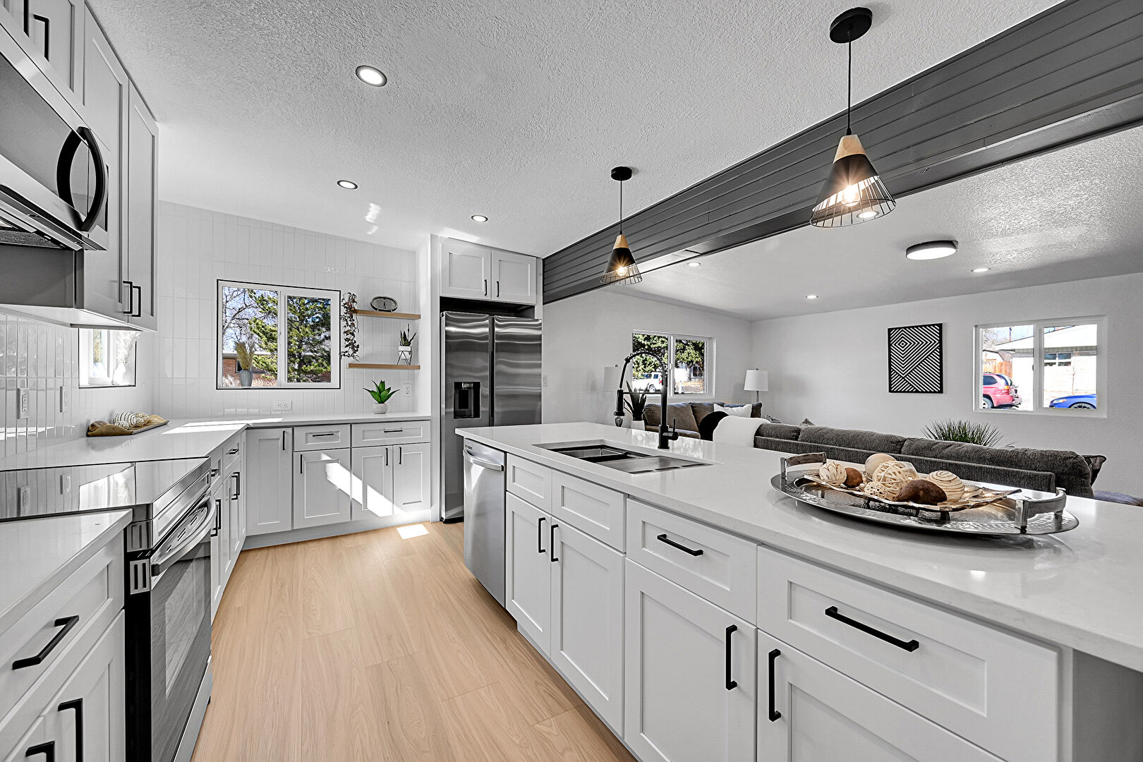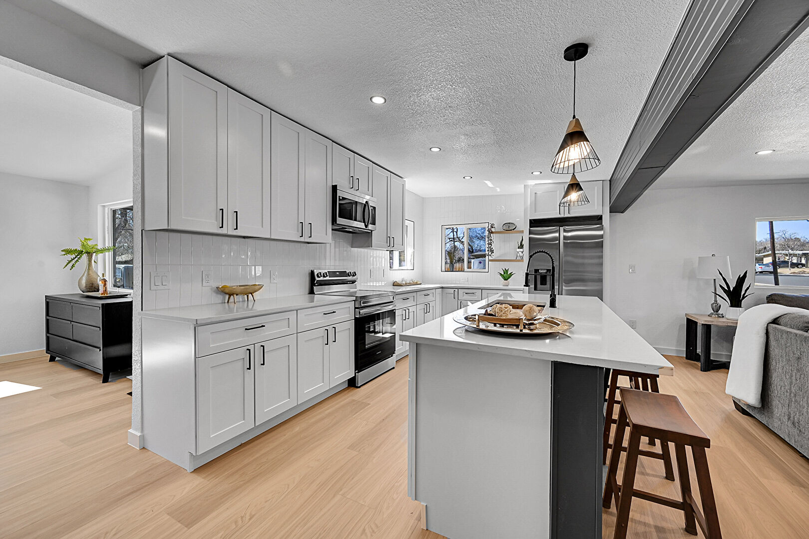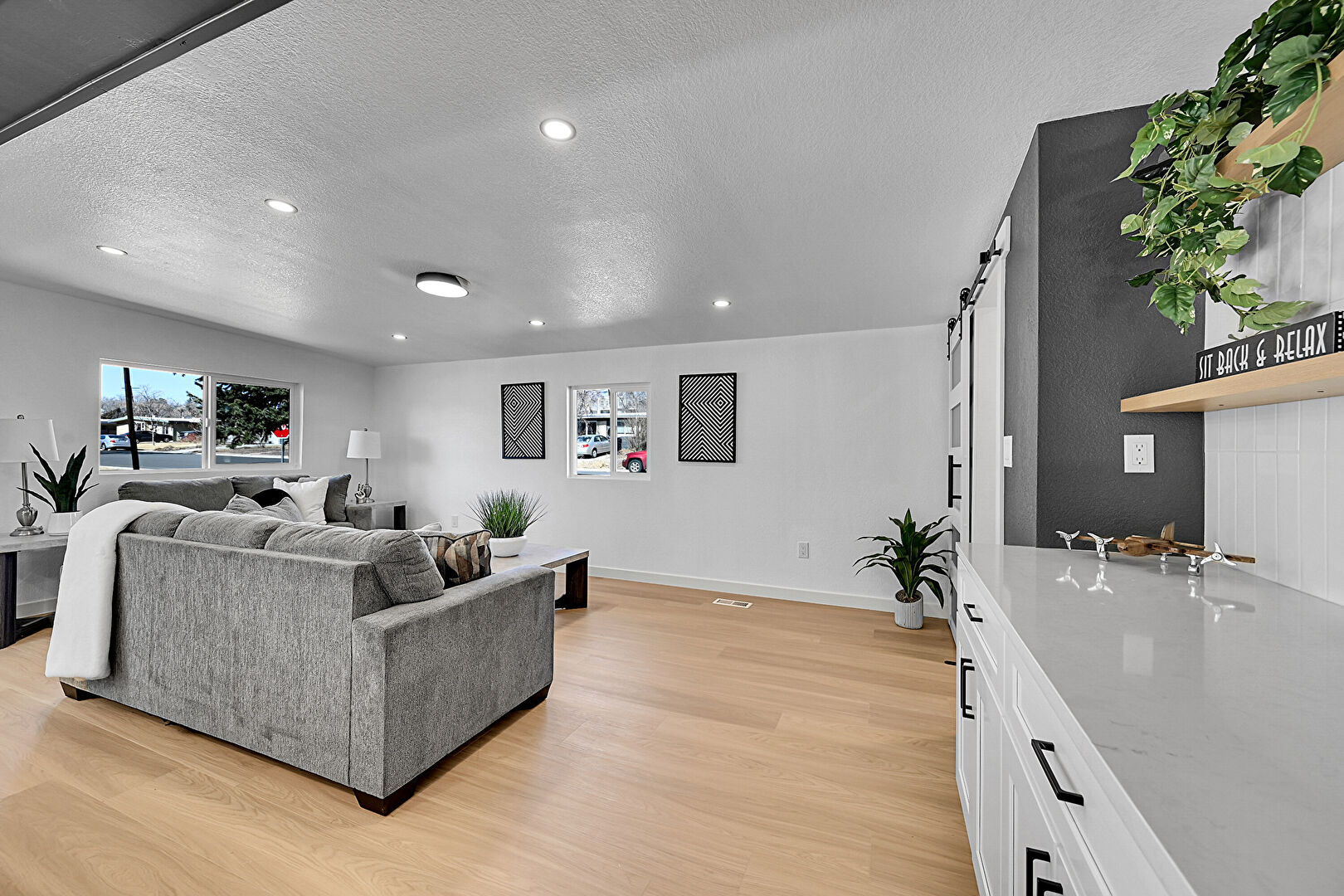 Barn Door, Baseboards Wall, Drywall, Fireplace, Kitchen Bar, Kitchen Island, L Shaped Kitchen, Natural Light, Open Shelves, Opens To Living Area, Pendant Lighting, Recessed Lighting, Shaker Cabinets, Stone Countertops, Textured Ceiling, Wood Finish Floor, Open Shelves, Opens To Living Area, Pendant Lighting, Stone Countertops, Textured Ceiling