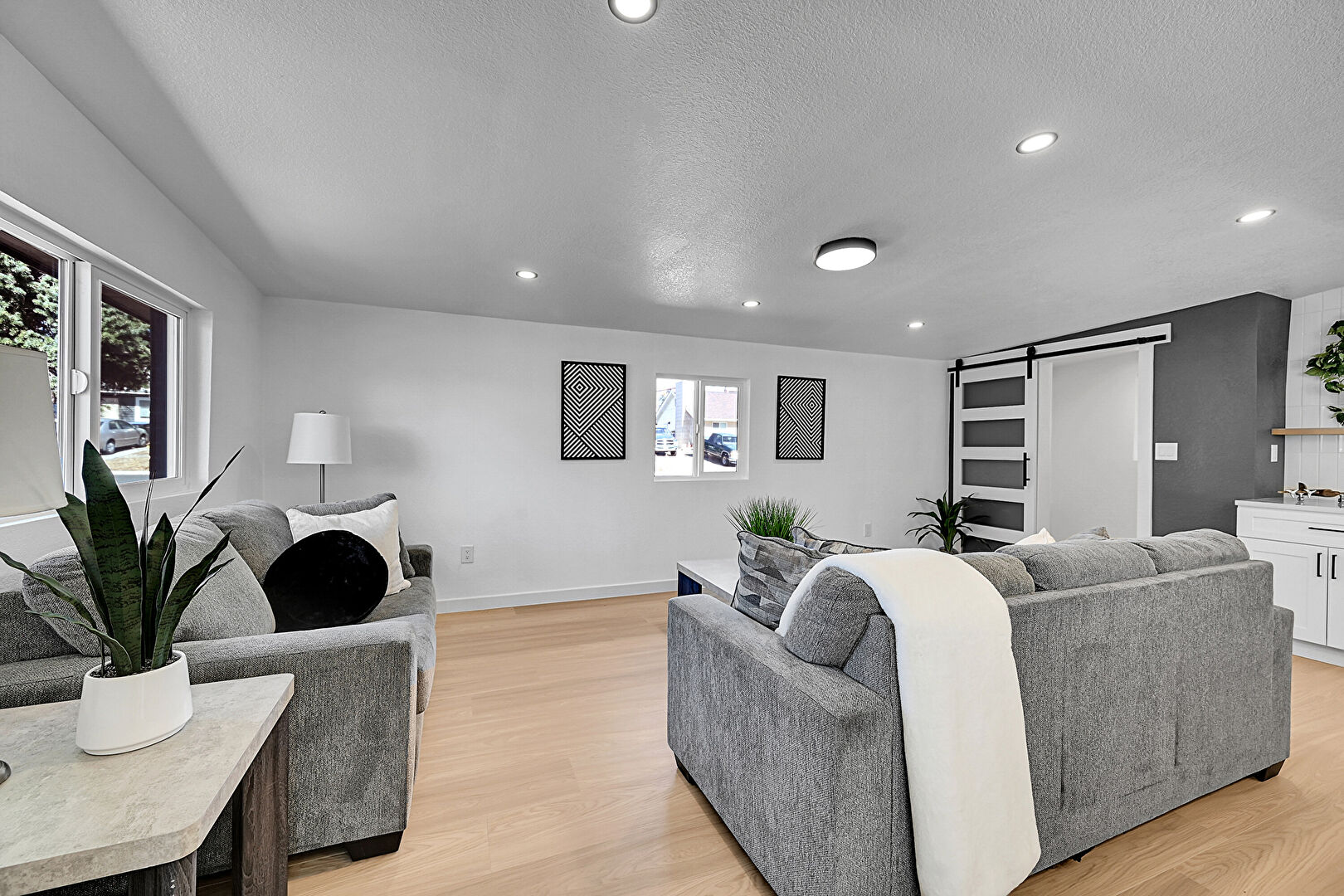Barn Door, Baseboards Wall, Beamed Ceiling, Drywall, Natural Light, Recessed Lighting, Textured Ceiling, Vent, Wood Finish Floor, Baseboards Wall, Drywall, Natural Light, Recessed Lighting, Wood Finish Floor