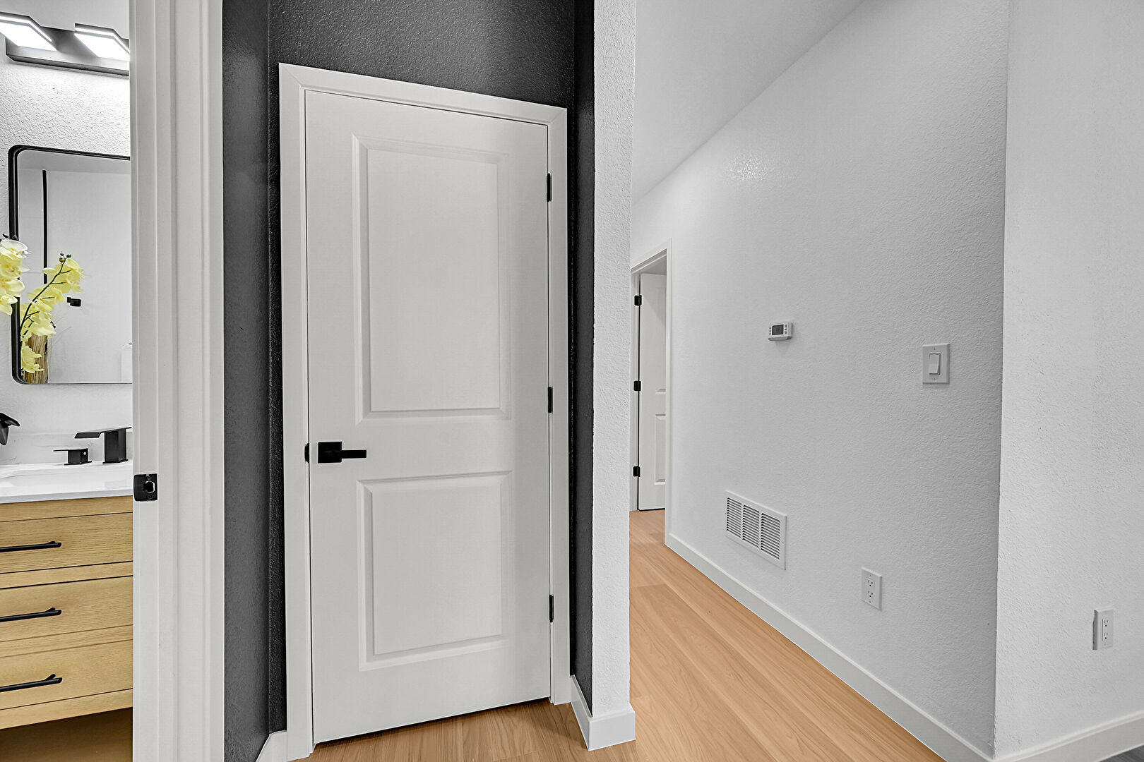 Baseboards Wall, Drywall, Natural Light, Textured Ceiling, Vent, Wood Finish Floor, Barn Door, Baseboards Wall