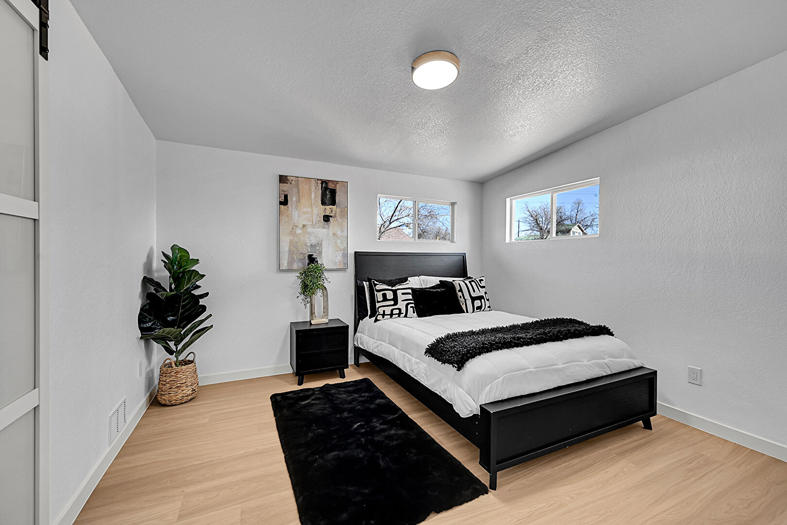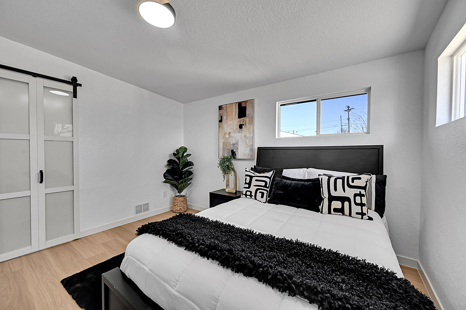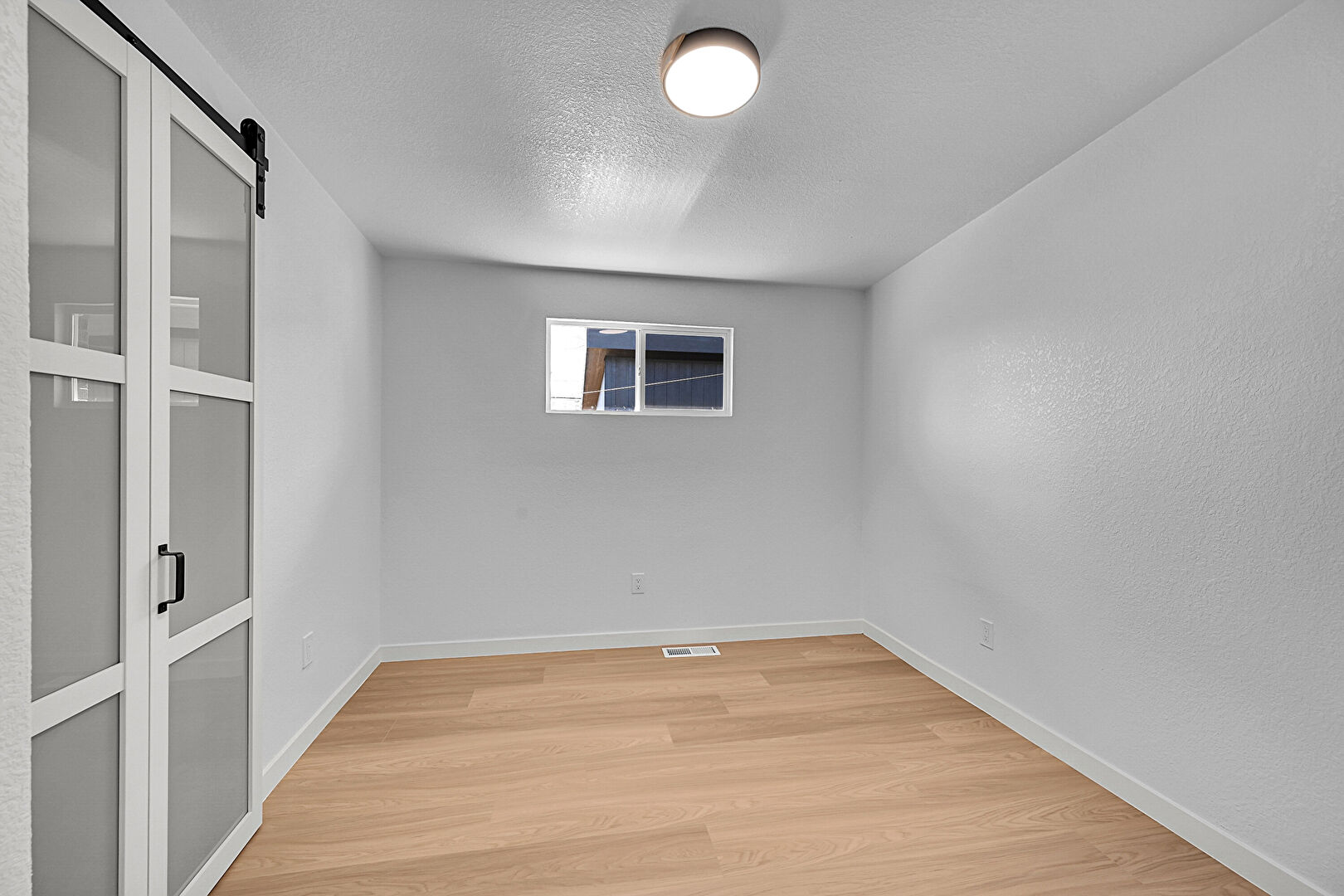 Barn Door, Baseboards Wall, Drywall, Natural Light, Textured Ceiling, Textured Wall, Vent, Wood Finish Floor, Barn Door, Wood Finish Floor