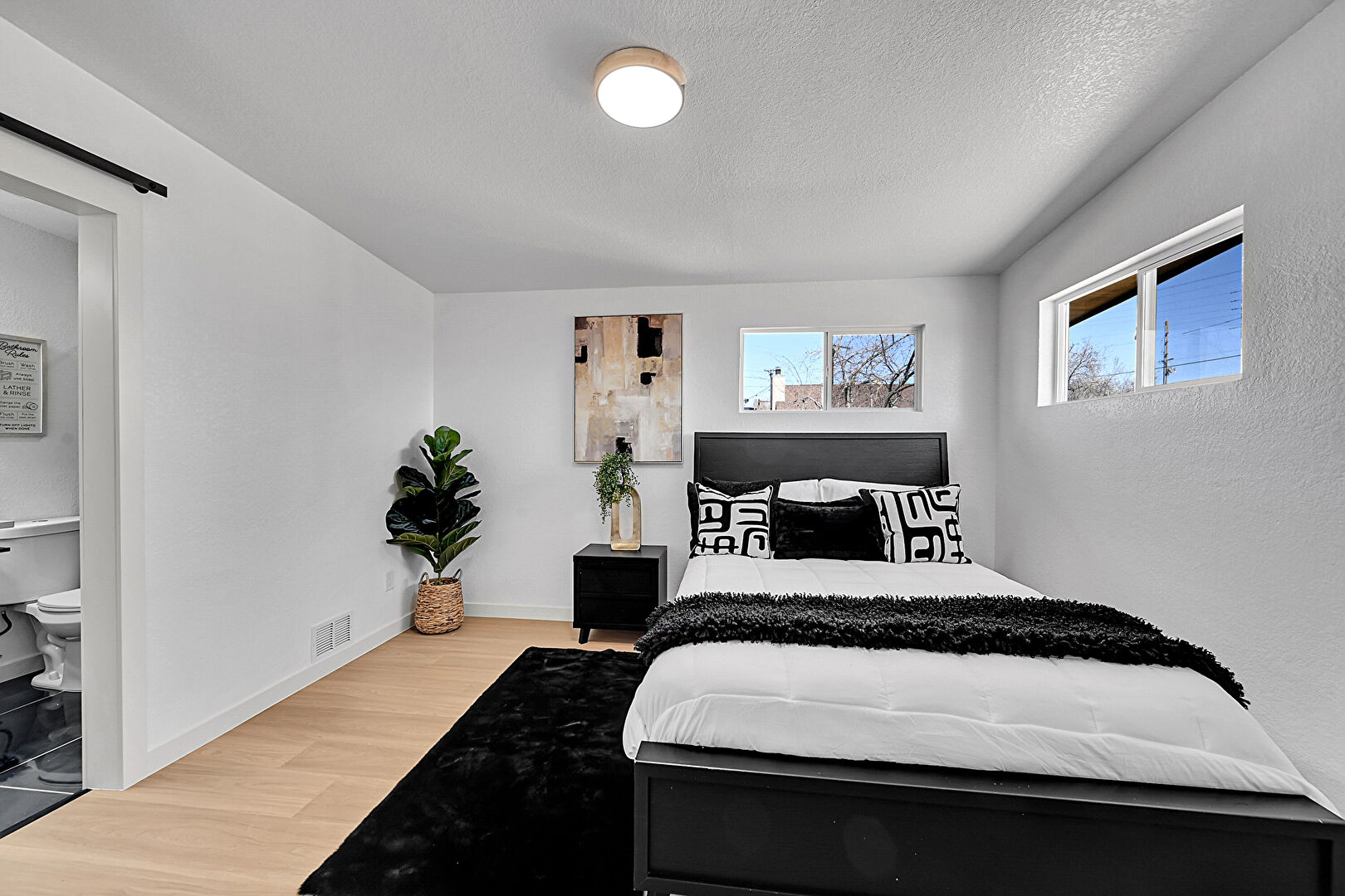 Barn Door, Baseboards Wall, Closet, Drywall, Ensuite Bathroom, Natural Light, Textured Ceiling, Textured Wall, Vent, Wood Finish Floor, Baseboards Wall, Natural Light, Textured Ceiling, Vent