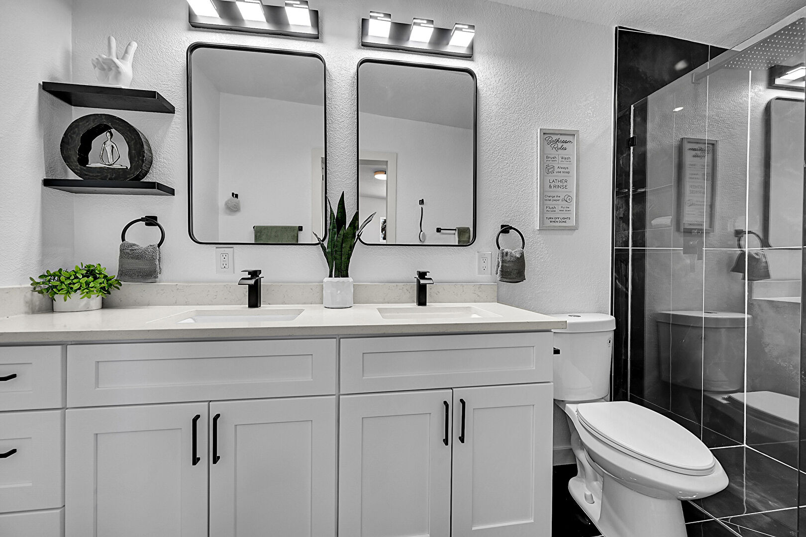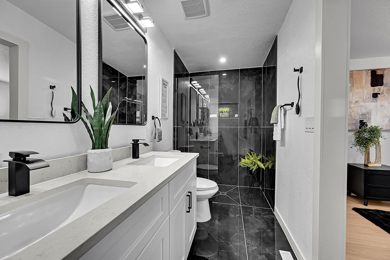 Baseboards Wall, Double Vanity, Full Bathroom, Marble Finish Floor, Textured Wall, Vent, Textured Ceiling
