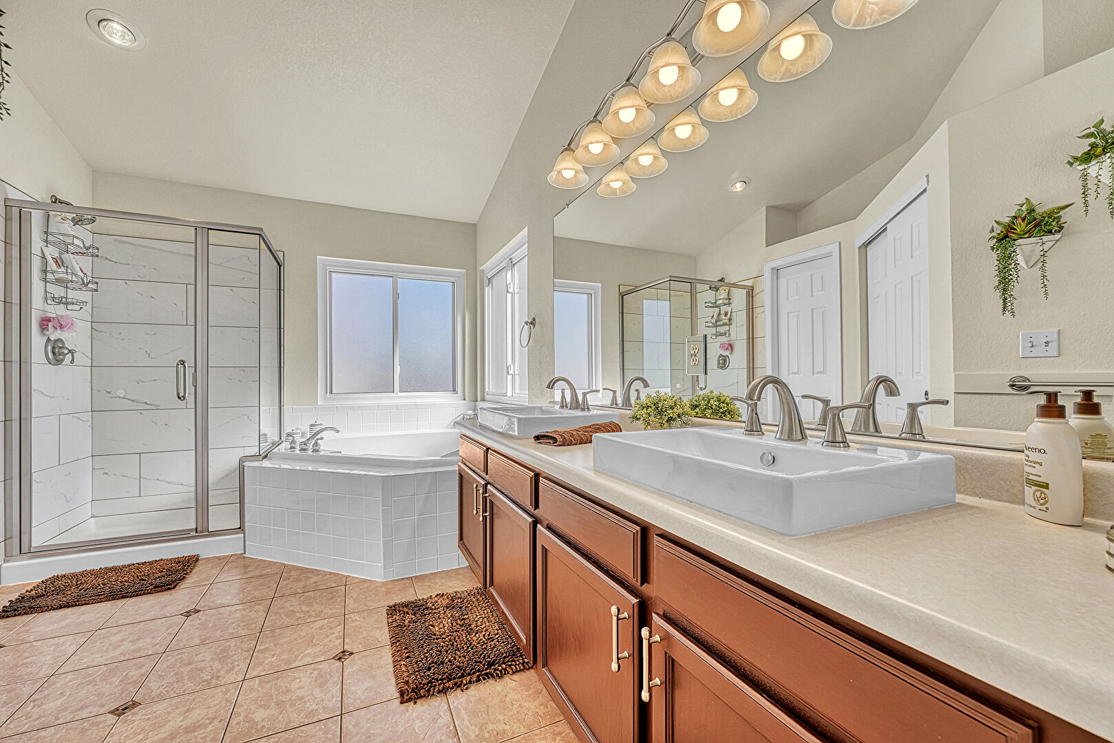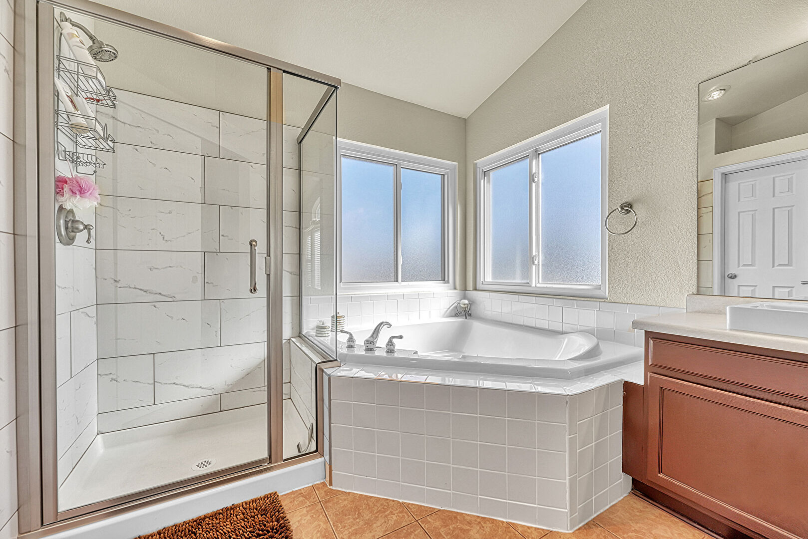 Drywall, Full Bathroom, Natural Light, Recessed Lighting, Textured Wall, Tile Floor, Vaulted Ceiling, Double Vanity, Vanity
