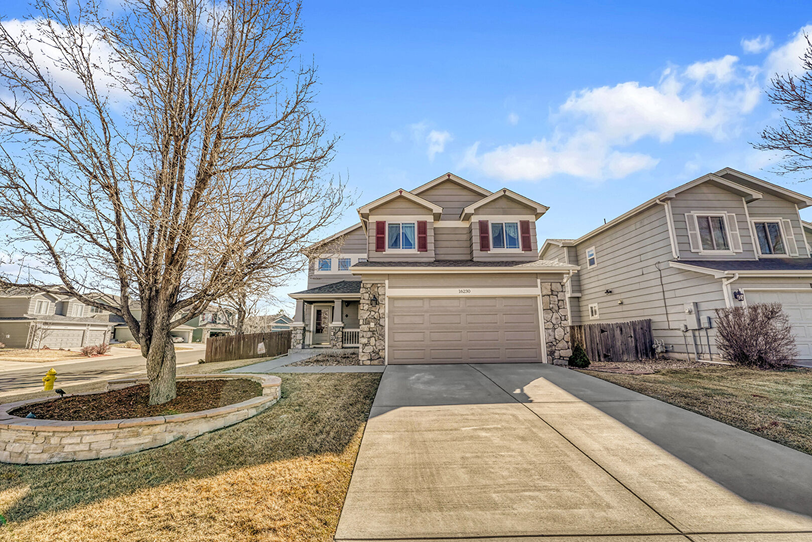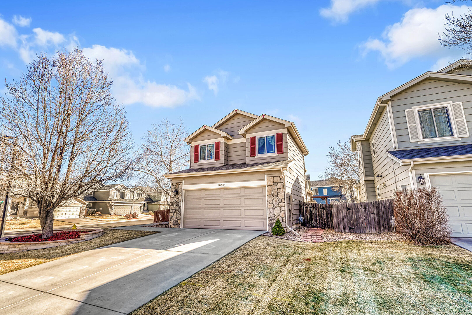 Built In Garage, Downspout, Fence, Gutters, Horizontal Siding, Porch, Stone Siding, Driveway