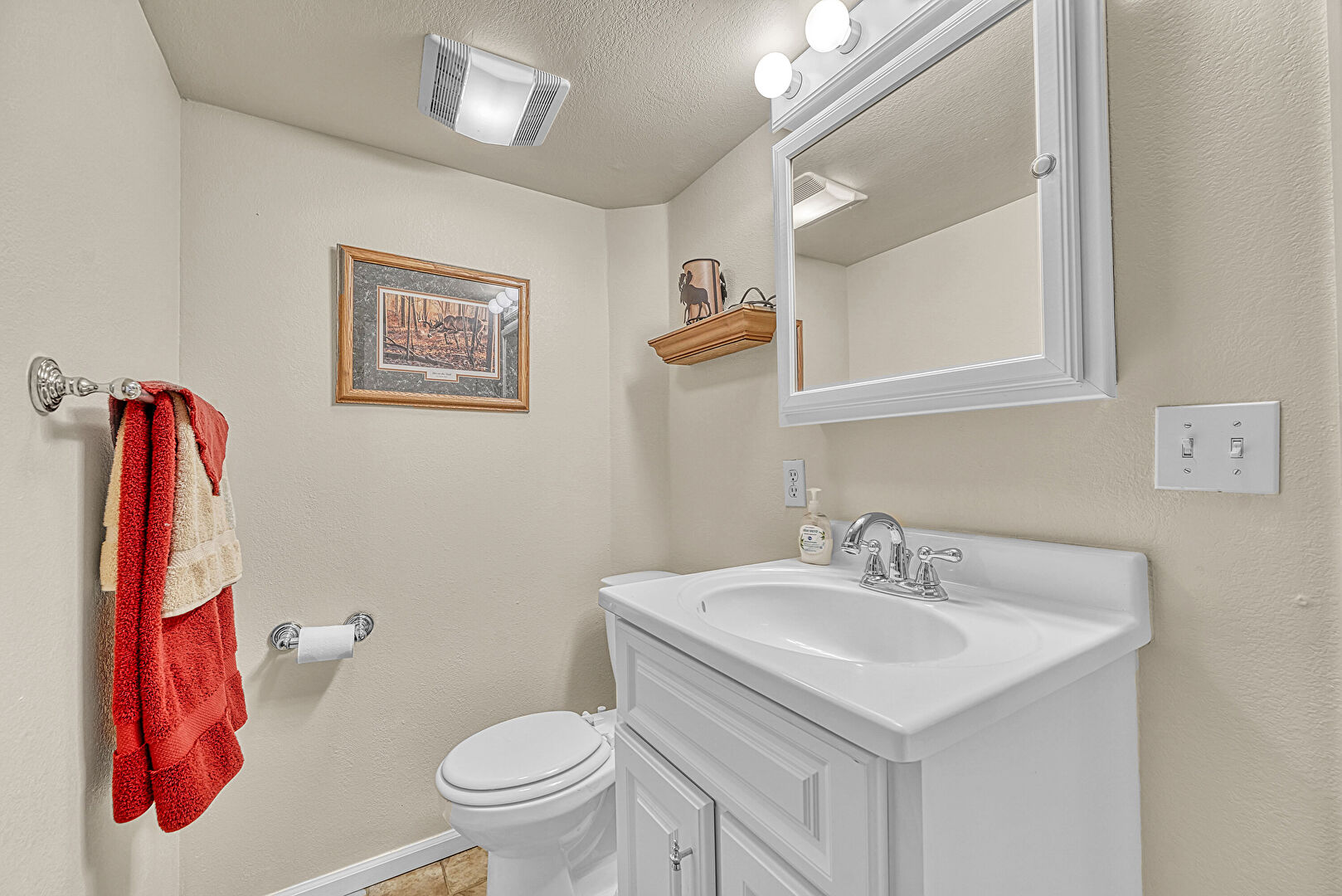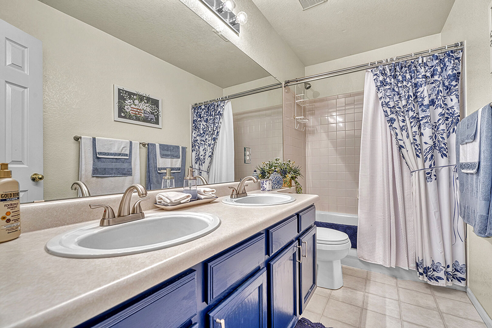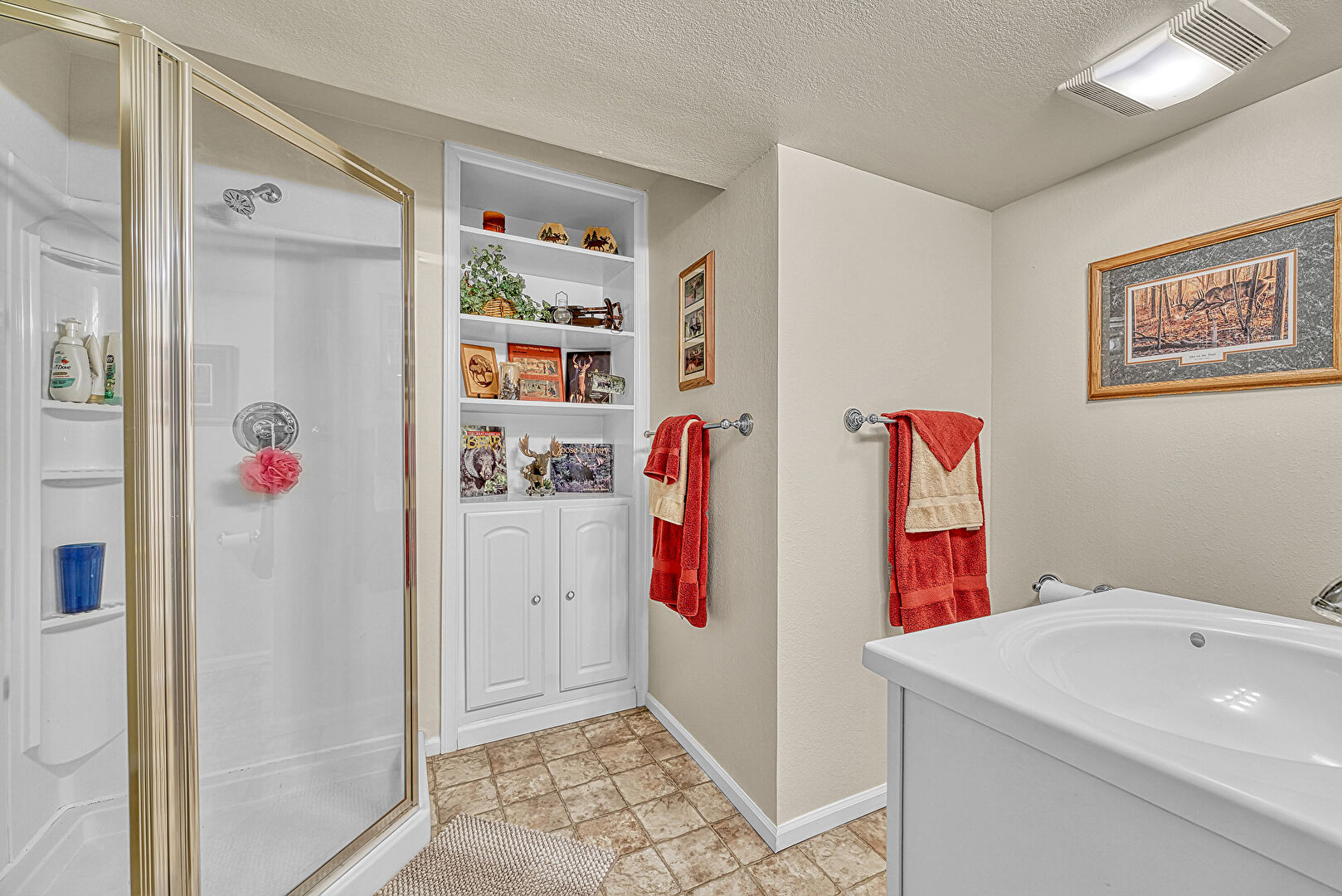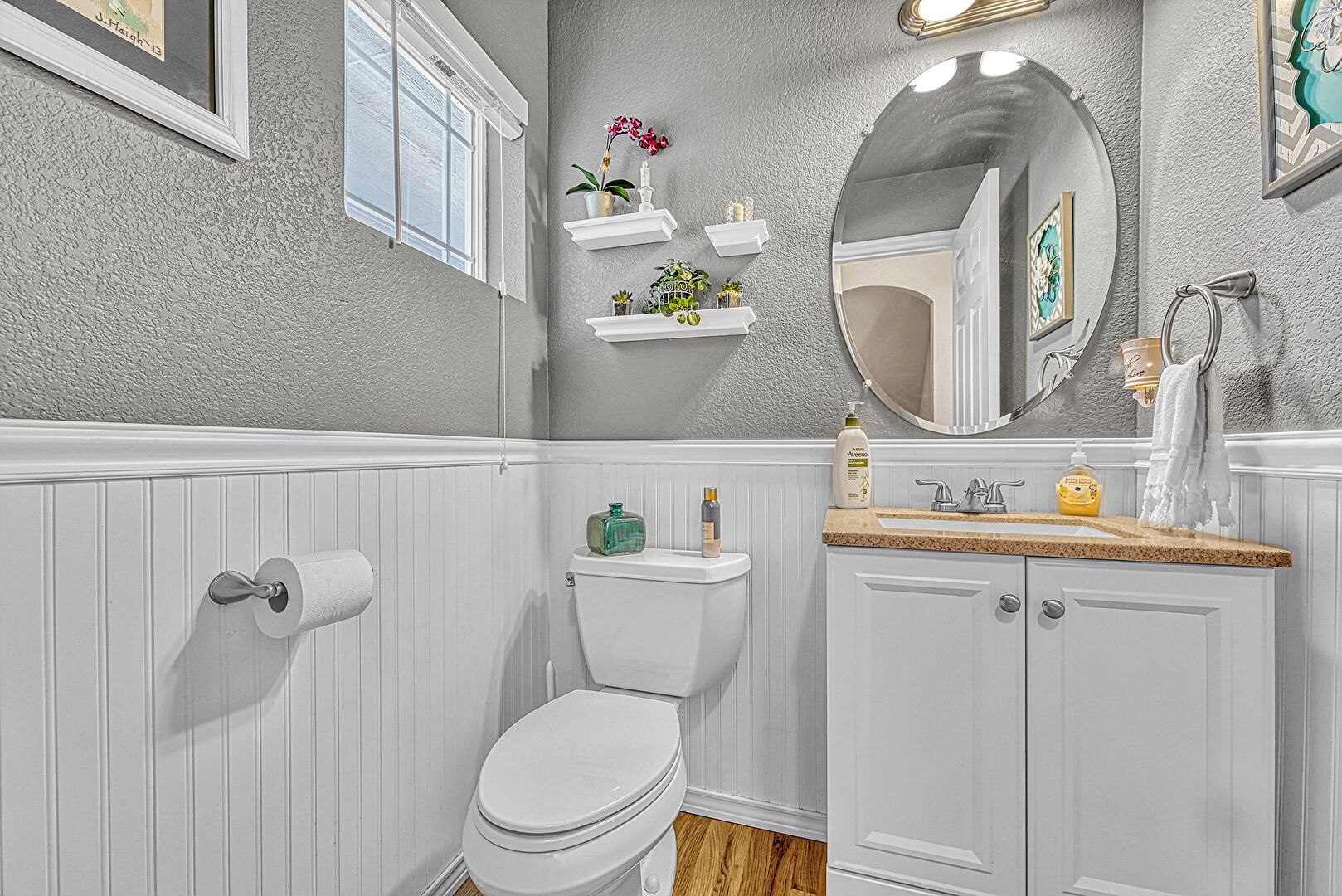 Baseboards Wall, Closet, Combined Bath Shower, Double Vanity, Drywall, Full Bathroom, Half Bathroom, Natural Light, Textured Ceiling, Textured Wall, Tile Floor, Vanity, Vent, Wood Finish Floor, Half Bathroom, Textured Ceiling, Vent, Wainscot Wall