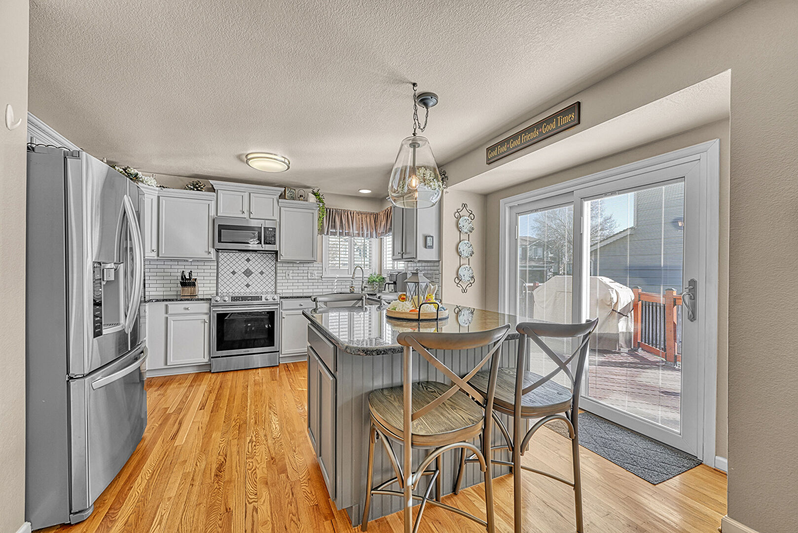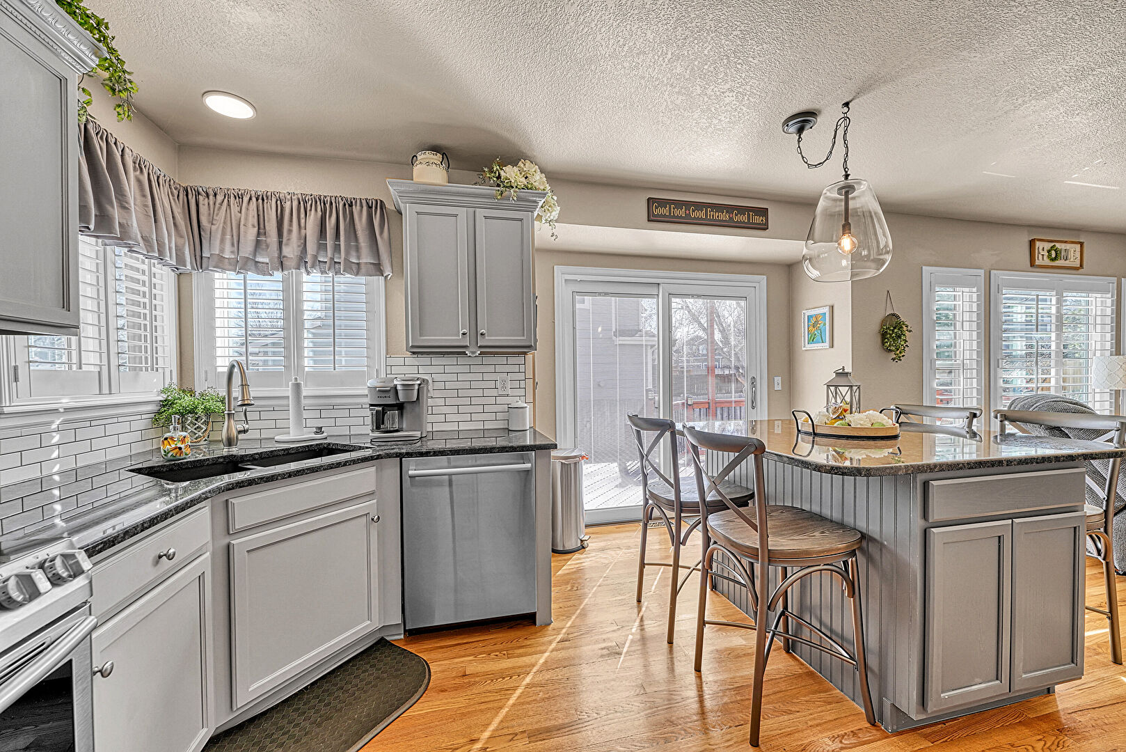 Baseboards Wall, Ceiling Fan, Crown Molding Cabinets, Drywall, Fireplace, Gray Cabinets, Kitchen Bar, Kitchen Island, Natural Light, Opens To Living Area, Pendant Lighting, Shaker Cabinets, Stone Countertops, Textured Ceiling, Wood Finish Floor, Drywall, Gray Cabinets, Kitchen Island, Natural Light